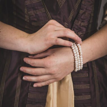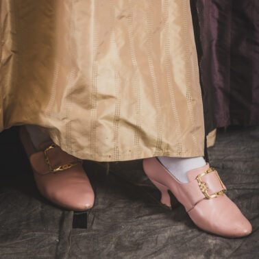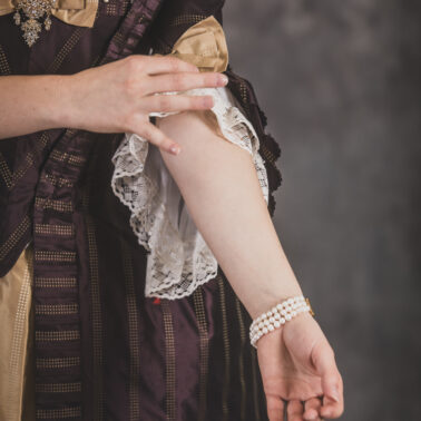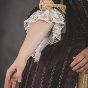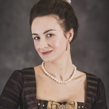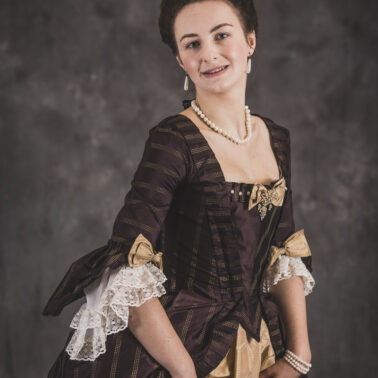 Suknia robe à la française (lub suknia francuska) była to formalna, bogato zdobiona suknia noszona na europejskich dworach arystokratycznych, której szczyt popularności przypadał na połowę XVIII wieku. Szczególnym elementem sukni w stylu francuskim jest krój tyłu z tkaniną ułożoną w tzw. Le Plis Watteau, swobodnie spływającą po sylwetce, aby utworzyć wyjątkowy tren. Robe a la francaise osiadała obszerną spódnicę opartą na stelażu zwanym rogówką, lub, z francuskiego, „panier”, oraz zdobiony bawet – trójkątny staniczek elegancko domykający konstrukcję sukni z przodu, często przybrany broszką z kamieniami szlachetnymi. Zwieńczenie ubioru stanowią angażanty, obfite mankiety wykonane z delikatnych jedwabiów i koronek. Ukoronowanie uszytej z jedwabnej tafty sukni stanowi perłowa biżuteria i charakterystycznie ufryzowane, uniesione do góry włosy. Wykrój opracowany na podstawie zbiorów London Museum datowanych na okres 1740-1750.