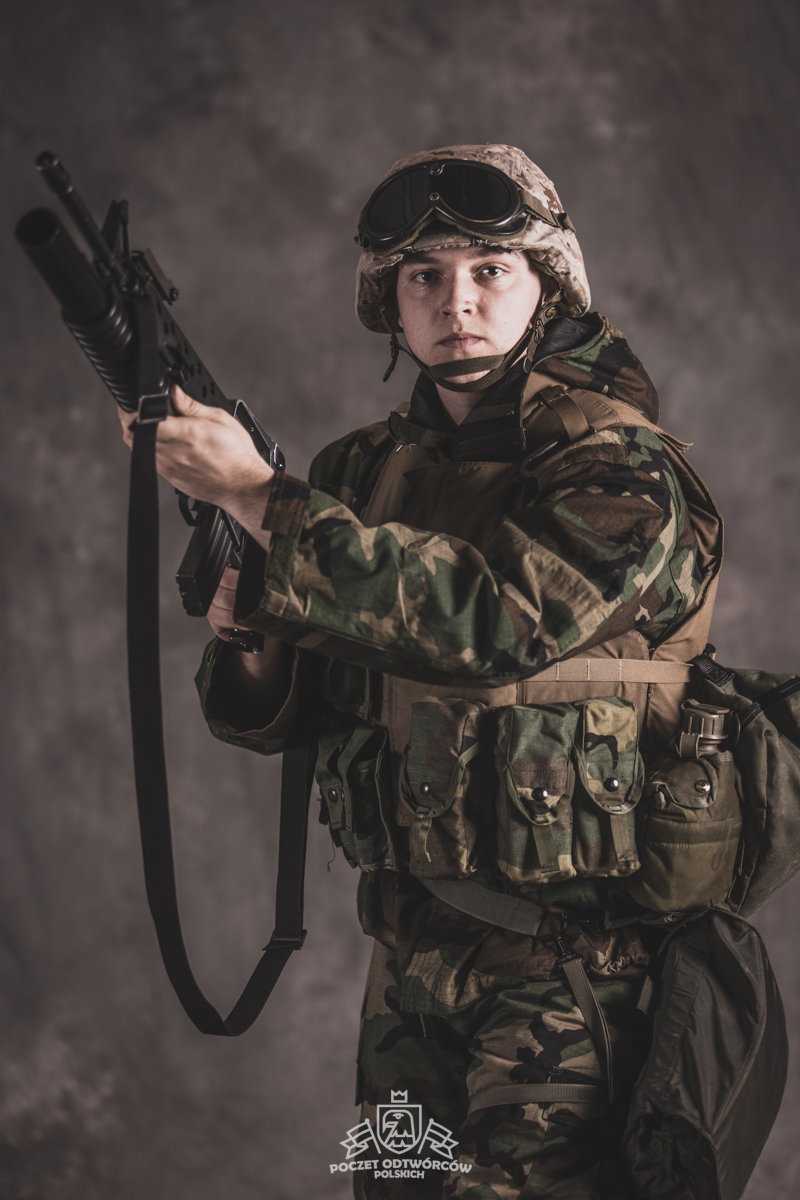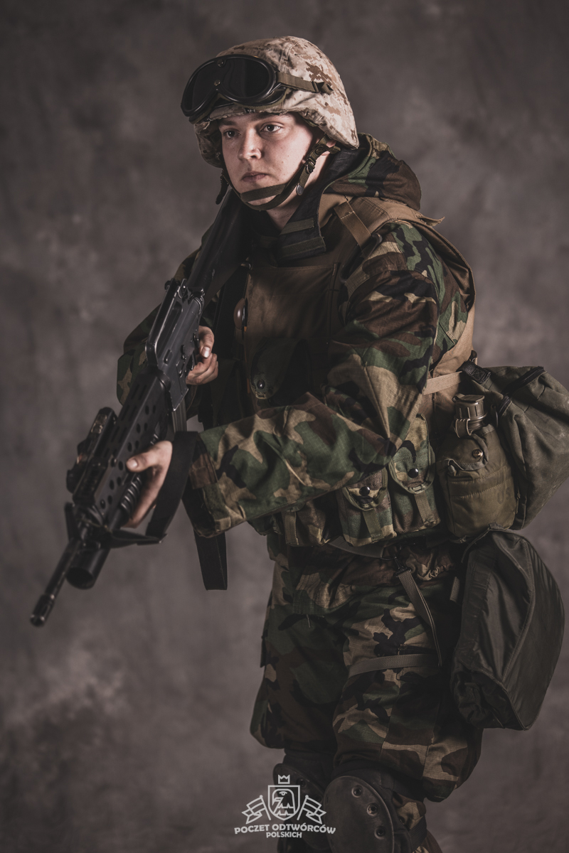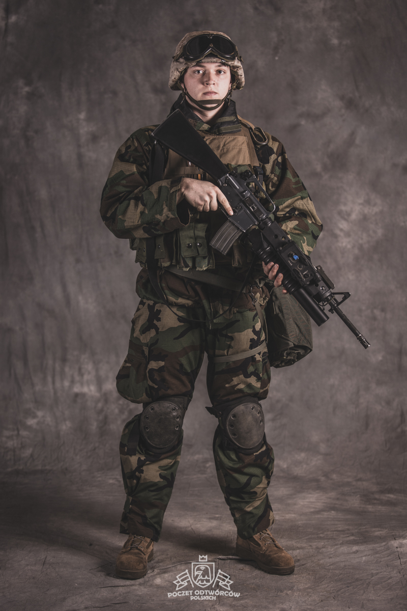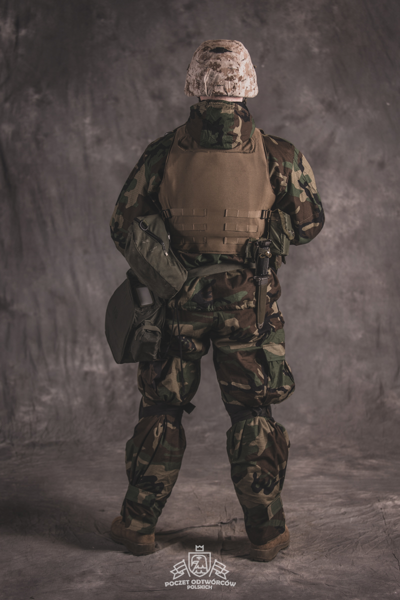 Podstawą widocznego wyposażenia stanowią buty Belleville 590, mundur DCU (Desert Combat Uniform) w trójkolorowym pustynnym kamuflażu (3-color desert) oraz kombinezon chemiczny Saratoga (Saratoga MOPP Suit). Zestaw chemiczny obejmuje kombinezon składający się ze spodni i bluzy, maskę przeciwgazową M40 w torbie, rękawice chemiczne oraz buty chemiczne. Rękawice i buty najczęściej noszono w kieszeniach, torbach czy też plecakach. Hełm pochodzi z systemu PASGT i został wyposażony w dwustronny pokrowiec w kamuflażu MARPAT (popularny był również pokrowiec w trójkolorowym kamuflażu pustynnym), gogle ochronne SWD (Sun Wind Dust), montaż pod noktowizor oraz znacznik widzialny w zakresie podczerwieni. Podstawową kamizelką ochronną zdolną do przenoszenia płyt SAPI w tym okresie jest IBA (Interceptor Body Armor), występująca w dwóch kolorach: kamuflażu leśnym (woodland) oraz jasnego brązu (coyote brown). Marines z 7 pułku najczęściej byli wyposażeni w pokrowce na hełm w kamuflażu MARPAT oraz kamizelki IBA w kolorze coyote brown. Na kamizelce można zauważyć podwójne i pojedyncze ładownice na magazynki do M16, ładownice na granaty 40mm do granatnika, ładownice na granaty odłamkowe M67 w systemie MOLLE I generacji, manierki 1 kwartowe w pokrowcach, apteczkę pierwszej pomocy (IFAK) z systemu ALICE, pokrowiec na noktowizor oraz nóż bojowy KA-BAR. Często noszono również dodatkowe elementy wyposażenia, takie jak widoczna łyżka z racji żywnościowej, długopisy oraz karabińczyk. Marines podczas inwazji mieli do czynienia z walkami w miastach, dlatego często noszono nakolanniki ochronne ówczesnych firm, np. Alta. Po zdobyciu stolicy kraju – Bagdadu, częściej noszono plecaki, jak widoczny na zdjęciu plecak patrolowy (patrol pack) z systemu MOLLE I generacji, oraz kapelusz w kieszeni munduru do zakładania podczas odpoczynków. Całość wyposażenia dopełnia karabinek M16A2 z podwieszanym granatnikiem M203 oraz zamontowanym laserowym wskaźnikiem celu A/NPEQ2.