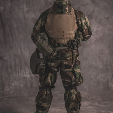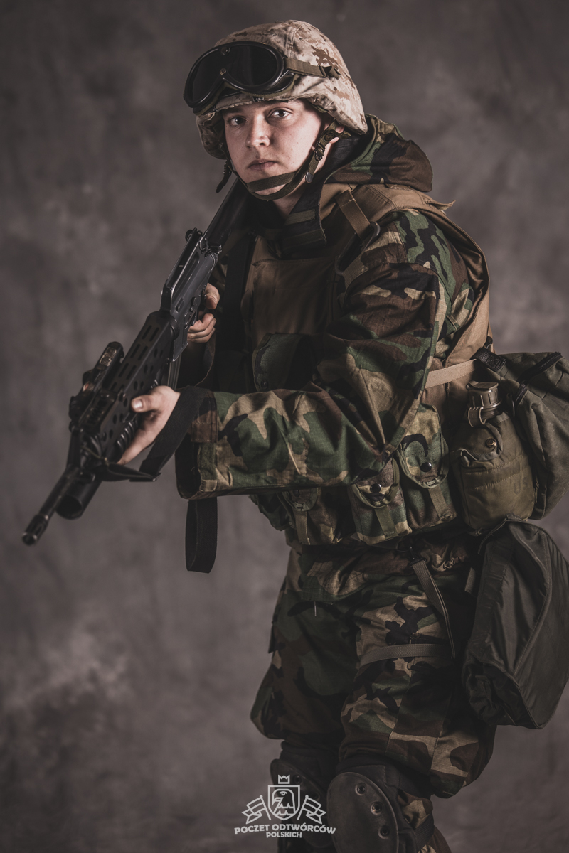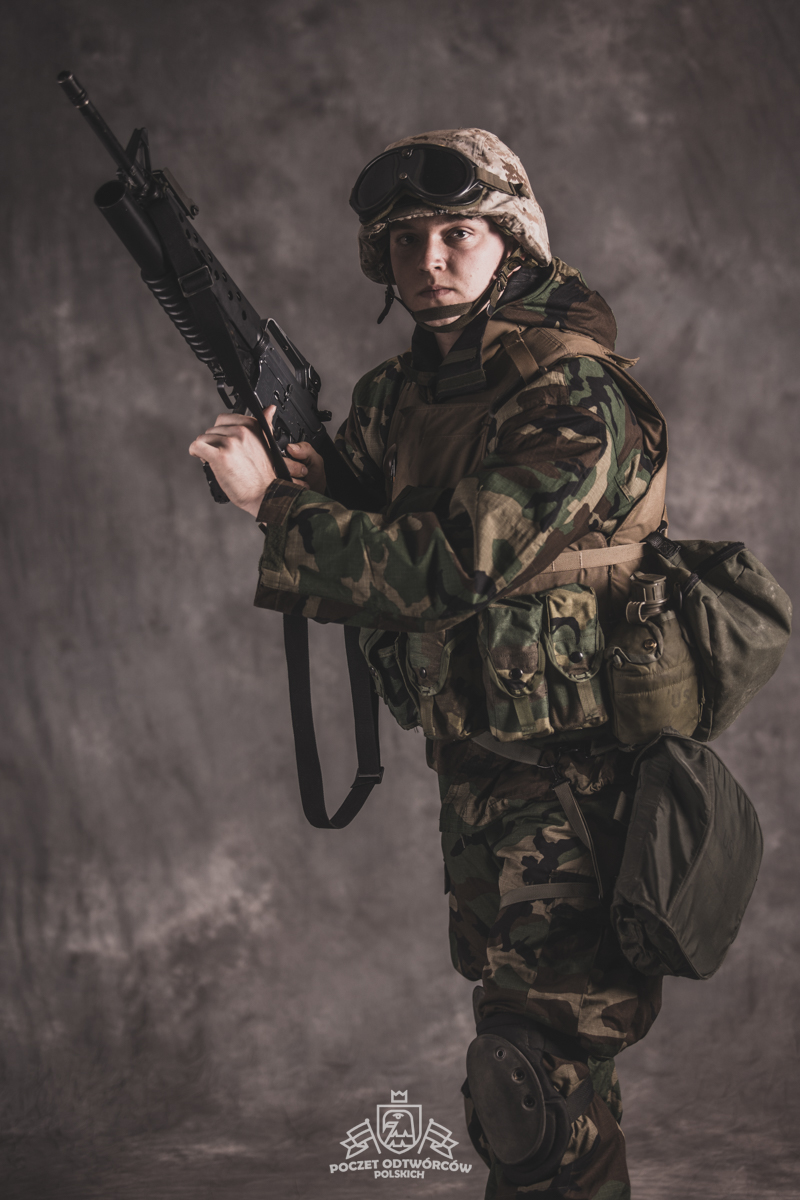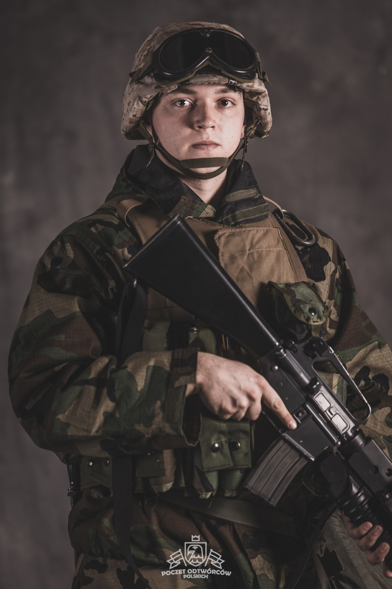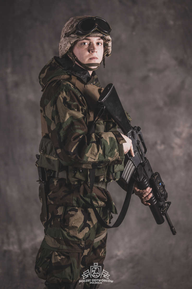 Podstawą widocznego wyposażenia stanowią buty Belleville 590, mundur DCU (Desert Combat Uniform) w trójkolorowym pustynnym kamuflażu (3-color desert) oraz kombinezon chemiczny Saratoga (Saratoga MOPP Suit). Zestaw chemiczny obejmuje kombinezon składający się ze spodni i bluzy, maskę przeciwgazową M40 w torbie, rękawice chemiczne oraz buty chemiczne. Rękawice i buty najczęściej noszono w kieszeniach, torbach czy też plecakach. Hełm pochodzi z systemu PASGT i został wyposażony w dwustronny pokrowiec w kamuflażu MARPAT (popularny był również pokrowiec w trójkolorowym kamuflażu pustynnym), gogle ochronne SWD (Sun Wind Dust), montaż pod noktowizor oraz znacznik widzialny w zakresie podczerwieni. Podstawową kamizelką ochronną zdolną do przenoszenia płyt SAPI w tym okresie jest IBA (Interceptor Body Armor), występująca w dwóch kolorach: kamuflażu leśnym (woodland) oraz jasnego brązu (coyote brown). Marines z 7 pułku najczęściej byli wyposażeni w pokrowce na hełm w kamuflażu MARPAT oraz kamizelki IBA w kolorze coyote brown. Na kamizelce można zauważyć podwójne i pojedyncze ładownice na magazynki do M16, ładownice na granaty 40mm do granatnika, ładownice na granaty odłamkowe M67 w systemie MOLLE I generacji, manierki 1 kwartowe w pokrowcach, apteczkę pierwszej pomocy (IFAK) z systemu ALICE, pokrowiec na noktowizor oraz nóż bojowy KA-BAR. Często noszono również dodatkowe elementy wyposażenia, takie jak widoczna łyżka z racji żywnościowej, długopisy oraz karabińczyk. Marines podczas inwazji mieli do czynienia z walkami w miastach, dlatego często noszono nakolanniki ochronne ówczesnych firm, np. Alta. Po zdobyciu stolicy kraju – Bagdadu, częściej noszono plecaki, jak widoczny na zdjęciu plecak patrolowy (patrol pack) z systemu MOLLE I generacji, oraz kapelusz w kieszeni munduru do zakładania podczas odpoczynków. Całość wyposażenia dopełnia karabinek M16A2 z podwieszanym granatnikiem M203 oraz zamontowanym laserowym wskaźnikiem celu A/NPEQ2.