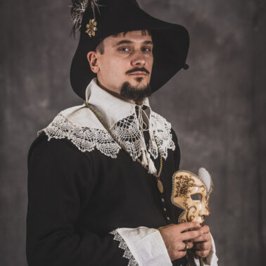 Farbowane na czarno skórzane trzewiki z podkutym obcasem wiązane na kokardę czerwoną jedwabną taśmą. Czerwone wełniane pończochy wiązane pod kolanem jedwabną złotą kokardą. Wełniane czarne bufiaste pludry sięgające do kolan, zapinane na cynowe guzki i wiązane troczkiem. Nowinką są Dość obszerne kieszenie. Koszula lniana. kołnierzyk i mankiety wiązane za pomocą lnianych troczków z frędzlami. Ozdobny kołnierz tkany z koronki w stylu holenderskim. Ozdobne mankiety wykończone delikatną koronką. Ubiór spodni: czarny wełniany wams z baskiną o kroju tzw. gęsiego brzucha z patkami, zapinany na rząd cynowych guzów, spięty skórzanym paskiem. Mankiety wamsu zapinane cynowymi guzami. Na głowie filcowy kapelusz z szerokim rondem zawiniętym z jednej strony i spięty złoconą egretą ozdobioną naturalnymi perłami, klejnotem i pióropuszem ze strusich piór. Czarny skórzany pasek zapiany na haczyk. Na szyi na złotym łańcuchu medalion z przedstawieniem św. Jerzego na awersie i kupieckiego galeonu na rewersie. W ręku maska wenecka wykonana z malowanego papieru czerpanego i zestaw kart do gry.