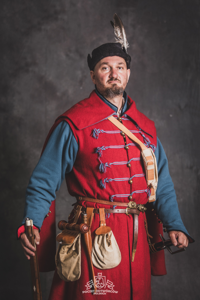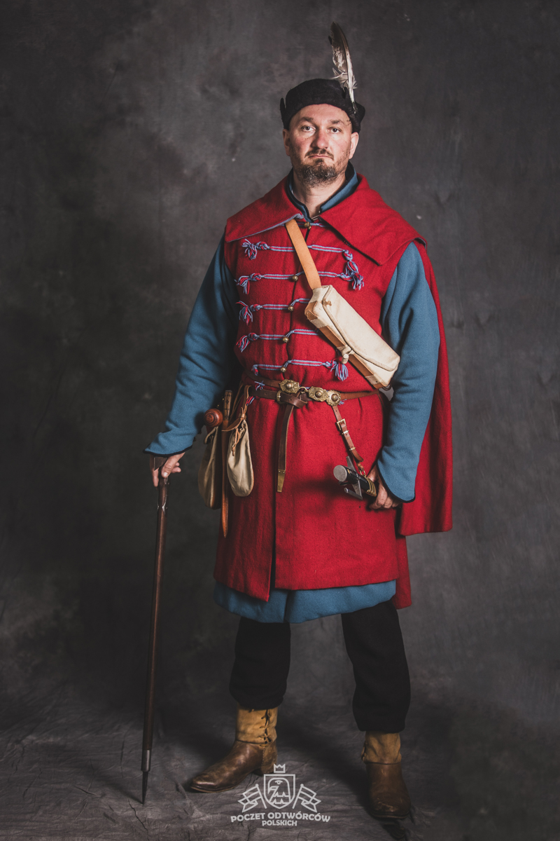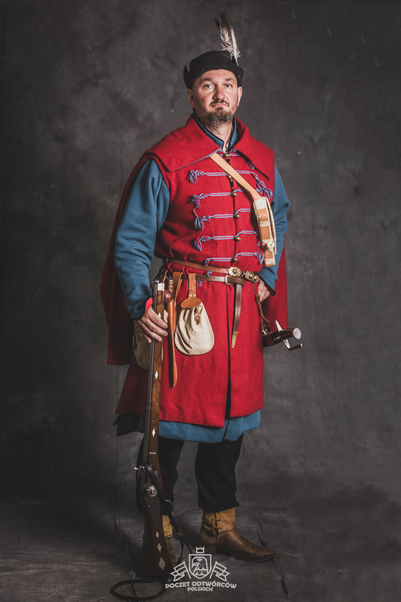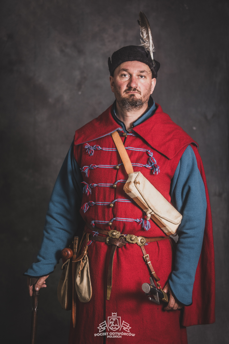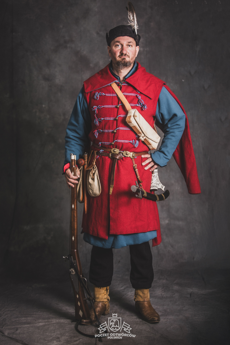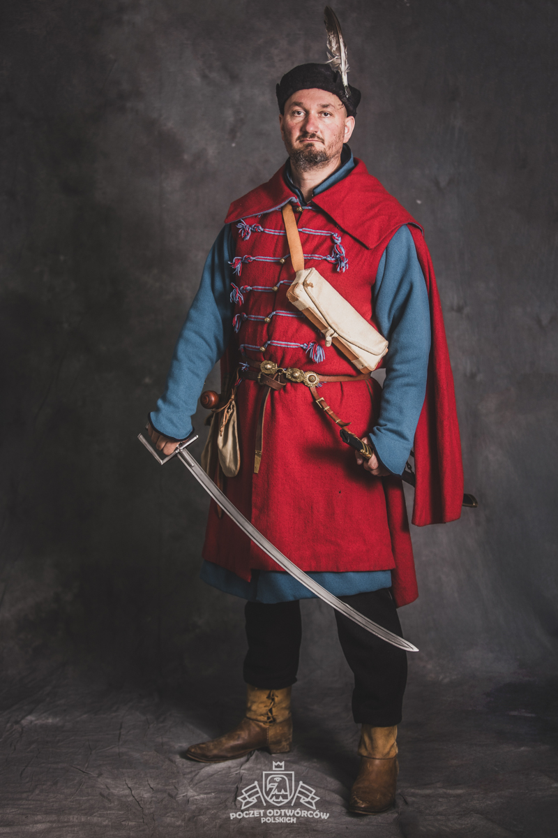 Magierka ozdobiona monetą i piórami, delia węgierska (tzw. mente), żupan lub dołoman, szabla typu węgierskiego z kabłąkiem (tzw. „Lka”) na skórzanych rapciach, berdysz, rusznica kołowa, ładownica, prochownica, kaletka, sakwa na kule ołowiane, wąskie spodnie, trzewiki.