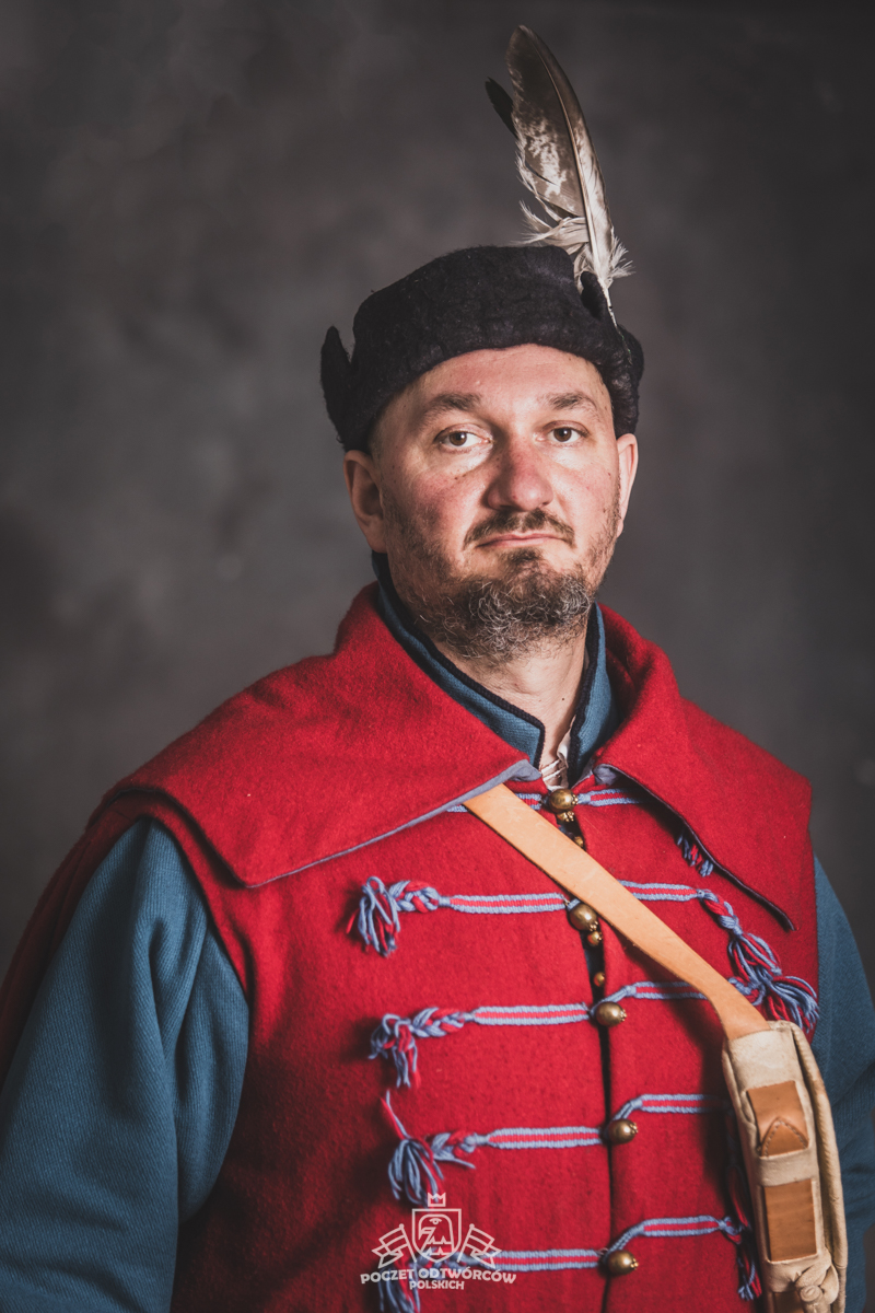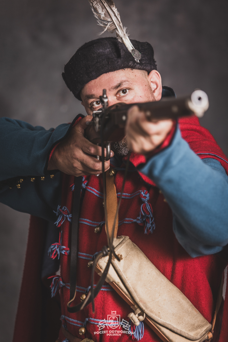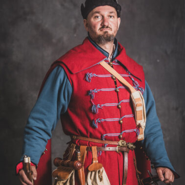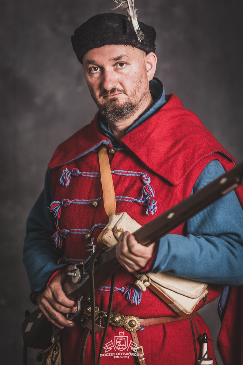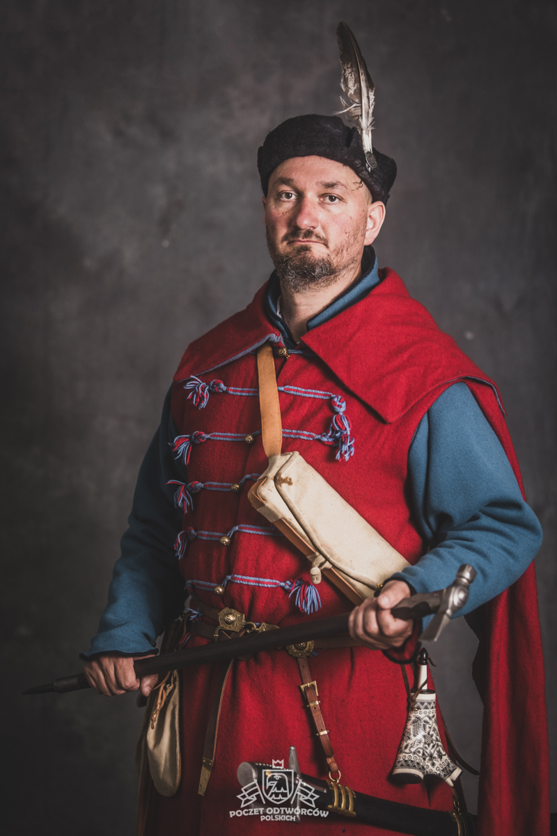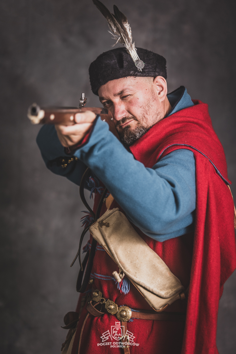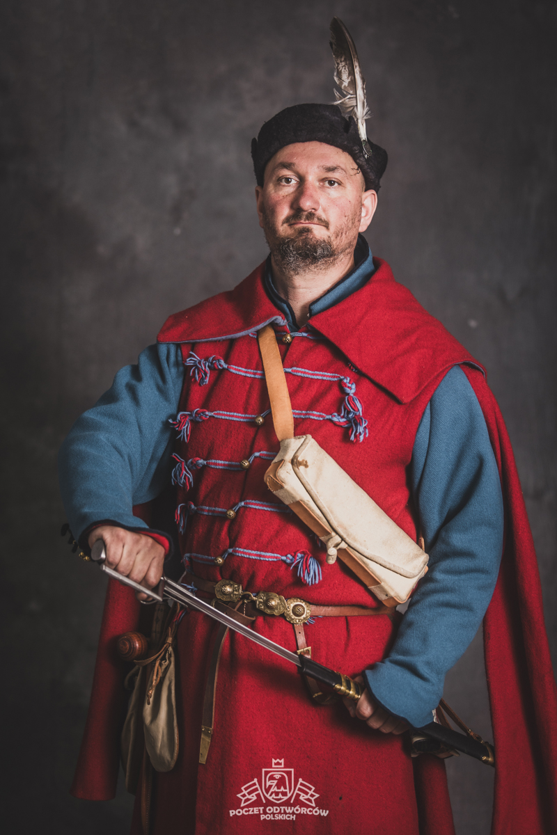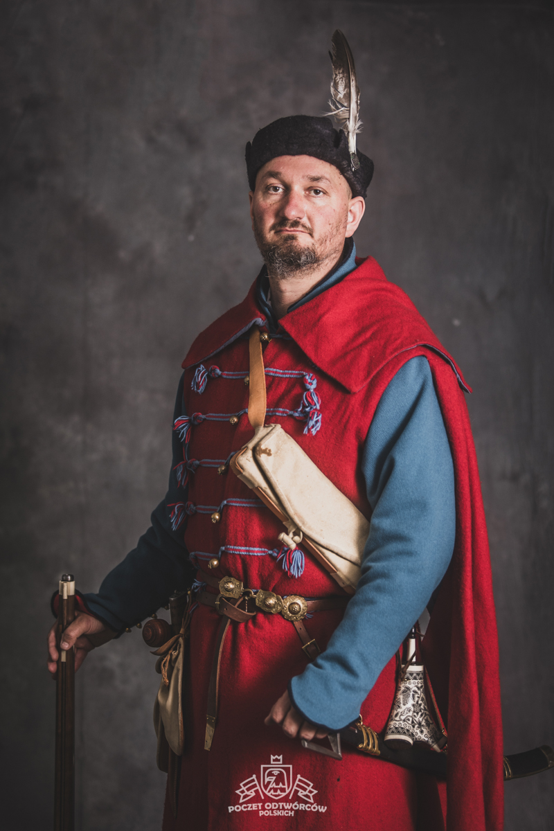 Magierka ozdobiona monetą i piórami, delia węgierska (tzw. mente), żupan lub dołoman, szabla typu węgierskiego z kabłąkiem (tzw. „Lka”) na skórzanych rapciach, berdysz, rusznica kołowa, ładownica, prochownica, kaletka, sakwa na kule ołowiane, wąskie spodnie, trzewiki.