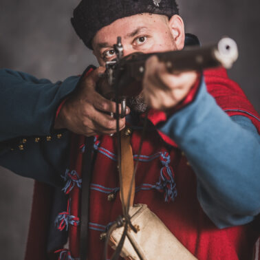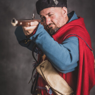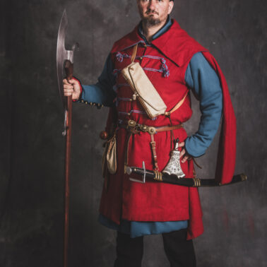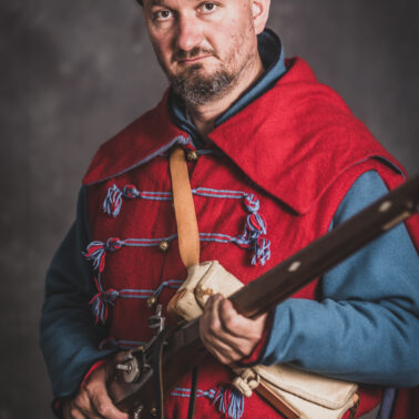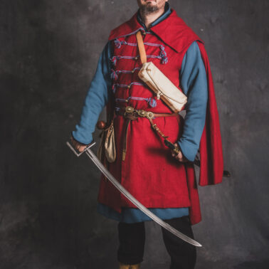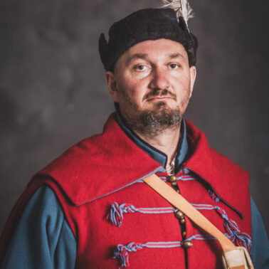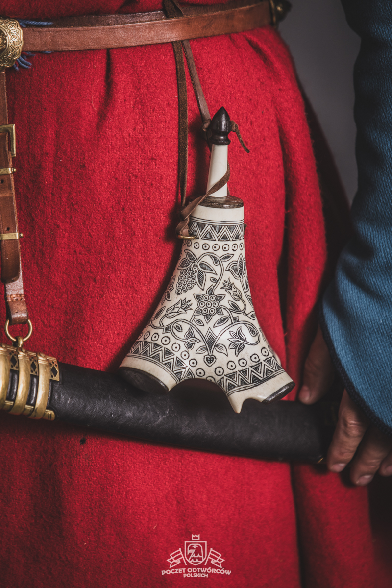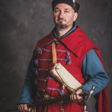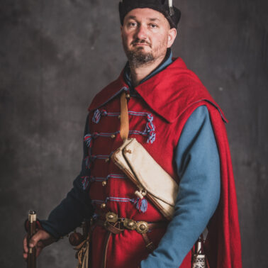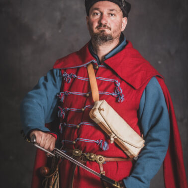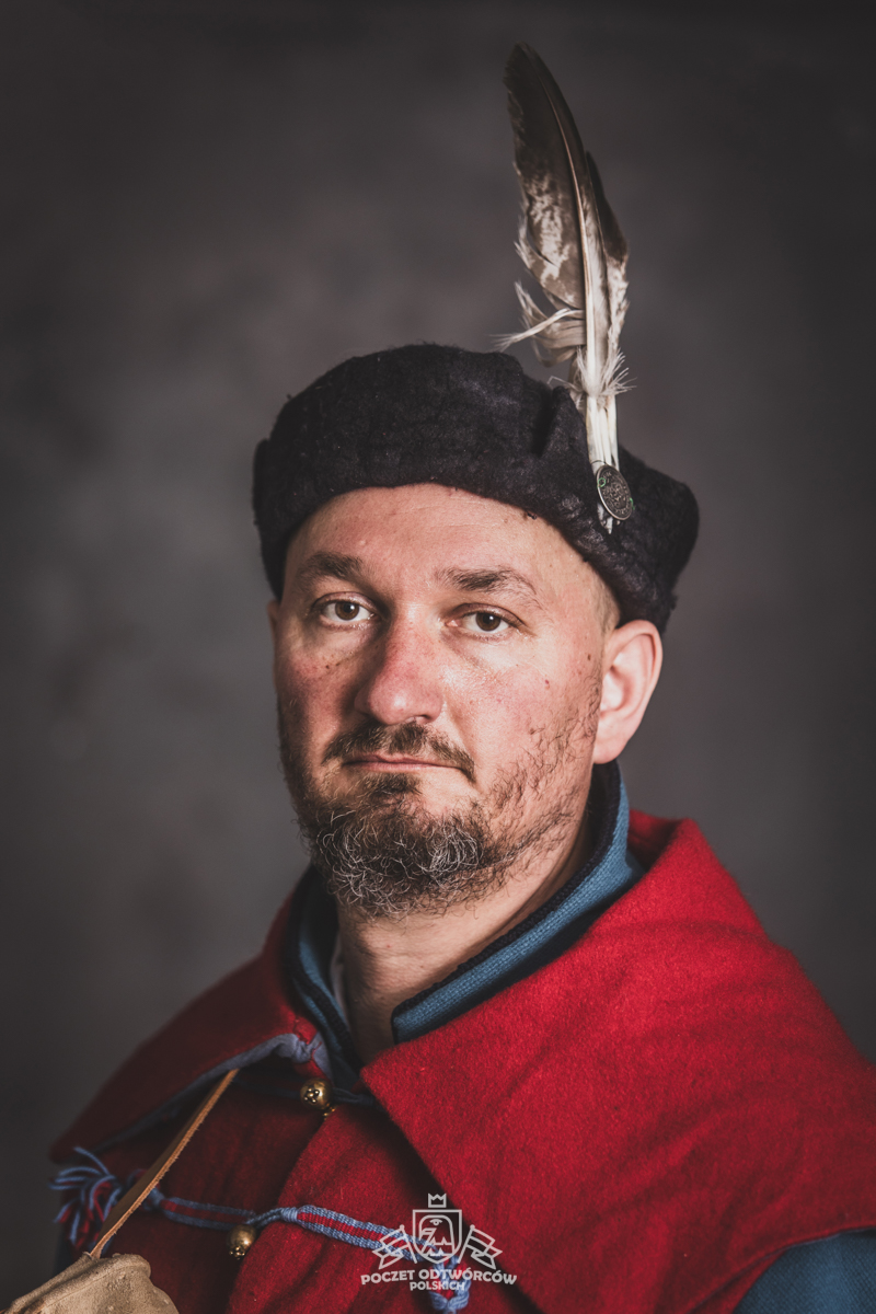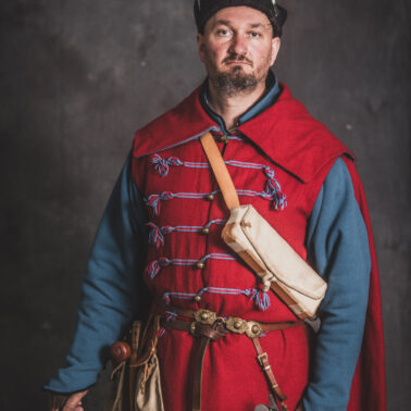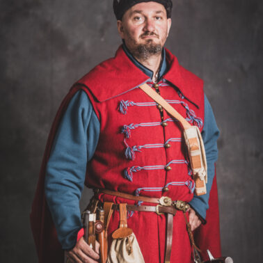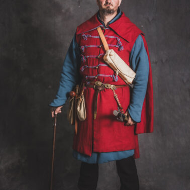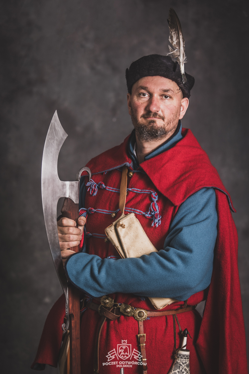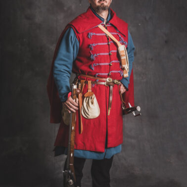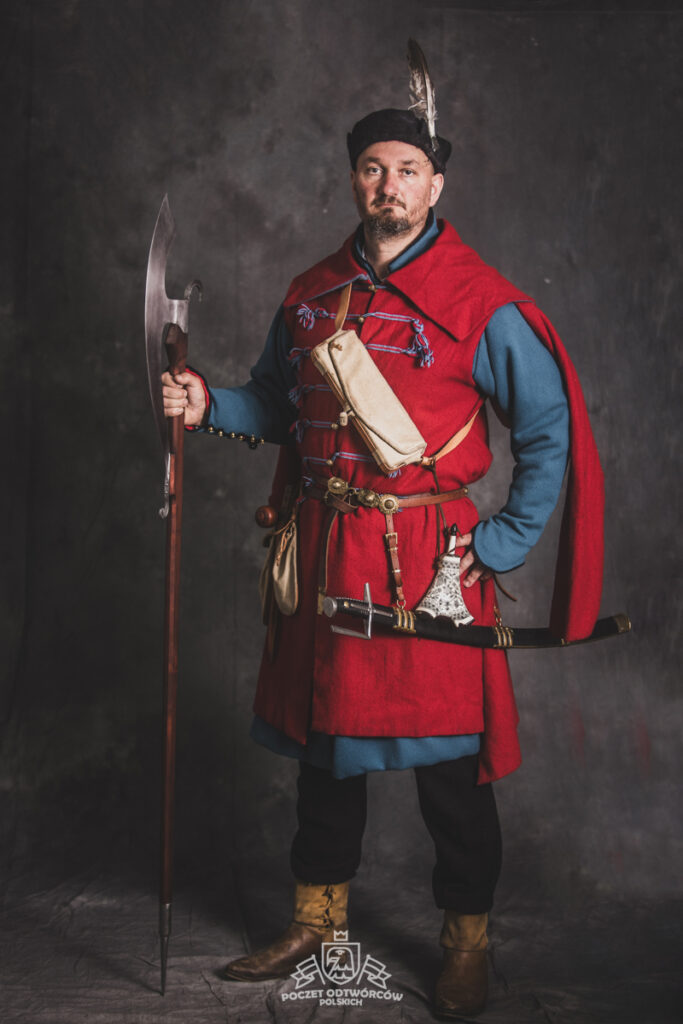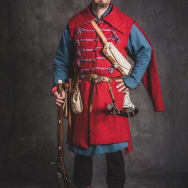 Magierka ozdobiona monetą i piórami, delia węgierska (tzw. mente), żupan lub dołoman, szabla typu węgierskiego z kabłąkiem (tzw. „Lka”) na skórzanych rapciach, berdysz, rusznica kołowa, ładownica, prochownica, kaletka, sakwa na kule ołowiane, wąskie spodnie, trzewiki.