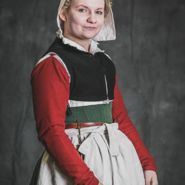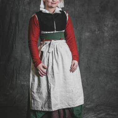 Podstawę stanowi bielizna – lniana koszula do pół uda, z nieobowiązkową halką także lnianą. Następnie lniana spódnica w kolorze brązowym stanowiąca warstwę spodnią. Kolejno kirtle, jednoczęściowa suknia bez rękawów, na ziemiach polskich nazywana także letnikiem w tym wypadku usztywniona fiszbinami wiązana z obu boków wykonana z lnu. Do sukni dowiązane wełniane rękawy, pojawiające się na ikonografiach holenderskich. Na letniku lniany partlet, czyli część ubioru bez rękawów wiązana z przodu i po bokach zakrywająca dekolt. Następnie partlet wełniany dodatkowo chroniący przed zimnem. Na głowie biały czepek o prostym kroju. W pasie przewiązany jest fartuch z ręcznie tkanego lnu. Pod nim skórzany pasek z dowiązaną sakiewką na drobiazgi oraz prosty nóż codzienny z drewnianą rękojeścią. Obuwie stanowią saboty, czyli buty drewniane charakterystyczne dla mody holenderskiej. Uzupełnienie stroju stanowi kosz wiklinowy ze skórzanymi pasami umożliwiającymi noszenie na plecach.