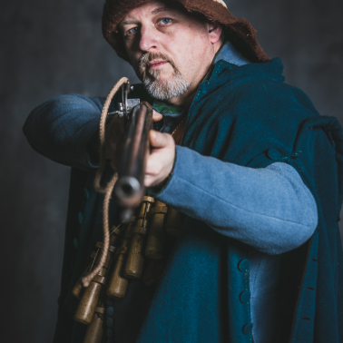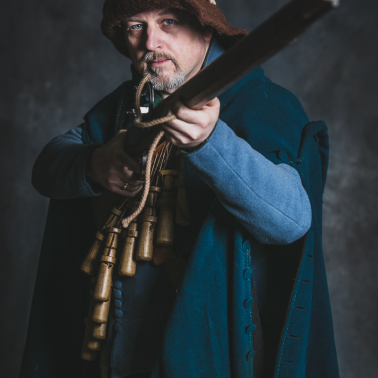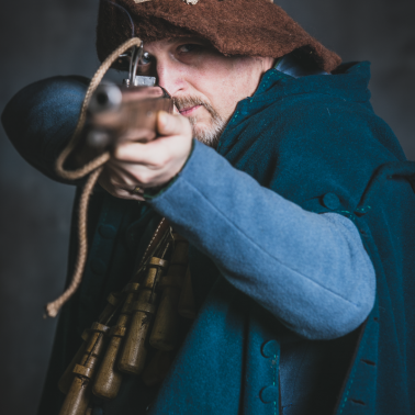 Buty niskie, skórzane wiązane z góry. Pończochy wełniane lub dziane za kolano. Pludry wełniane z lnianą podszewką szerokie zakończone za kolanem, wiązane taśmą lub spinane na guzy. Wams lniany lub wełniany jako odzienie podstawowe. Bandolier z drewnianymi pulwersakami na porcje prochu. Na końcu pasa sakiewka z kulami ołowianymi oraz stalowa bądź mosiężna tuleja z powierconymi otworami na lont. Na wierzchu płaszcz holenderski bez rękawów. Kapelusz filcowy. Uzbrojony w muszkiet lontowy, pałasz jako broń boczną. (Jacob van Gheyn, Wapenhandelingen van Roers. Musquetten ende Spiesen, 1608 r)