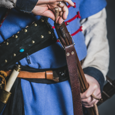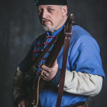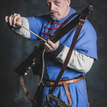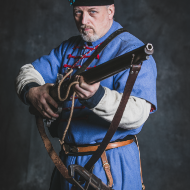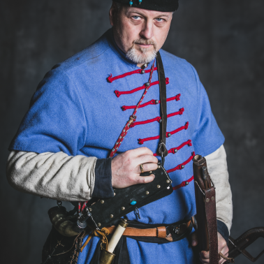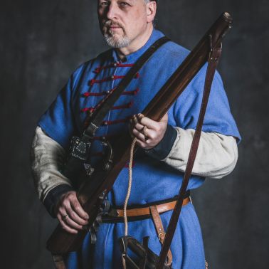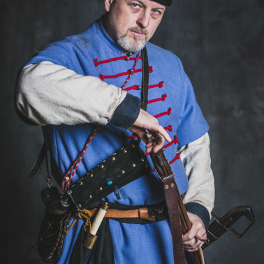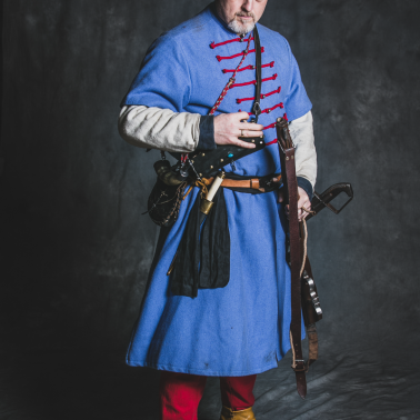 Buty za kostkę, skórzane wiązane z boku (portret Stefana Batorego), spodnie wełniane wąskie, żupan biały z niebieską podszewką z surówki wełnianej i delia wełniana obłoczysta, szamerunek czerwony guzy ołowiane wielkością zgodne z kalibrem lufy arkebuza. Ładownica na patrony, prochownica z prochem podsypkowym. Szabla w typie węgierskim, toporek, na głowie megierka z trzęścieniem.