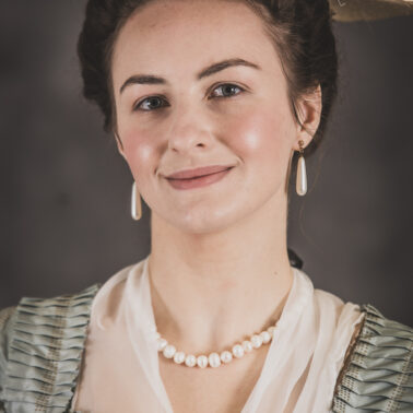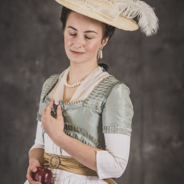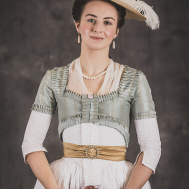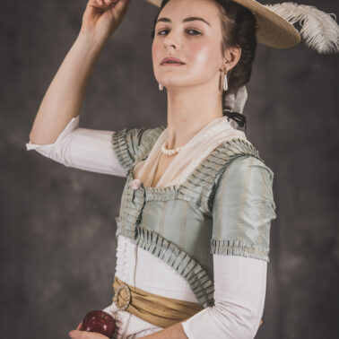 Styl przedstawiony na fotografiach można odnaleźć w licznych źródłach z epoki, takich jak autoportret Rose-Adélaide Ducreux z 1791 roku czy portret Henriette Anne d’Aguesseau pędzla Vigée Le Brun z 1789 roku. Charakterystyczna suknia, znana jako robe à la turque (suknia w stylu tureczkim), wyróżniała się odciętym stanikiem, który tworzył efekt warstwowości, oraz podwójnymi rękawami. Dopełnieniem stroju była szarfa wiązana w talii. Uznawany za nieformalny, ten rodzaj ubioru często wybierano na spacery czy pikniki. Zazwyczaj łączono go z delikatną chustą zasłaniającą dekolt (fichu) oraz stylowym nakryciem głowy, takim jak popularny wówczas słomkowy kapelusz zwany bergère (z francuskiego „pasterka”). Widoczna na zdjęciach suknia wykonana jest z jedwabnych taft oraz tkaniny bawełnianej, połączona z subtelną biżuterią z naturalnych pereł.