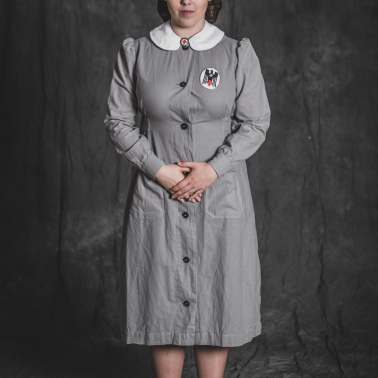 Kitel roboczy (taki jak dla helferin der Heeres), naszywka DRK na lewej piersi, wpinka DRK helferin, fartuch obustronny biały, czepek z czerwonym krzyżem, pończochy nylonowe, czarne buty damskie.