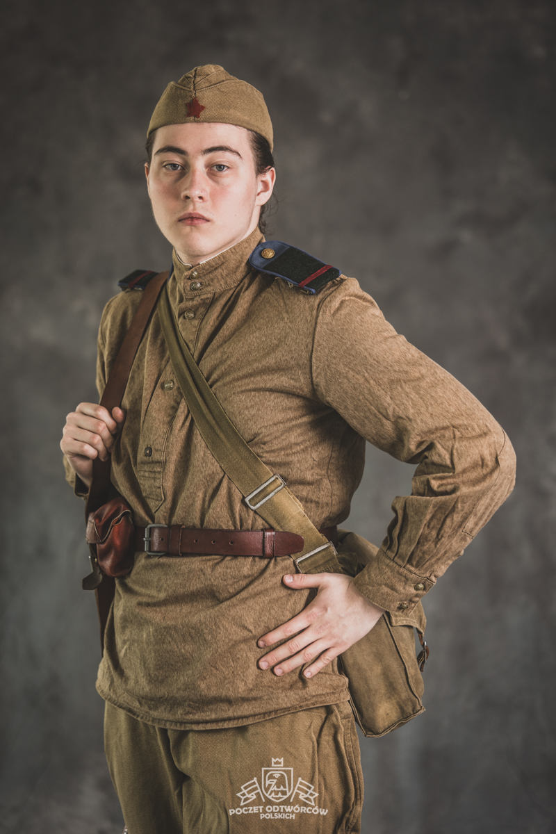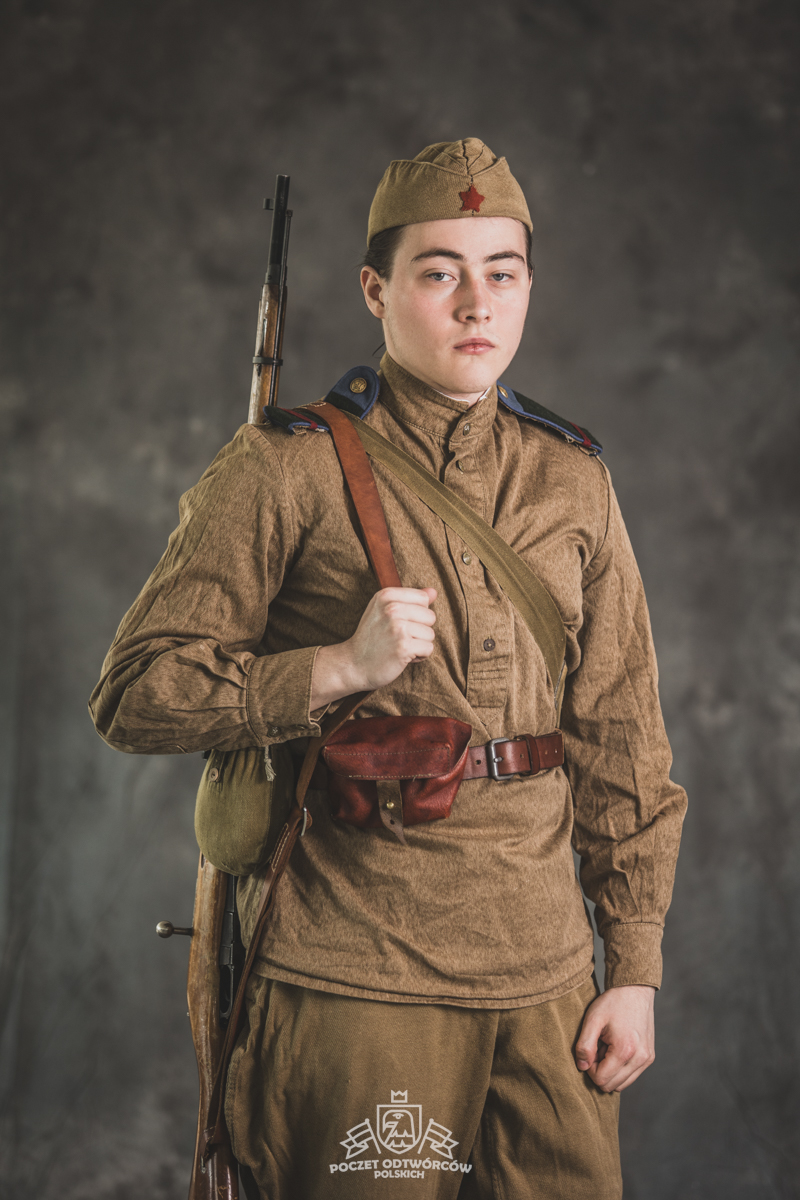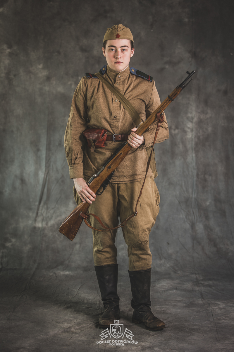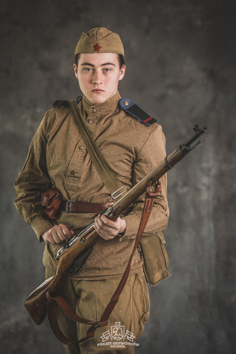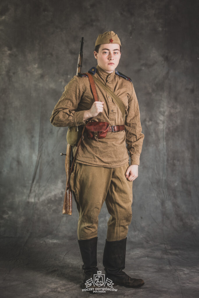 Gimnastiorka obr.43 z tuwińskimi pagonami, Bryczesy obr.35, Pilotka z naszytą sukienną gwiazdą w kolorze czerwonym, Radziecka bielizna, Sapogi, Skórzany pas obr.35, Manierka obr.32 w pokrowcu, Ładownica obr.41, Torba na maskę przeciwgazową, Karabin Mosin obr.91/30.