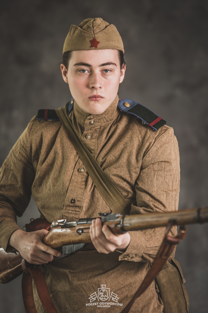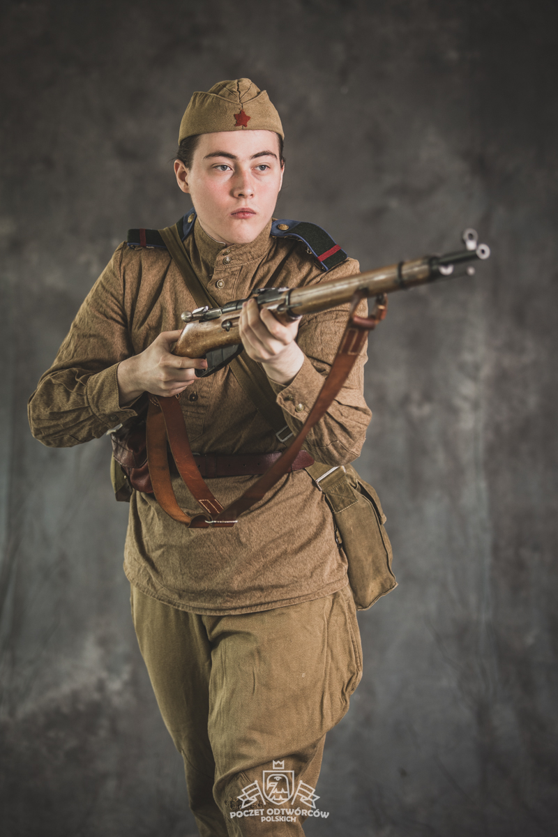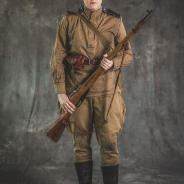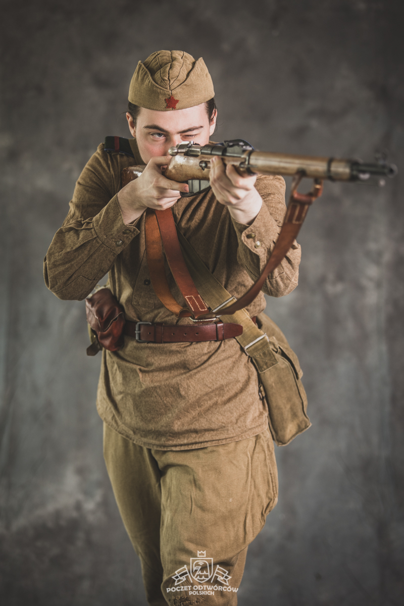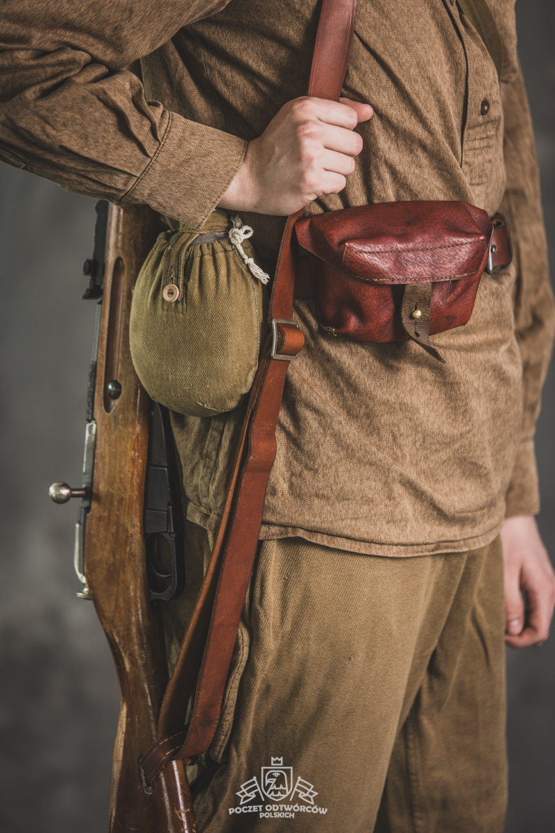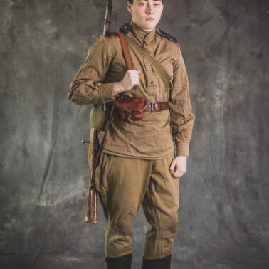 Gimnastiorka obr.43 z tuwińskimi pagonami, Bryczesy obr.35, Pilotka z naszytą sukienną gwiazdą w kolorze czerwonym, Radziecka bielizna, Sapogi, Skórzany pas obr.35, Manierka obr.32 w pokrowcu, Ładownica obr.41, Torba na maskę przeciwgazową, Karabin Mosin obr.91/30.