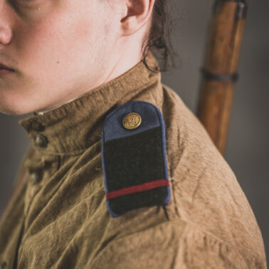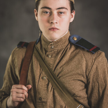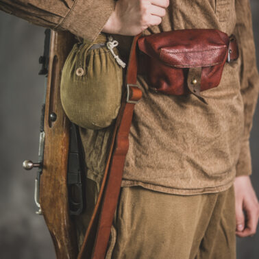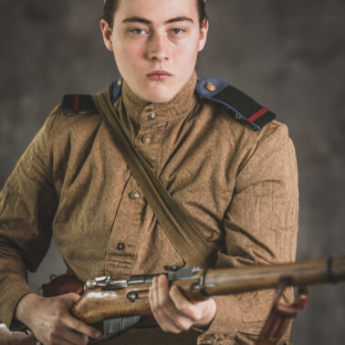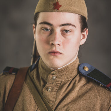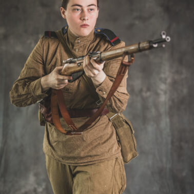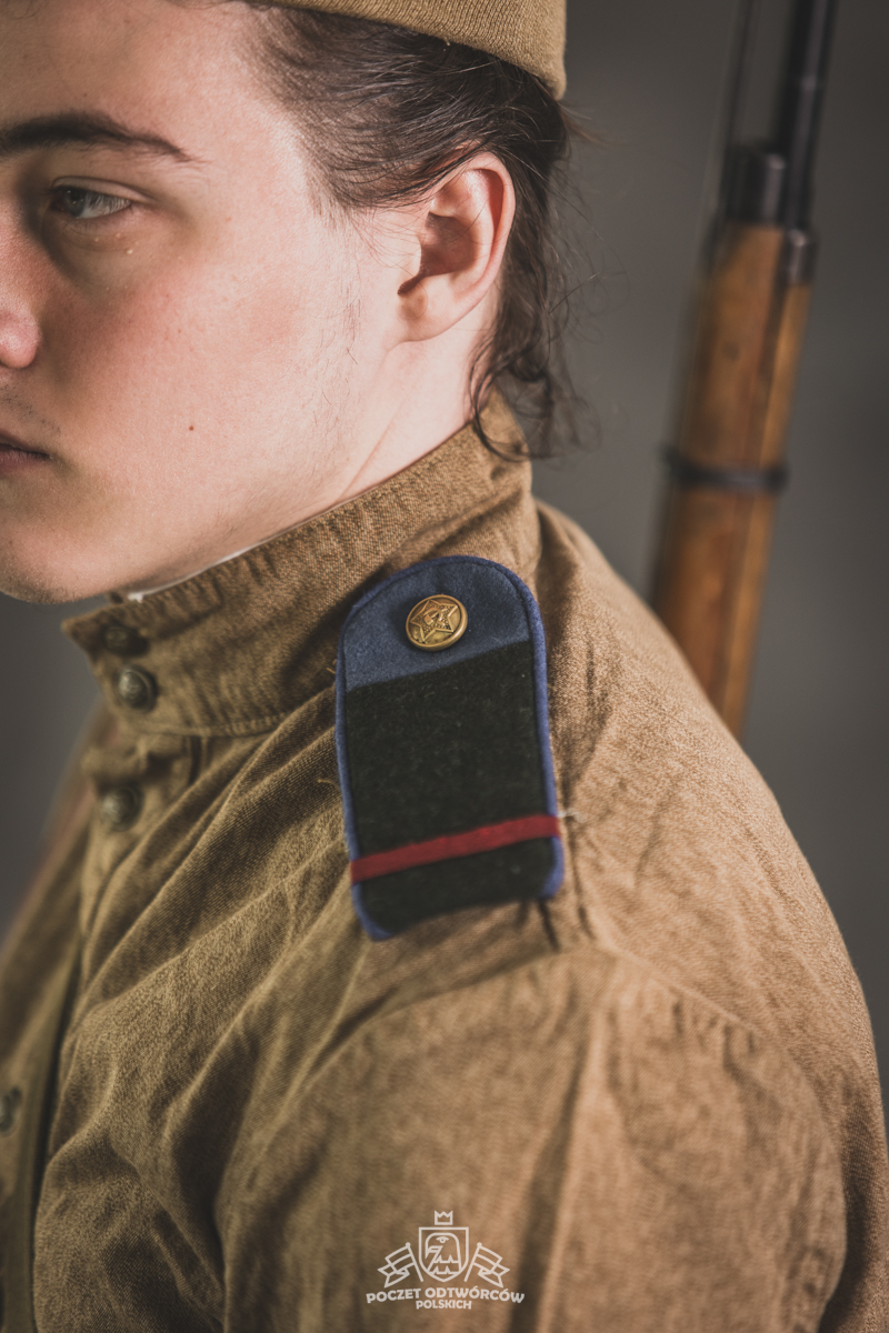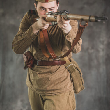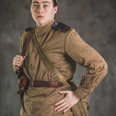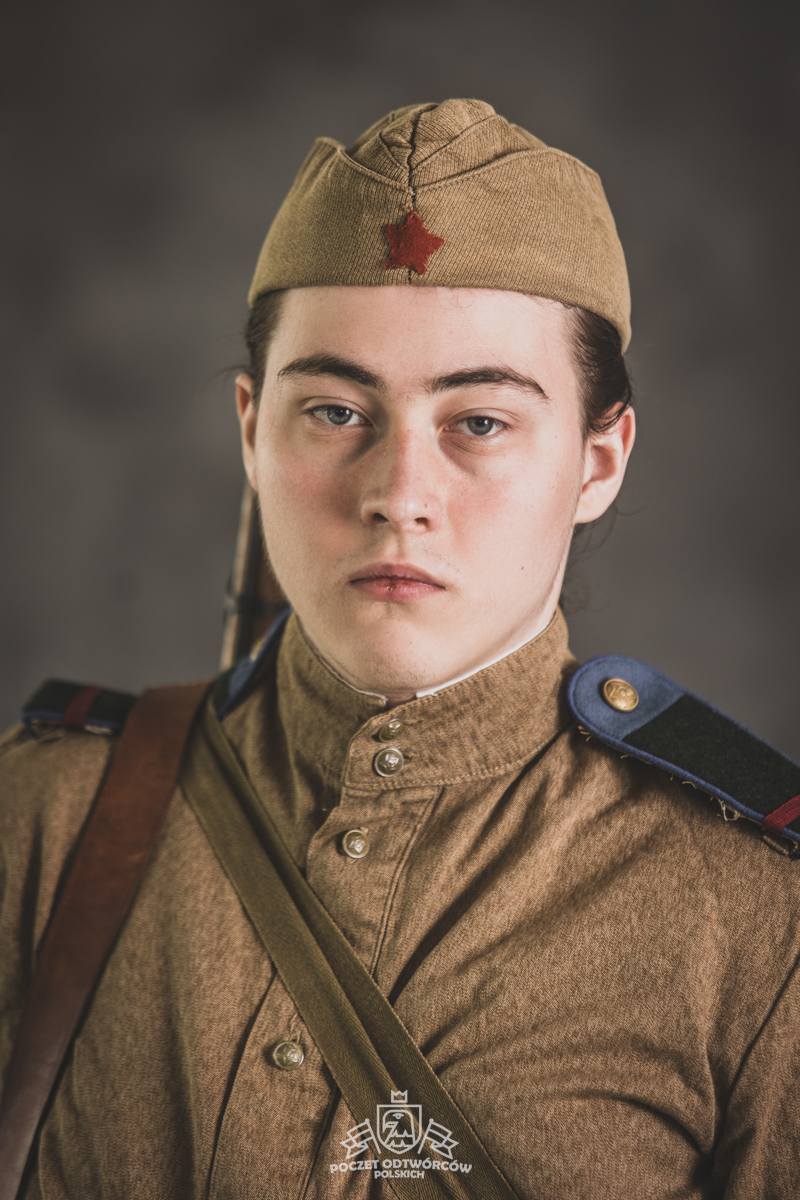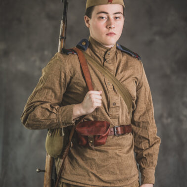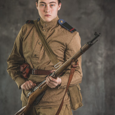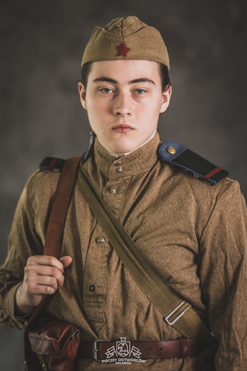 Gimnastiorka obr.43 z tuwińskimi pagonami, Bryczesy obr.35, Pilotka z naszytą sukienną gwiazdą w kolorze czerwonym, Radziecka bielizna, Sapogi, Skórzany pas obr.35, Manierka obr.32 w pokrowcu, Ładownica obr.41, Torba na maskę przeciwgazową, Karabin Mosin obr.91/30.
