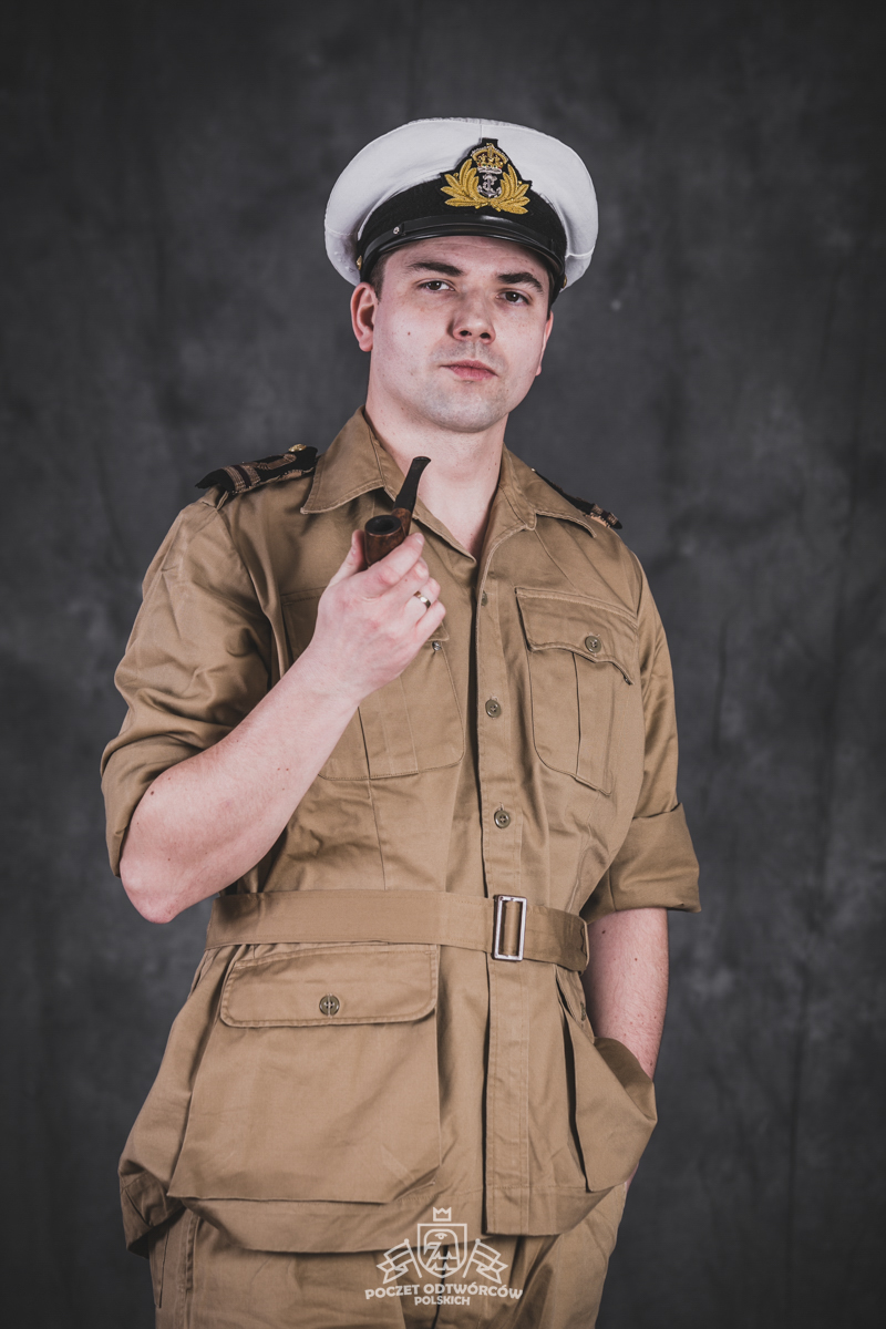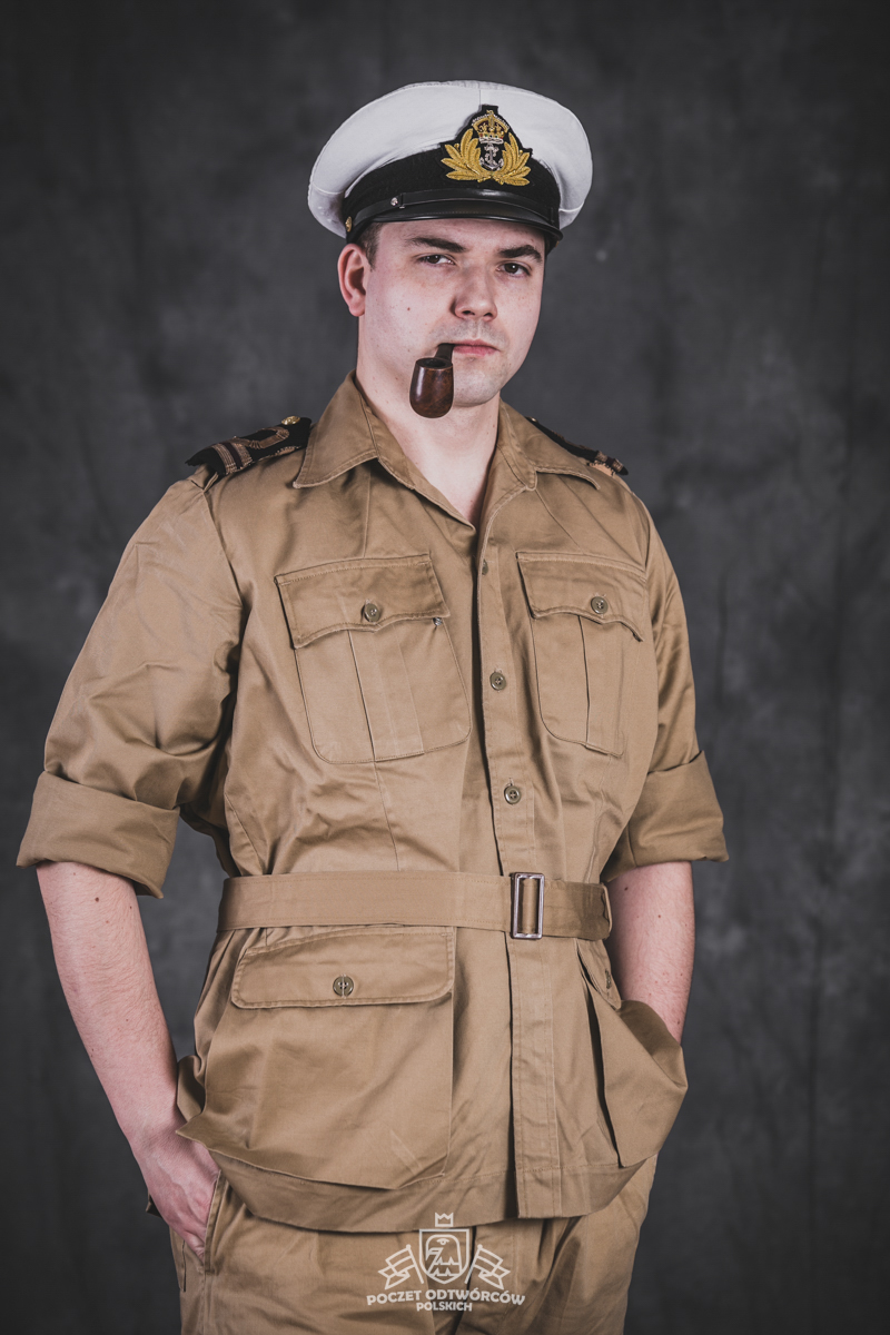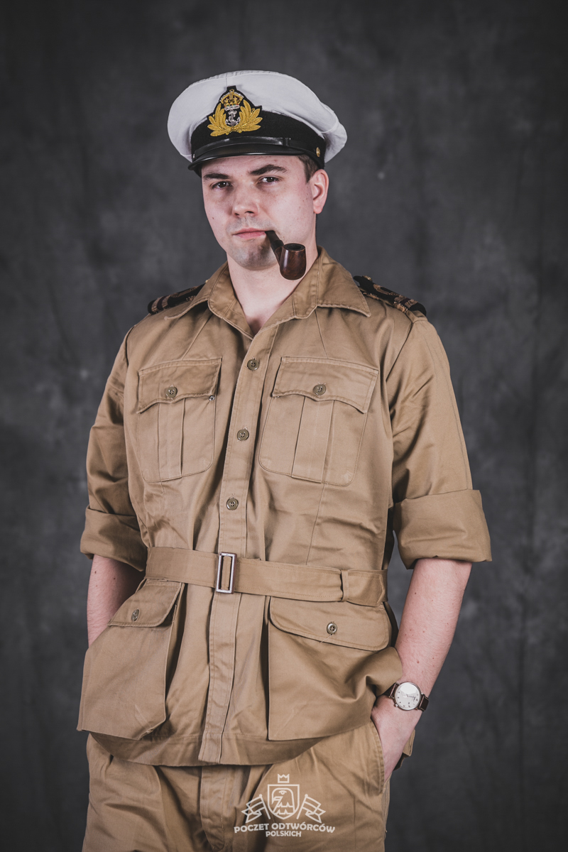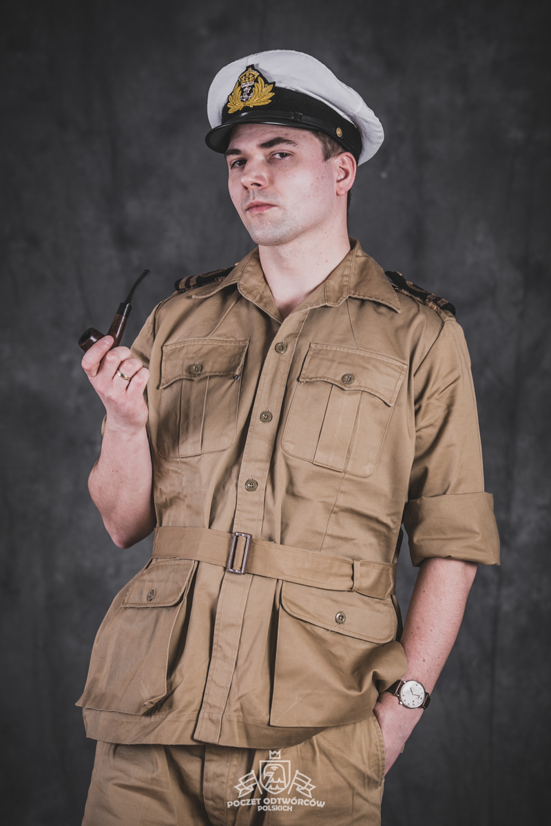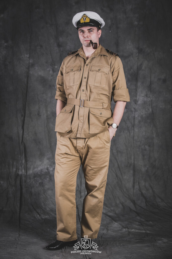 Czapka oficerska wzoru dla młodszych oficerów, drelichowa kurtka tropikalna z pasem w kolorze khaki – tzw. Khaki Drill (KD) bush jacket. Naramienniki wzoru dla RNVR – z pofalowanym galonem. Purpurowy pas między galonami wskazuje na przynależność oficera do działu maszynowego (E – engineering). Długie spodnie KD, czarne półbuty. Oficer niesie skórzaną aktówkę oraz mapy sektora, do którego zostanie skierowany na patrol jego okręt.