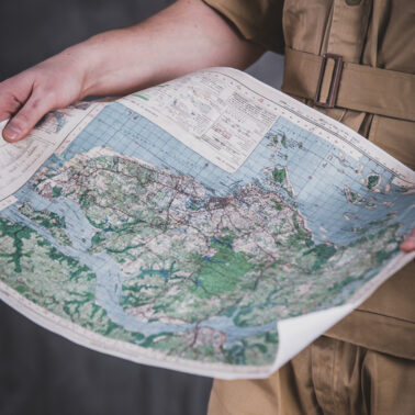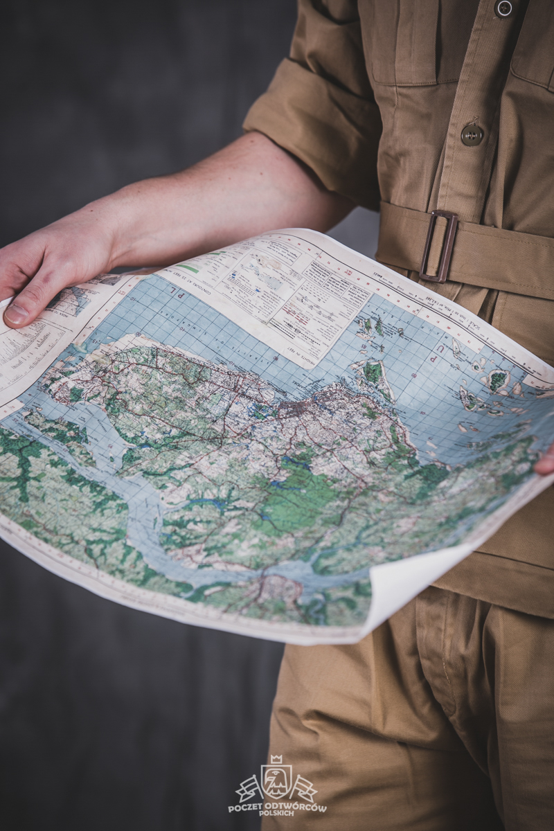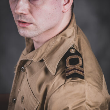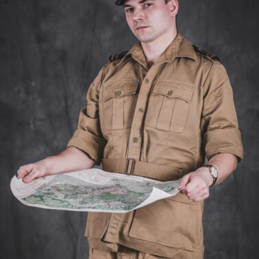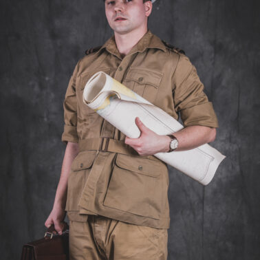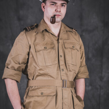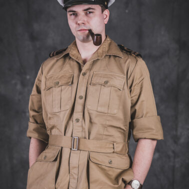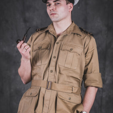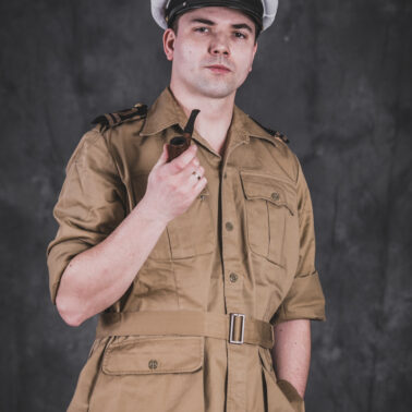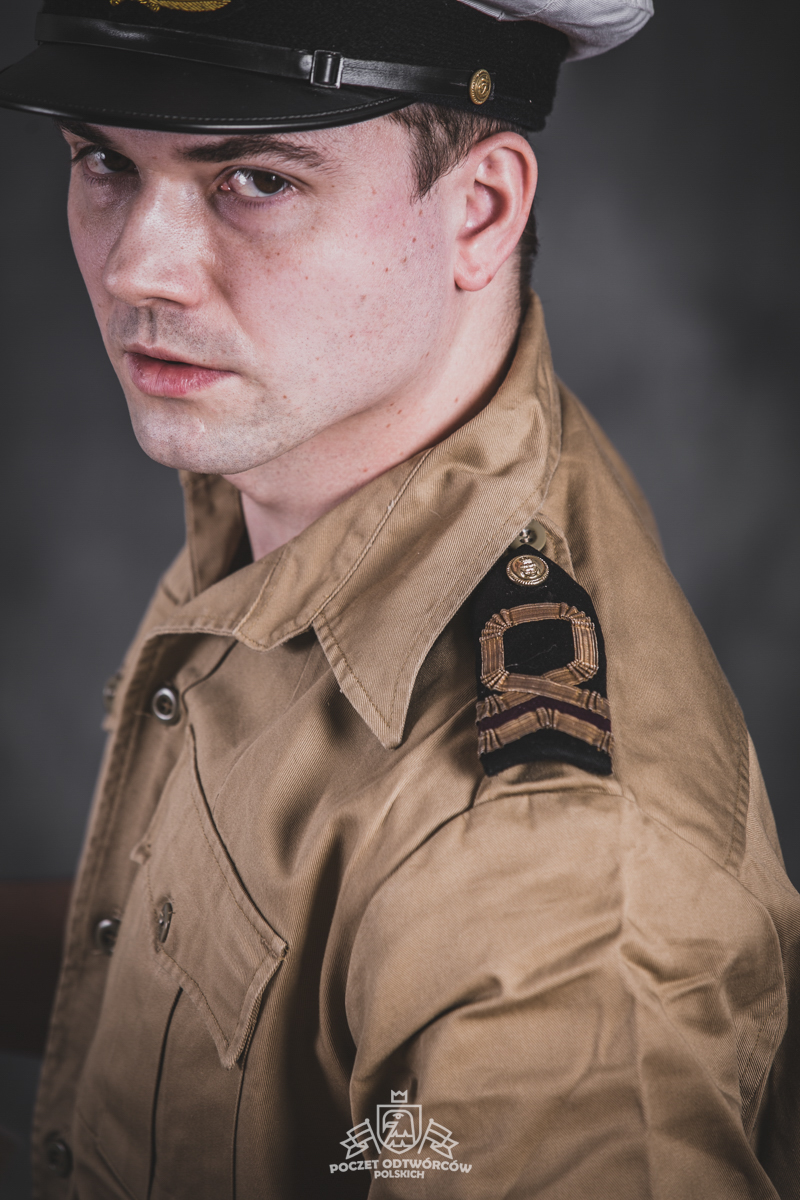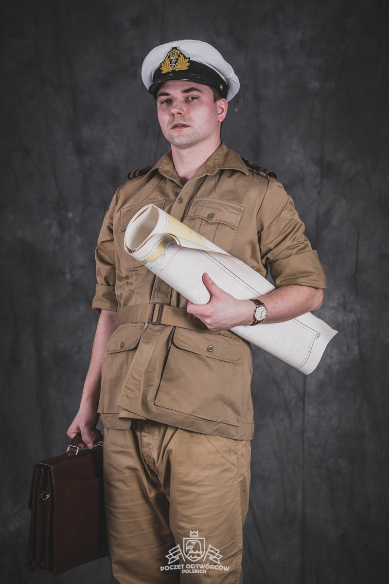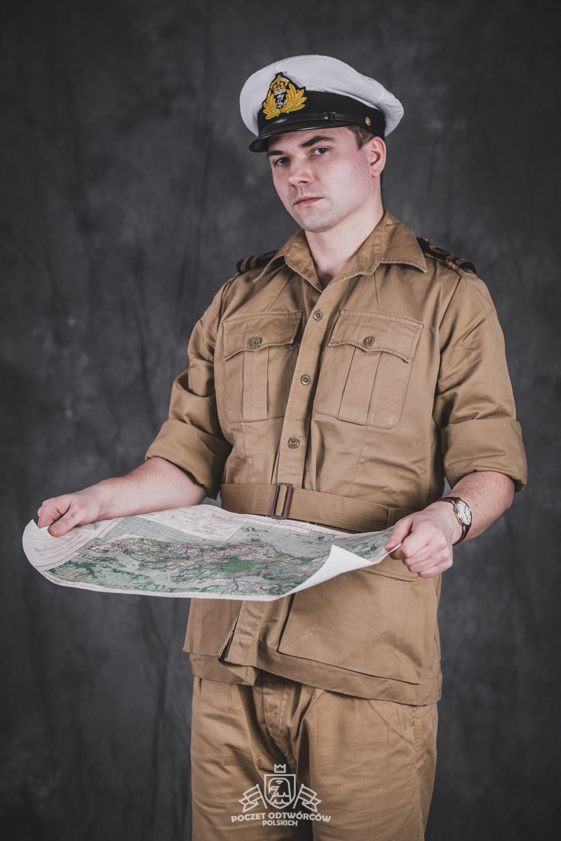 Czapka oficerska wzoru dla młodszych oficerów, drelichowa kurtka tropikalna z pasem w kolorze khaki – tzw. Khaki Drill (KD) bush jacket. Naramienniki wzoru dla RNVR – z pofalowanym galonem. Purpurowy pas między galonami wskazuje na przynależność oficera do działu maszynowego (E – engineering). Długie spodnie KD, czarne półbuty. Oficer niesie skórzaną aktówkę oraz mapy sektora, do którego zostanie skierowany na patrol jego okręt.