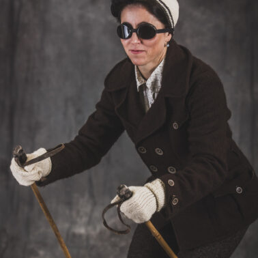 Komplet narciarski składający się ze spodni oraz z kurtki, został uszyty współcześnie w oparciu o zdjęcia z epoki przedstawiające osoby rekreacyjnie uprawiające narciarstwo. Oba elementy ubioru wykonane zostały z wełny, w kolorze brązu. Spodnie posiadają charakterystyczny dla spodni narciarskich, luźny, swobodny krój, dzięki czemu nie krępowały ruchów podczas uprawiania tej dyscypliny. Zapinane są z lewej strony, na 4 drewniane guziki. Posiadają dwie, boczne, wpuszczane kieszenie. Na dole, nogawki posiadają patki z guzikiem co umożliwiało ściślejsze zapięcie nogawek tak aby zapobiec wpadaniu śniegu do środka spodni. Kurtka, zapinana na dwa rzędy guzików, posiada trzy kieszenie. Pod kurtką widoczna jest bluzka z niewielkim kołnierzykiem, zapinana na drobne guziczki. Niezbędne przy sportach zimowych były ciepłe rękawiczki (łapawice) oraz czapka – wykonane ręcznie z wełny. Buty górskie wykonane współcześnie przez szewca-rzemieślnika, wzorowane były na oryginalnym obuwiu górskim. W całości wykonane ze skóry, posiadają podkutą podeszwę oraz krawędzie, co ułatwia poruszanie się w terenie. Prezentowany sprzęt narciarski pochodzi z lat 40. Ponad dwumetrowe, drewniane narty, bez metalowych krawędzi, z charakterystycznie mocno podwiniętym „dziobem”. Wiązanie typu KANDAHAR, wymagające jazdy tzw. techniką telemarkową. Dodatkowo para lekkich bambusowych kijków, ze skórzaną rączką i paskami do umocowania na nadgarstku.