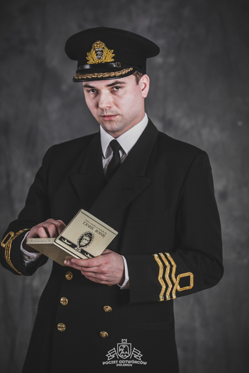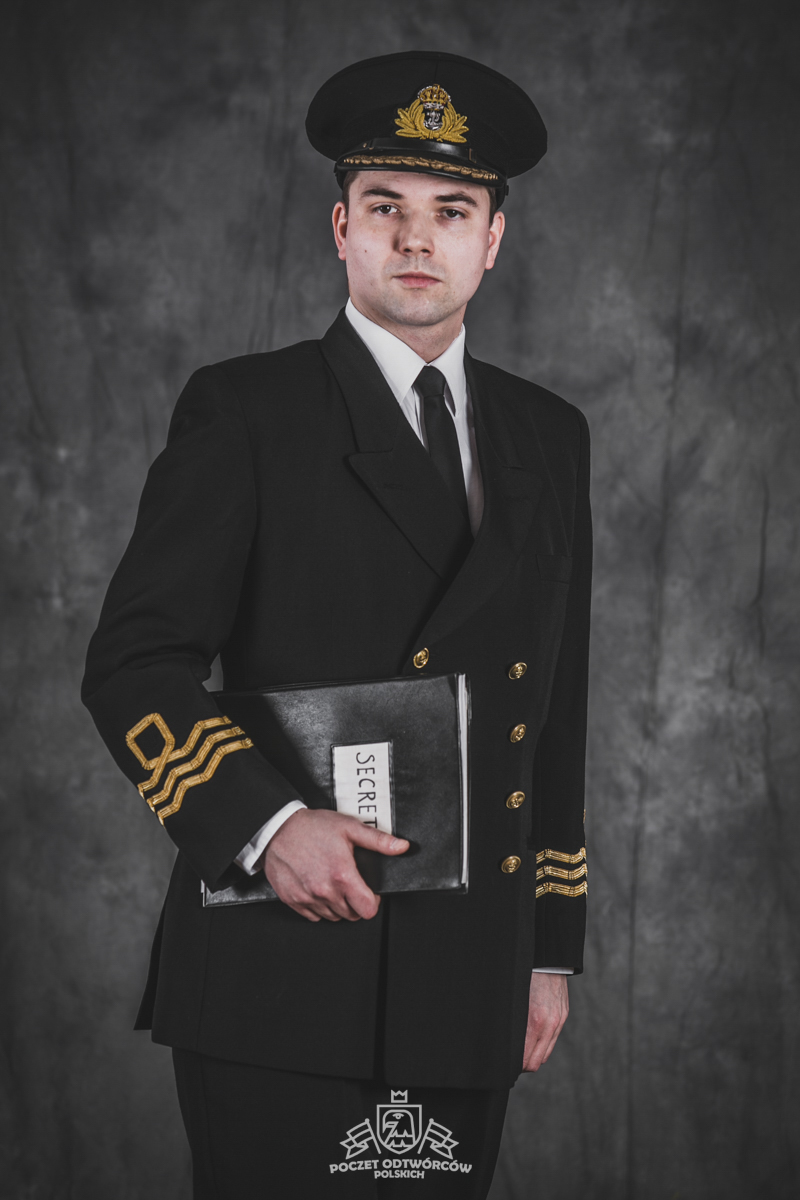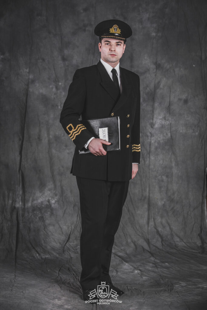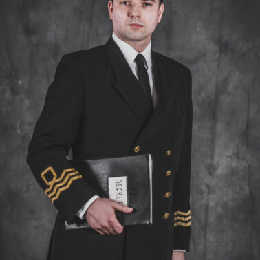 Mundur oficerski nr 5 – czapka oficerska wzoru dla oficerów starszych, dwurzędowa kurtka mundurowa, zapinana na 4 złocone guziki wzoru dla oficerów oraz długie spodnie – szyte u prywatnego krawca z wełny czesankowej (tzw. barathea). Na mankietach rękawów kurtki oznaki stopnia wzoru dla Ochotniczej Rezerwy Królewskiej Marynarki Wojennej (ang. Royal Navy Volunteer Reserve – RNVR). Regulaminowe czarne półbuty, biała koszula i czarny krawat zawiązany na węzeł regatowy. Blaszane pudełko na papierosy „Senior Service” (Starsza służba – tak w brytyjskich siłach zbrojnych określa się Królewską Marynarkę Wojenną. Papierosy „Senior Service” były popularne wśród kadry oficerskiej Royal Navy i są do dziś uznawane za jedną z luksusowych marek dostępnych w Wielkiej Brytanii). Komandor Fleming przegląda teczkę z planami niemieckich rakiet V-2, zdobytą w ramach operacji „Kusza” przez 30 Jednostkę Szturmową (30 Assault Unit).