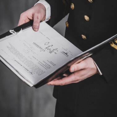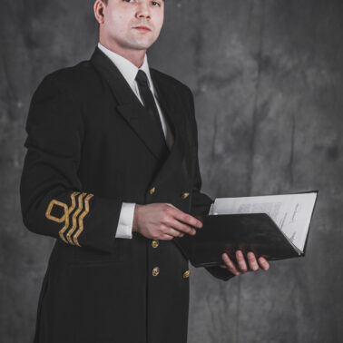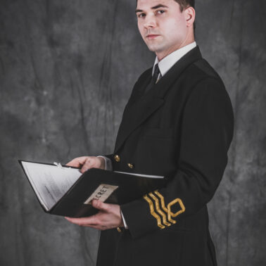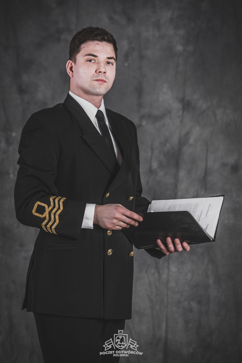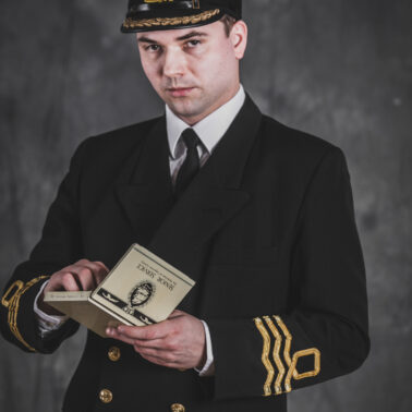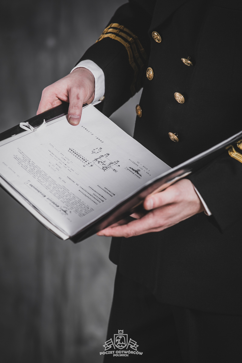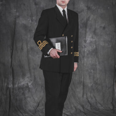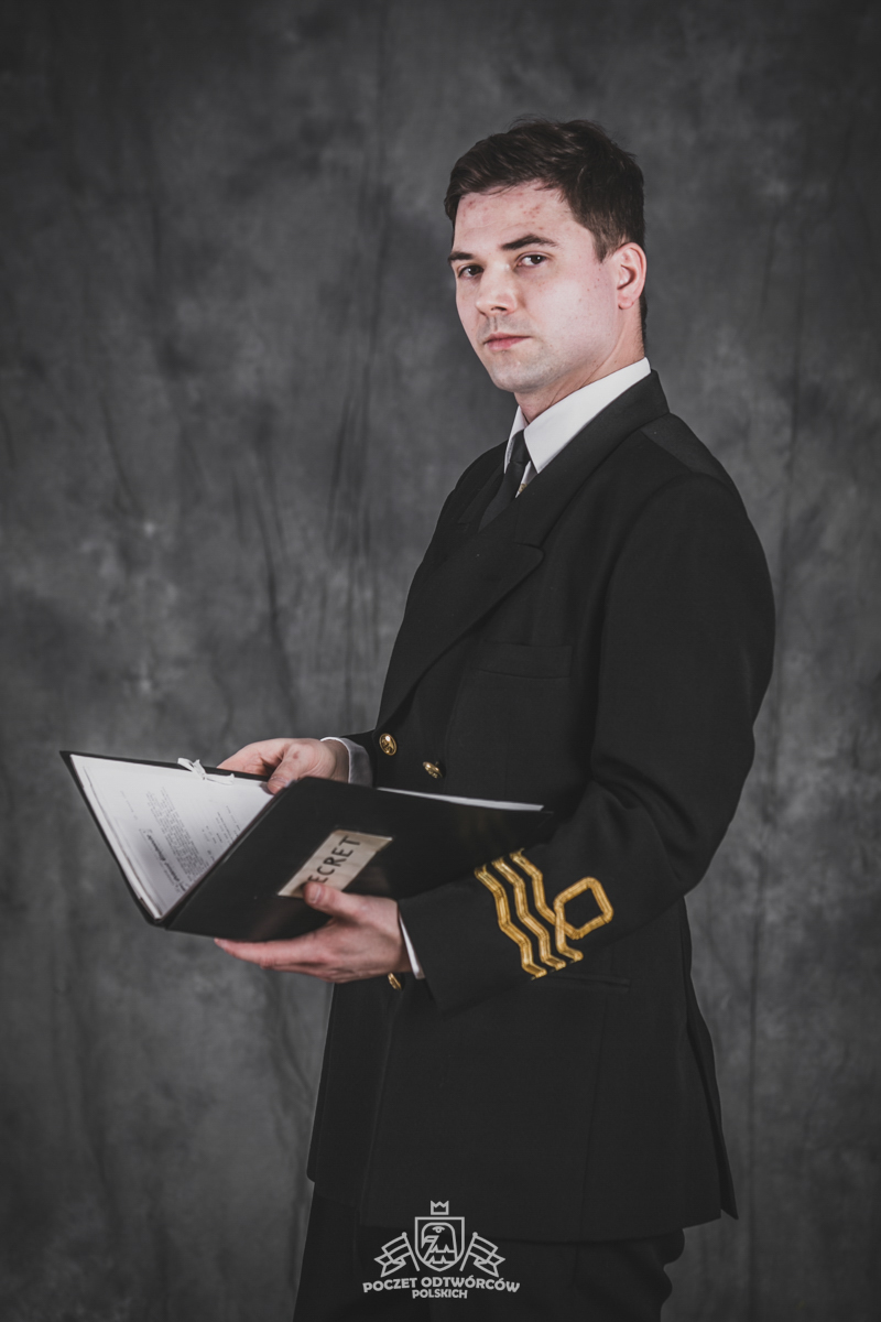 Mundur oficerski nr 5 – czapka oficerska wzoru dla oficerów starszych, dwurzędowa kurtka mundurowa, zapinana na 4 złocone guziki wzoru dla oficerów oraz długie spodnie – szyte u prywatnego krawca z wełny czesankowej (tzw. barathea). Na mankietach rękawów kurtki oznaki stopnia wzoru dla Ochotniczej Rezerwy Królewskiej Marynarki Wojennej (ang. Royal Navy Volunteer Reserve – RNVR). Regulaminowe czarne półbuty, biała koszula i czarny krawat zawiązany na węzeł regatowy. Blaszane pudełko na papierosy „Senior Service” (Starsza służba – tak w brytyjskich siłach zbrojnych określa się Królewską Marynarkę Wojenną. Papierosy „Senior Service” były popularne wśród kadry oficerskiej Royal Navy i są do dziś uznawane za jedną z luksusowych marek dostępnych w Wielkiej Brytanii). Komandor Fleming przegląda teczkę z planami niemieckich rakiet V-2, zdobytą w ramach operacji „Kusza” przez 30 Jednostkę Szturmową (30 Assault Unit).