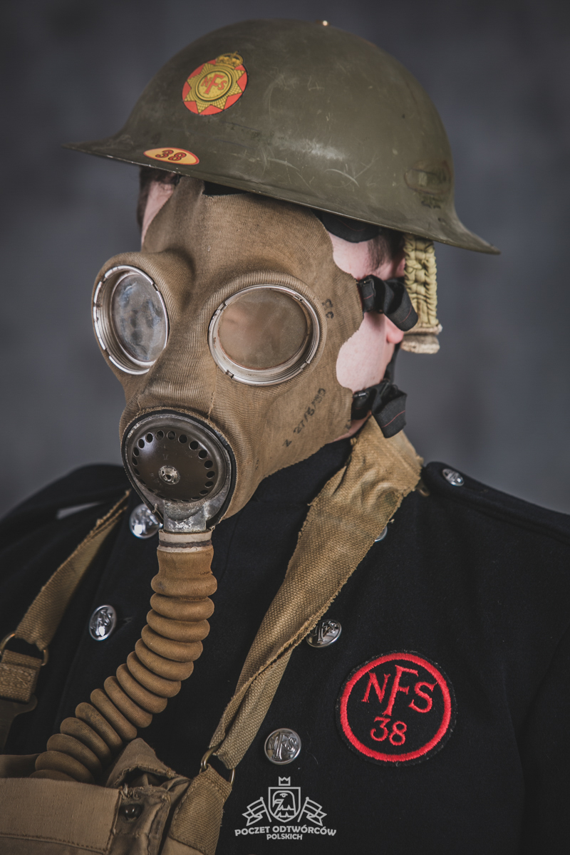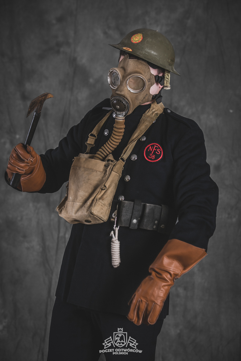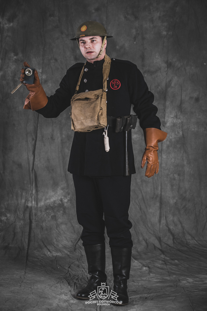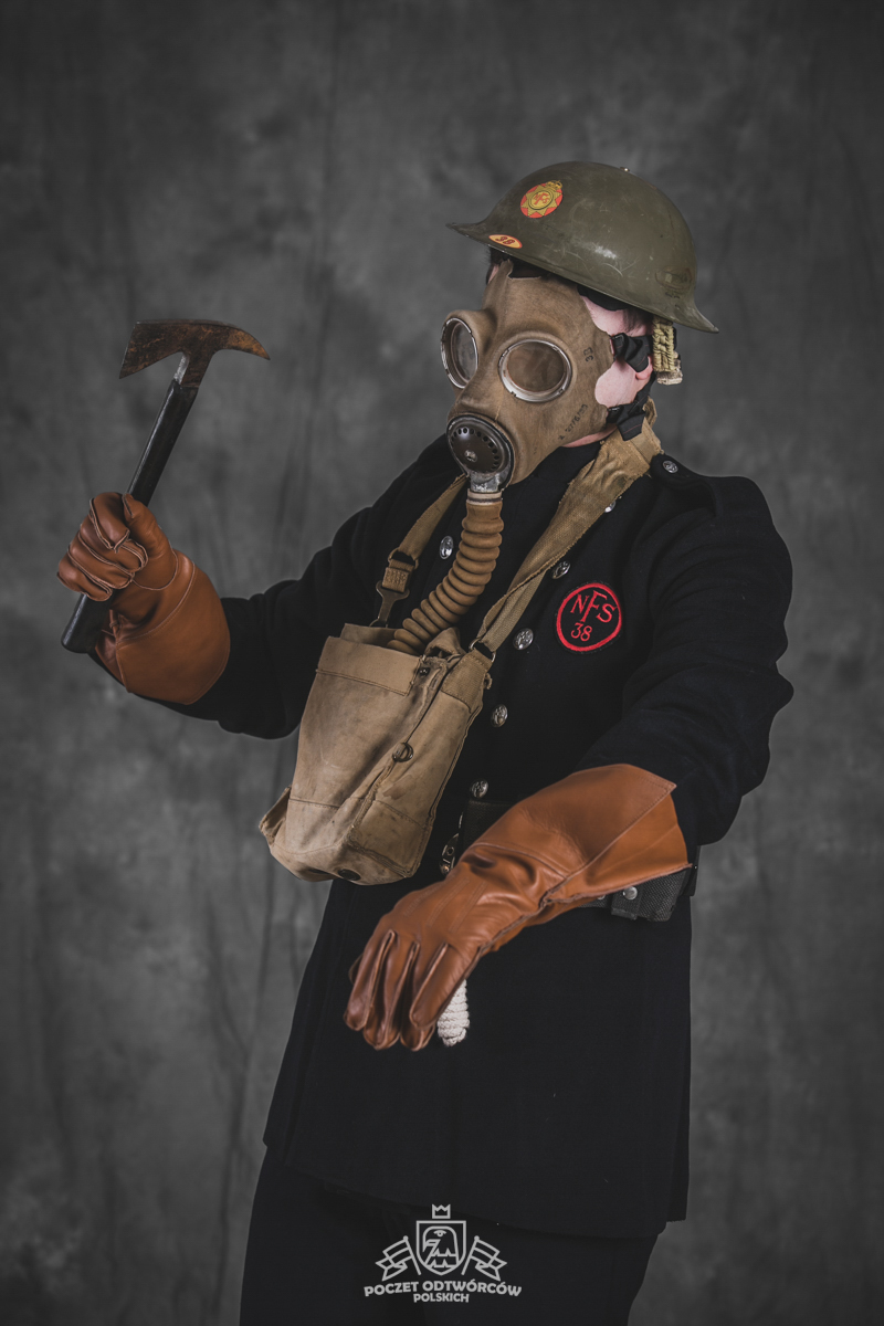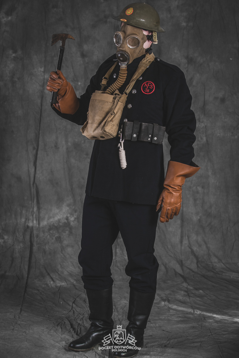 Pomalowany na zielono hełm Mk II z kalkomanią odznaki NFS oraz dystryktu ogniowego, w którym służy strażak (numer 38 oznacza Wimbledon w południowo-zachodnim Londynie). Granatowa dwurzędowa kurtka mundurowa uszyta z grubej wełny, zapinana na prawą stronę na 6 srebrzonych guzików z wystylizowanymi literami „NFS” oraz z naszytym na lewej piersi, haftowanym na czerwono emblematem NFS i numerem dystryktu ogniowego. Granatowe, wełniane spodnie oraz granatowa wełniana czapka z lakierowanym daszkiem i czerwoną lamówką oraz odznaką NFS. Wysokie skórzane buty z cholewami, w typie butów marynarskich – tzw. seabootsów lub saperek. Parciany pas główny z pięcioma oczkami do regulacji rozmiaru, zapinany na pojedynczy bolec, toporek z futerałem, zrolowana linka ratownicza, skórzane rękawice wzoru dla motocyklistów, maska przeciwgazowa typu Mk V w torbie. Wszystkie elementy umundurowania poza rękawicami są oryginalne.