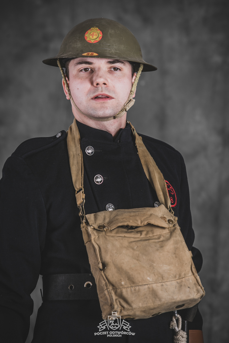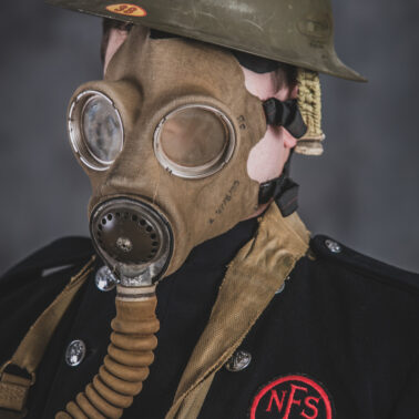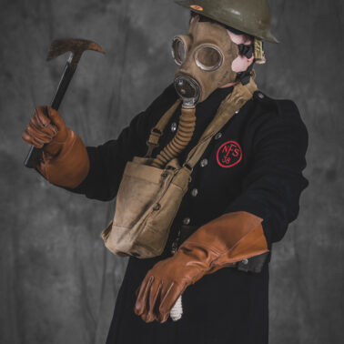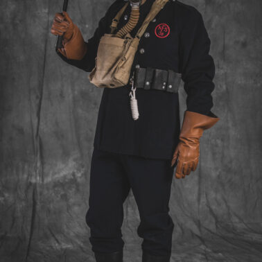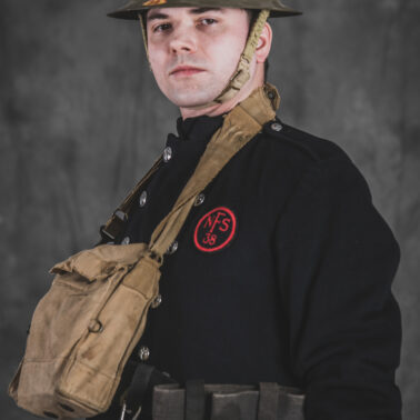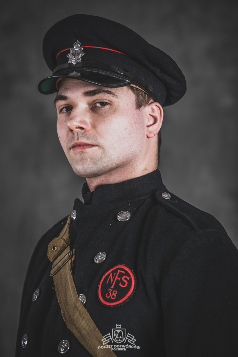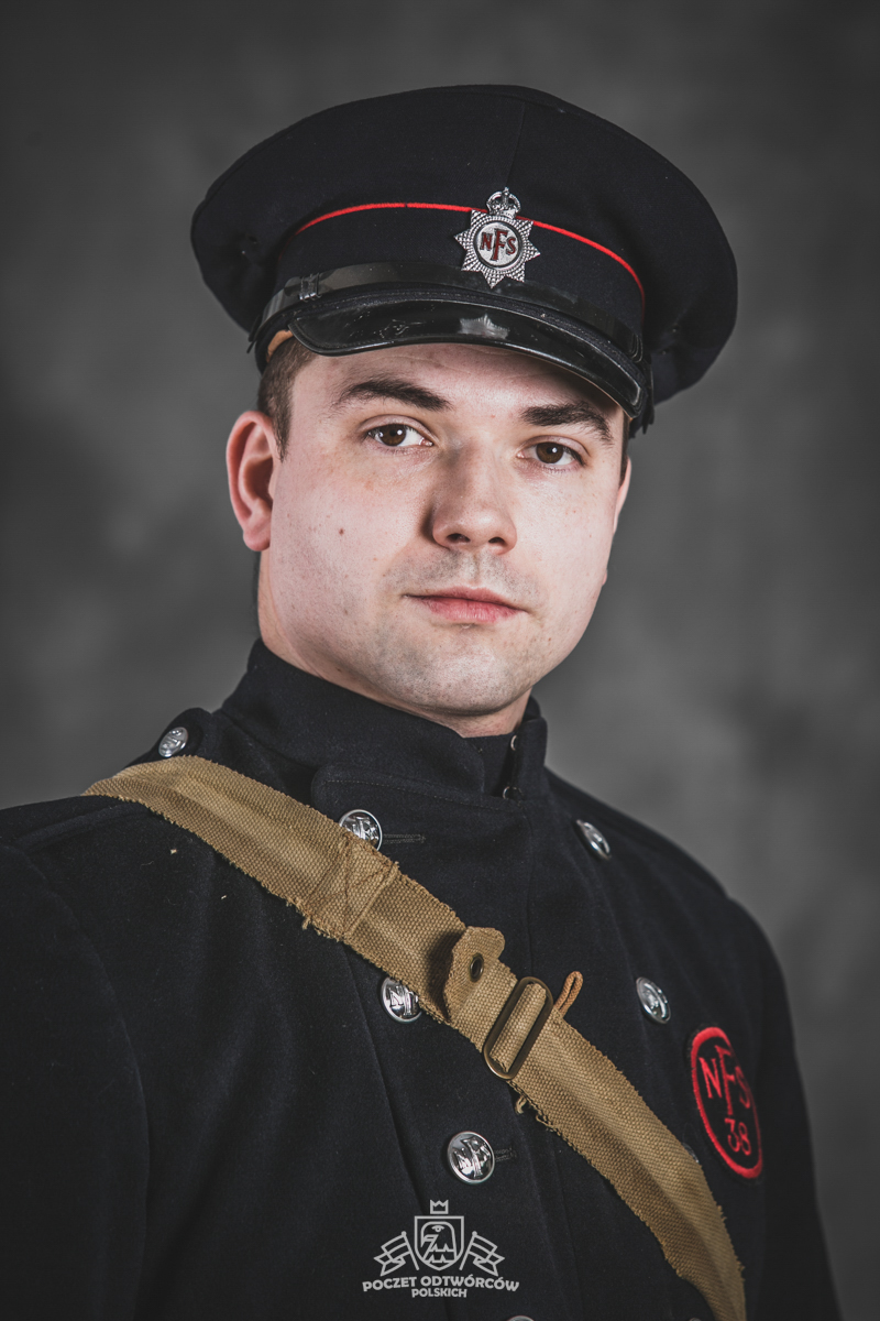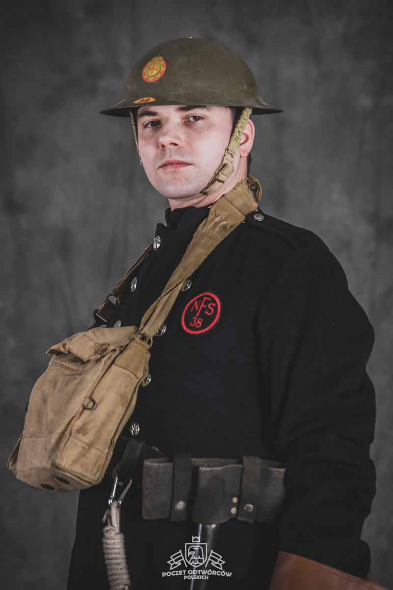 Pomalowany na zielono hełm Mk II z kalkomanią odznaki NFS oraz dystryktu ogniowego, w którym służy strażak (numer 38 oznacza Wimbledon w południowo-zachodnim Londynie). Granatowa dwurzędowa kurtka mundurowa uszyta z grubej wełny, zapinana na prawą stronę na 6 srebrzonych guzików z wystylizowanymi literami „NFS” oraz z naszytym na lewej piersi, haftowanym na czerwono emblematem NFS i numerem dystryktu ogniowego. Granatowe, wełniane spodnie oraz granatowa wełniana czapka z lakierowanym daszkiem i czerwoną lamówką oraz odznaką NFS. Wysokie skórzane buty z cholewami, w typie butów marynarskich – tzw. seabootsów lub saperek. Parciany pas główny z pięcioma oczkami do regulacji rozmiaru, zapinany na pojedynczy bolec, toporek z futerałem, zrolowana linka ratownicza, skórzane rękawice wzoru dla motocyklistów, maska przeciwgazowa typu Mk V w torbie. Wszystkie elementy umundurowania poza rękawicami są oryginalne.
