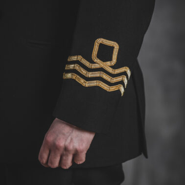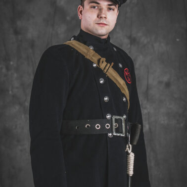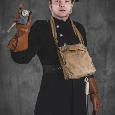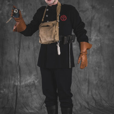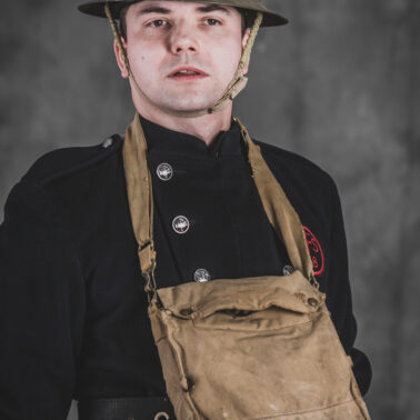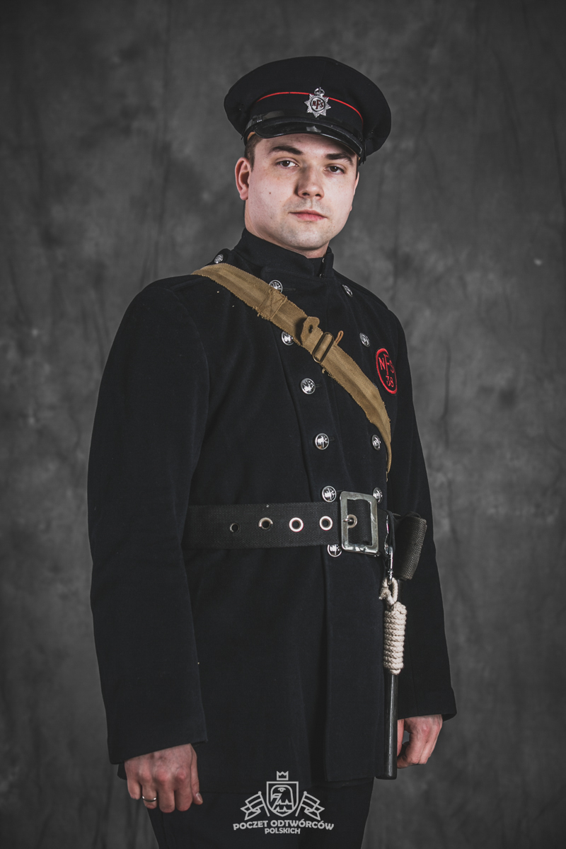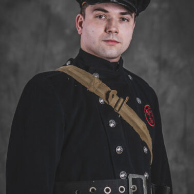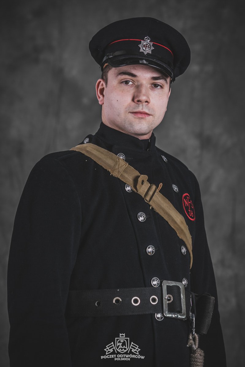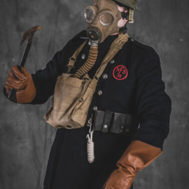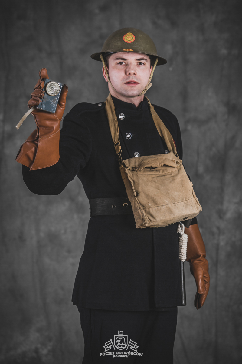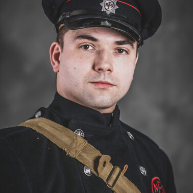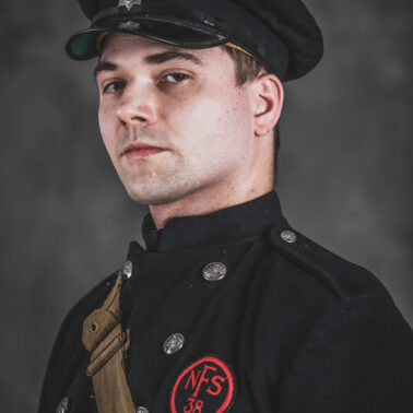 Pomalowany na zielono hełm Mk II z kalkomanią odznaki NFS oraz dystryktu ogniowego, w którym służy strażak (numer 38 oznacza Wimbledon w południowo-zachodnim Londynie). Granatowa dwurzędowa kurtka mundurowa uszyta z grubej wełny, zapinana na prawą stronę na 6 srebrzonych guzików z wystylizowanymi literami „NFS” oraz z naszytym na lewej piersi, haftowanym na czerwono emblematem NFS i numerem dystryktu ogniowego. Granatowe, wełniane spodnie oraz granatowa wełniana czapka z lakierowanym daszkiem i czerwoną lamówką oraz odznaką NFS. Wysokie skórzane buty z cholewami, w typie butów marynarskich – tzw. seabootsów lub saperek. Parciany pas główny z pięcioma oczkami do regulacji rozmiaru, zapinany na pojedynczy bolec, toporek z futerałem, zrolowana linka ratownicza, skórzane rękawice wzoru dla motocyklistów, maska przeciwgazowa typu Mk V w torbie. Wszystkie elementy umundurowania poza rękawicami są oryginalne.