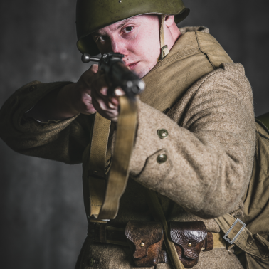 Jest to typowa sylwetka szeregowego piechoty 1 Dywizji Piechoty im. Tadeusza Kościuszki. Żołnierze rzuceni do boju pod Połzuchami i Trygubową byli w pełni umundurowani i wyposażeni na standard roku 1943. Byli wyposażani w uproszczone wyposażenie, przystosowane do masowej produkcji, wydawane także czerwonoarmistom. Elementy polskie stanowiły bluza z guzikami z orłem bez korony, rogatywka, oraz płaszcz.