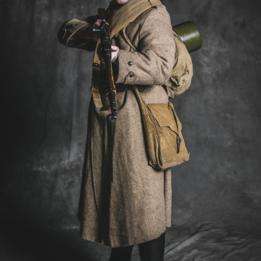 Bluza wzoru polskiego szyta z sowieckiego drelichu, płaszcz wzoru polskiego z sowieckiego sukna nie poddanego barwieniu (tzw. kawa z mlekiem), spodnie sowieckie wz. 35, trzewiki dla szeregowych w odmianie ze skórzaną podeszwą i trykotowymi owijaczami, pas zastępczy – parciano skórzany. Na pasie manierka 0.5l, łopatka piechoty w uproszczonym pokrowcu, skórzana ładownica P39 produkcji brytyjskiej (pozostałość dostawach dla formowanej w ZSRR armii gen. Andersa), oraz parciana pochwa na bagnet karabinu Mosin, przez pierś przełożona zrolowana pałatka przeciwdeszczowa, oraz torba na maskę przeciwgazową wraz z zawartością. Na głowie hełm ssh40, na plecach plecak mieszok w odmianie z taniego drelichu, w plecaku zapasowa bielizna, onuce, przybornik do karabinu Mosin, oraz rogatywka wzoru polskiego wraz z orłem tzw. kuricą w odmianie moskiewskiej, oraz racje żywnościowe. Uzbrojenie: karabin Mosin 91/30 rocznik 1942 wraz z bagnetem tulejowym.