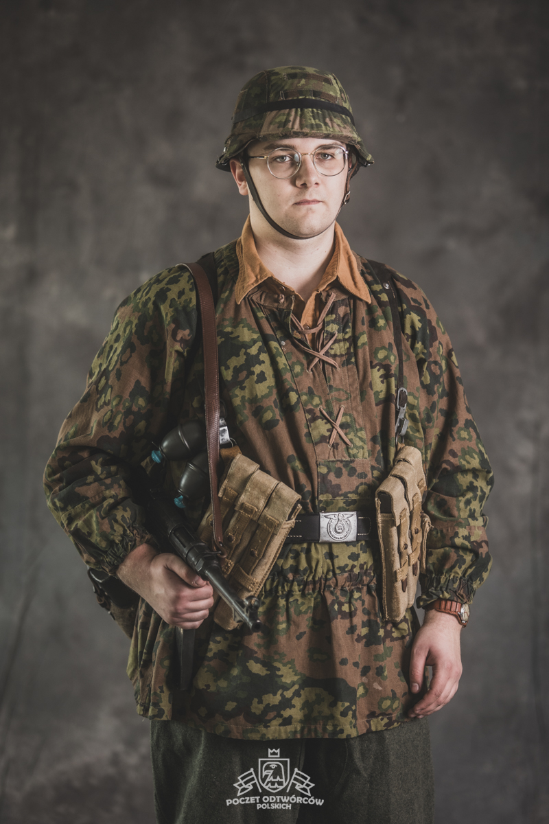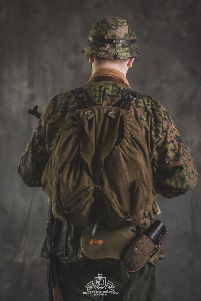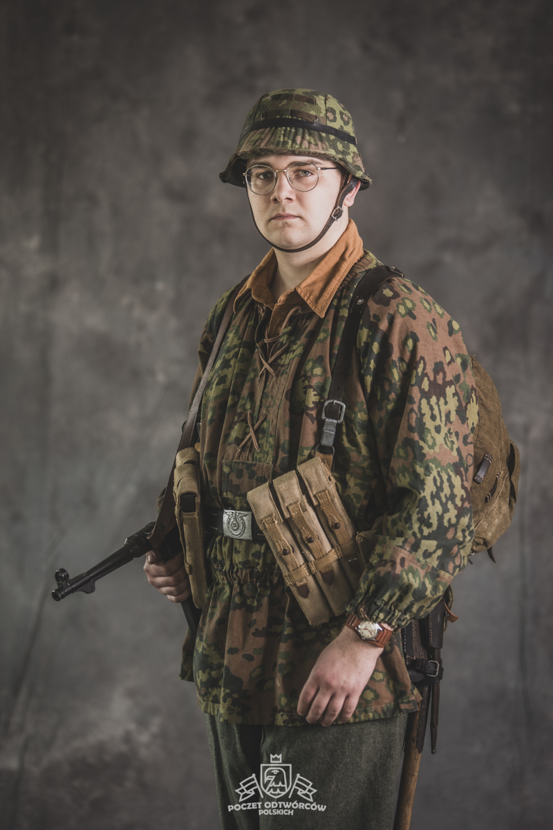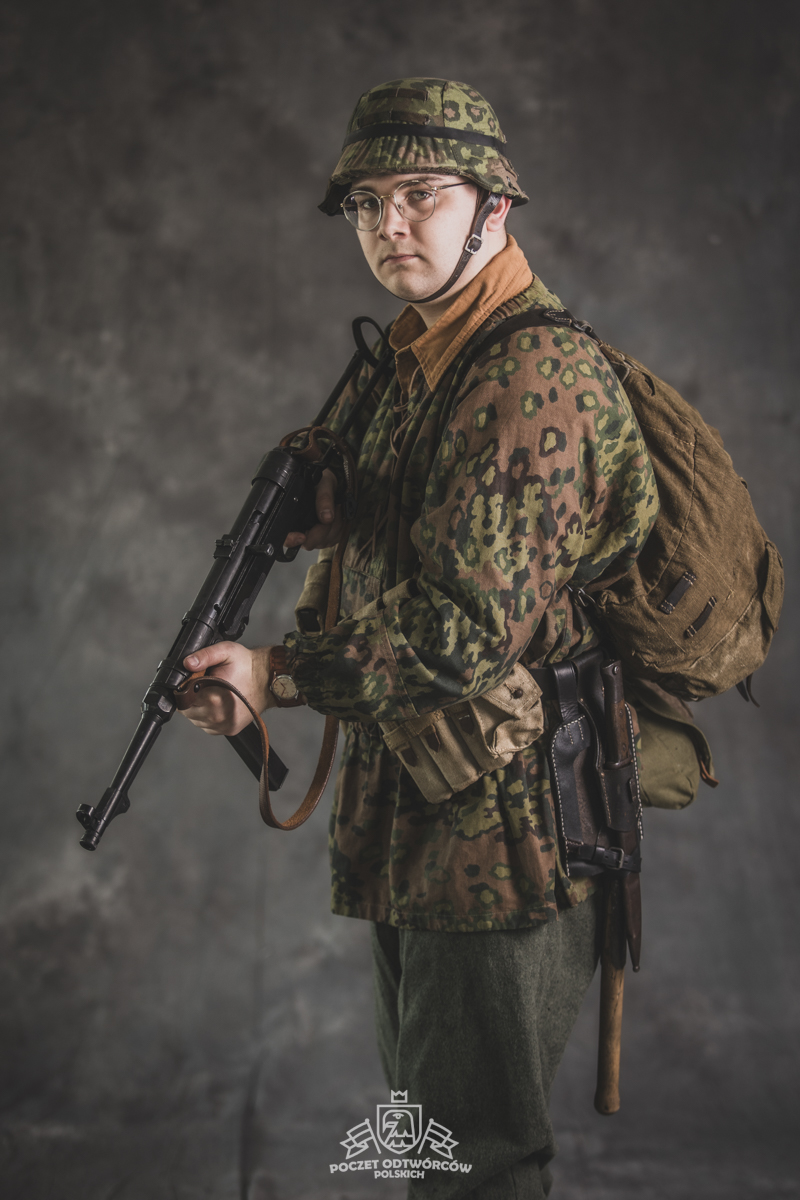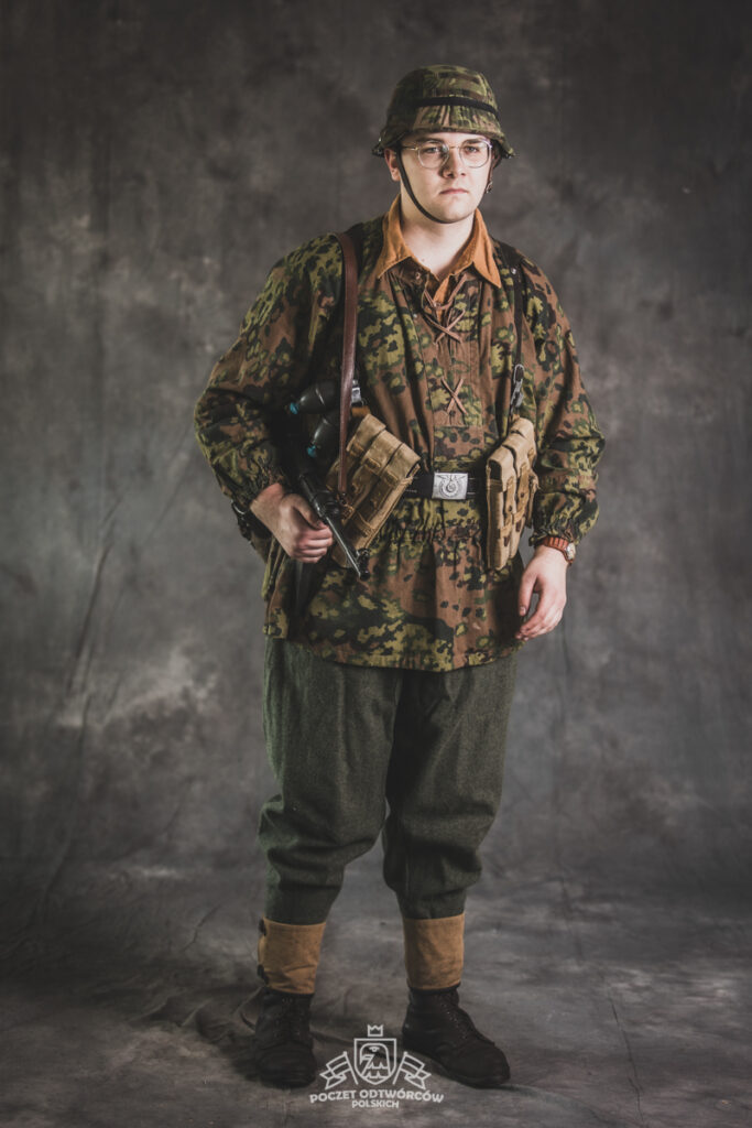 Umundurowanie żołnierza dywizji grenadierów składało się z koszuli mundurowej Braunenhemd M32, spodni sukiennych Feldhose M43, czapki polowej Feldmutze M43, bluzy kangurki/smock M40 z odwracalnym kamuflażem Eichenlaubmuster, hełmu Stalhelm M42 w pokrowcu odwracalnym M43 (także w kamuflażu Eichenlaumuster z gumą zrobioną z dętki). Na nogach trzewiki skórzane M43 i opinacze środkowowojenne. Pas główny w kolorze czanym Feldkoppel z klamrą aluminiową dla SS z cytatem „,,Meine Ehre heißt Treue’’ – ,,Moim honorem jest wierność”. Uzupełnienie stanowiły szelki bojowe Koppeltragegestel M39, komplet.2 ładownic (potrójnych) dla Mp-38/Mp-40 wykonanych z brezentu i parcianych pasków (każdy na 3 magazynki po 32 sztuki amunicji). Na ręce zegarek Delbana. W chlebaku Brotbeutel M42 (wersja środkowowojenna) znajdowały się m.in. puszka z przyborami do higieny osobistej, opatrunek, przybornik do szycia oraz przybory prywatne. Na stanie również manierka Feldflasche M31 z kubkiem. Plecak M31 „Kriegsmodell” zawierał m.in. bluzę sukienną Feldbluse M42, pelerynę przeciwdeszczową Zeltbahn (również w kamuflażu – Platanentarn/Eichentarn 1/2 overprint), koc wojskowy, rzeczy osobiste, przybornik wraz z akcesoriami do czyszczenia broni oraz menażkę Kochgeschirr M31 wraz z niezbędnikiem przydziałowym. W plecakach żołnierze przechowywali również prowiant. W skórzanym pokrowcu znajdowała się łopatka piechoty Feldspaten. Żołnierze posługiwali się bagnetem S84/98 (dedykowanym do karabinów systemu Mausera). Dalszą przydziałową bronią były dwa granaty Model 39 grenade (Eihandgranate 39), tzw. „Jajka” oraz Mp-40 kal 9×19 mm Parabellum. Dodatkowo żołnierze posiadali scyzoryki Wusthof Gladiator, papierosy, Soldbuch SS oraz inne dokumenty związane ze służbą.