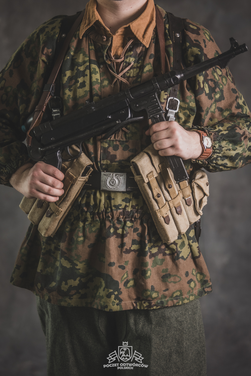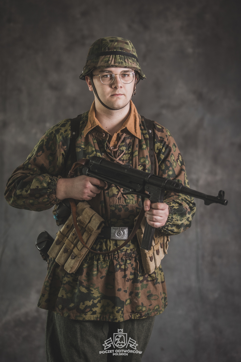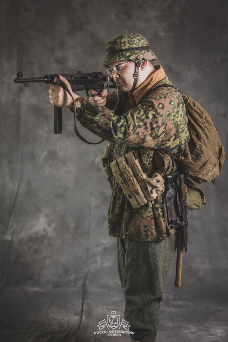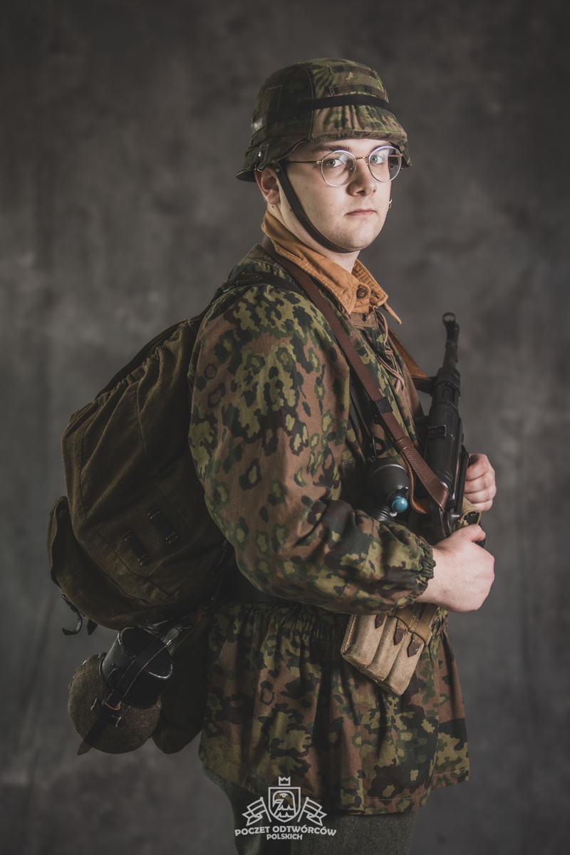 Umundurowanie żołnierza dywizji grenadierów składało się z koszuli mundurowej Braunenhemd M32, spodni sukiennych Feldhose M43, czapki polowej Feldmutze M43, bluzy kangurki/smock M40 z odwracalnym kamuflażem Eichenlaubmuster, hełmu Stalhelm M42 w pokrowcu odwracalnym M43 (także w kamuflażu Eichenlaumuster z gumą zrobioną z dętki). Na nogach trzewiki skórzane M43 i opinacze środkowowojenne. Pas główny w kolorze czanym Feldkoppel z klamrą aluminiową dla SS z cytatem „,,Meine Ehre heißt Treue’’ – ,,Moim honorem jest wierność”. Uzupełnienie stanowiły szelki bojowe Koppeltragegestel M39, komplet.2 ładownic (potrójnych) dla Mp-38/Mp-40 wykonanych z brezentu i parcianych pasków (każdy na 3 magazynki po 32 sztuki amunicji). Na ręce zegarek Delbana. W chlebaku Brotbeutel M42 (wersja środkowowojenna) znajdowały się m.in. puszka z przyborami do higieny osobistej, opatrunek, przybornik do szycia oraz przybory prywatne. Na stanie również manierka Feldflasche M31 z kubkiem. Plecak M31 „Kriegsmodell” zawierał m.in. bluzę sukienną Feldbluse M42, pelerynę przeciwdeszczową Zeltbahn (również w kamuflażu – Platanentarn/Eichentarn 1/2 overprint), koc wojskowy, rzeczy osobiste, przybornik wraz z akcesoriami do czyszczenia broni oraz menażkę Kochgeschirr M31 wraz z niezbędnikiem przydziałowym. W plecakach żołnierze przechowywali również prowiant. W skórzanym pokrowcu znajdowała się łopatka piechoty Feldspaten. Żołnierze posługiwali się bagnetem S84/98 (dedykowanym do karabinów systemu Mausera). Dalszą przydziałową bronią były dwa granaty Model 39 grenade (Eihandgranate 39), tzw. „Jajka” oraz Mp-40 kal 9×19 mm Parabellum. Dodatkowo żołnierze posiadali scyzoryki Wusthof Gladiator, papierosy, Soldbuch SS oraz inne dokumenty związane ze służbą.