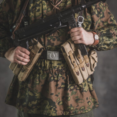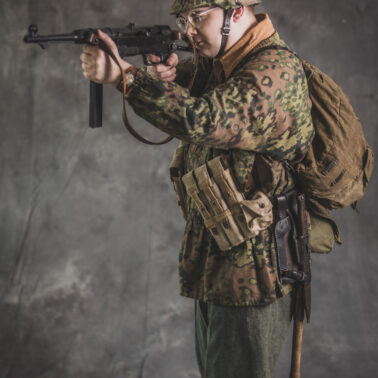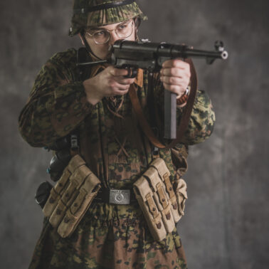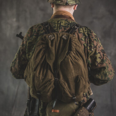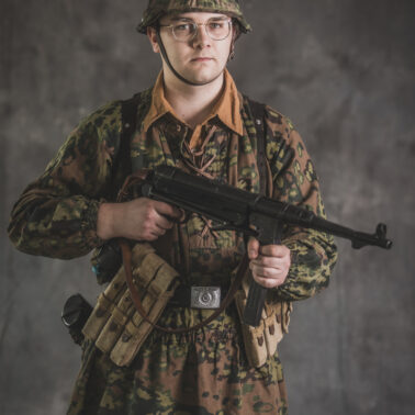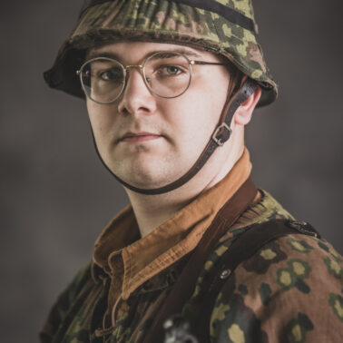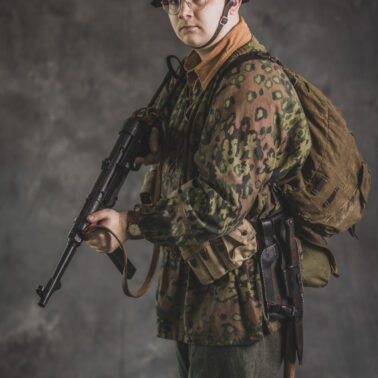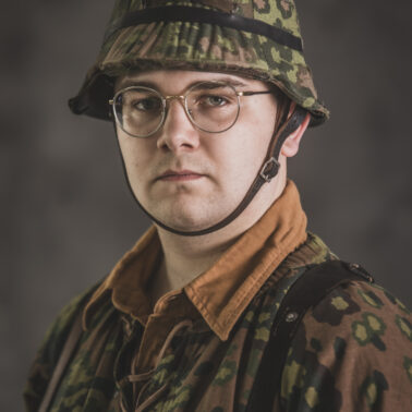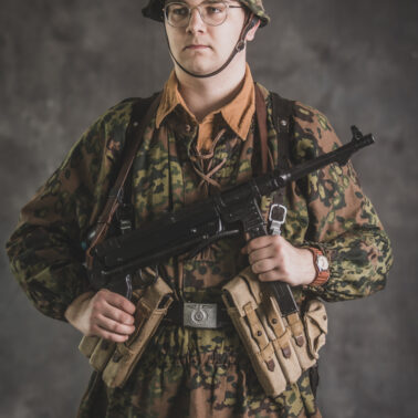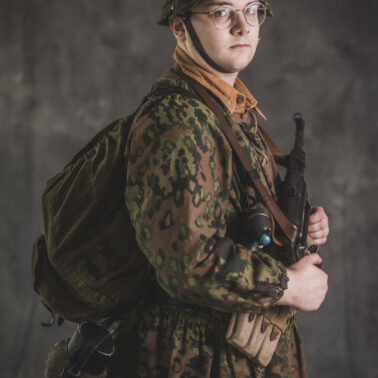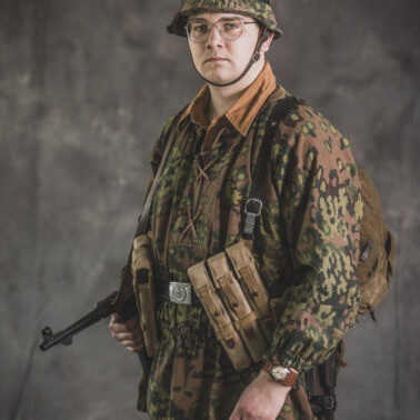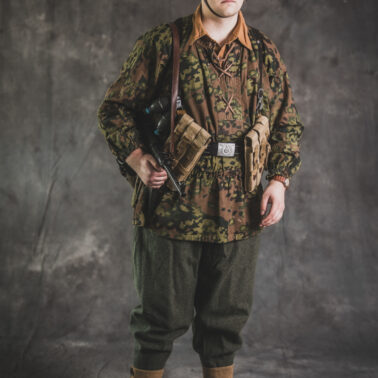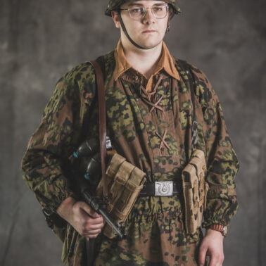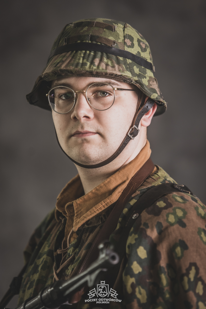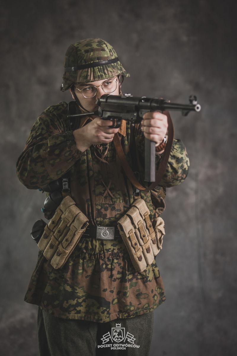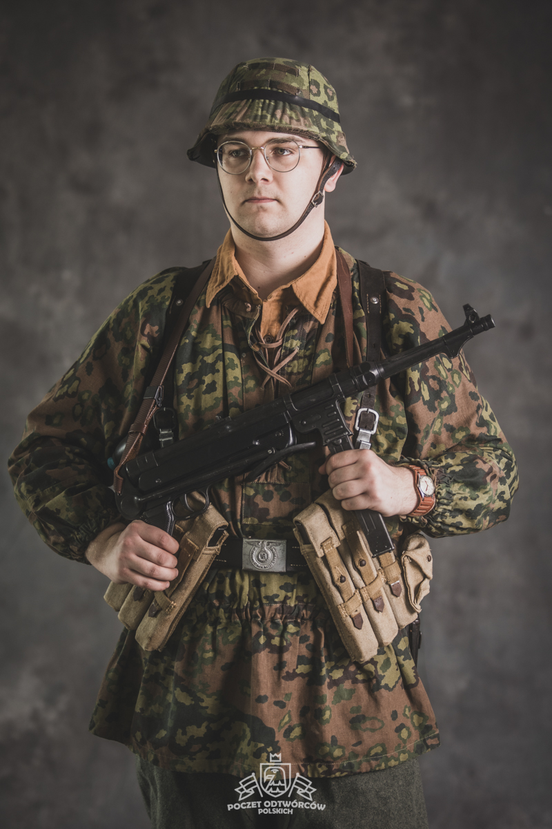 Umundurowanie żołnierza dywizji grenadierów składało się z koszuli mundurowej Braunenhemd M32, spodni sukiennych Feldhose M43, czapki polowej Feldmutze M43, bluzy kangurki/smock M40 z odwracalnym kamuflażem Eichenlaubmuster, hełmu Stalhelm M42 w pokrowcu odwracalnym M43 (także w kamuflażu Eichenlaumuster z gumą zrobioną z dętki). Na nogach trzewiki skórzane M43 i opinacze środkowowojenne. Pas główny w kolorze czanym Feldkoppel z klamrą aluminiową dla SS z cytatem „,,Meine Ehre heißt Treue’’ – ,,Moim honorem jest wierność”. Uzupełnienie stanowiły szelki bojowe Koppeltragegestel M39, komplet.2 ładownic (potrójnych) dla Mp-38/Mp-40 wykonanych z brezentu i parcianych pasków (każdy na 3 magazynki po 32 sztuki amunicji). Na ręce zegarek Delbana. W chlebaku Brotbeutel M42 (wersja środkowowojenna) znajdowały się m.in. puszka z przyborami do higieny osobistej, opatrunek, przybornik do szycia oraz przybory prywatne. Na stanie również manierka Feldflasche M31 z kubkiem. Plecak M31 „Kriegsmodell” zawierał m.in. bluzę sukienną Feldbluse M42, pelerynę przeciwdeszczową Zeltbahn (również w kamuflażu – Platanentarn/Eichentarn 1/2 overprint), koc wojskowy, rzeczy osobiste, przybornik wraz z akcesoriami do czyszczenia broni oraz menażkę Kochgeschirr M31 wraz z niezbędnikiem przydziałowym. W plecakach żołnierze przechowywali również prowiant. W skórzanym pokrowcu znajdowała się łopatka piechoty Feldspaten. Żołnierze posługiwali się bagnetem S84/98 (dedykowanym do karabinów systemu Mausera). Dalszą przydziałową bronią były dwa granaty Model 39 grenade (Eihandgranate 39), tzw. „Jajka” oraz Mp-40 kal 9×19 mm Parabellum. Dodatkowo żołnierze posiadali scyzoryki Wusthof Gladiator, papierosy, Soldbuch SS oraz inne dokumenty związane ze służbą.