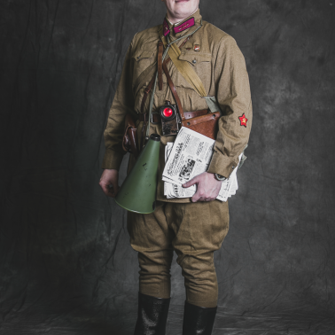 Regulaminowy mundur żołnierski wprowadzony przepisami z 1935 roku składał się z drelichowej koszulo-bluzy tzw. Gimnastiorki oraz spodni bryczesów. Czapka służbowa wz.35 była kojarzona bardziej z personelem dowódczym – ale przysługiwała każdemu czerwonoarmiście do munduru służbowego. Na kołnierzu malinowe patki z czarną lamówka – oznaczające przynależność do piechoty. Na każdej patce po 4 „trójkąty” oznaczające stopień równy podoficerowi. Na rękawach czerwone gwiazdy – oznaki przynależności do korpusu pracownikow polityczno-wychowawczych Armii Czerwonej. Buty z gumową podeszwą wykonane z tzw. Kirzy czyli surogatu skóry produkowanego z pokrytego guma brezentu. Na mundurze odznaka Komsomołu oraz Związku Antyalkoholowego („Alkoholizm i Socjalizm nie łączą się!” Wyposażenie stanowi pas skórzany, rewolwer Nagant w kaburze, maska przeciwgazowa w torbie wz.36, manierka, sygnałowa latarka produkcji niemieckiej oraz mapnik. Dodatkowymi elementami potrzebnymi do pełnienia funkcji oświatowej są tuba głosowa tzw. „szczekaczka” oraz świeżo wydrukowane egzemplarze gazety Prawda, Komsomolska Prawda oraz Pionierska Prawda. Sylwetka przygotowana na podstawie regulaminów Armii Czerwonej.