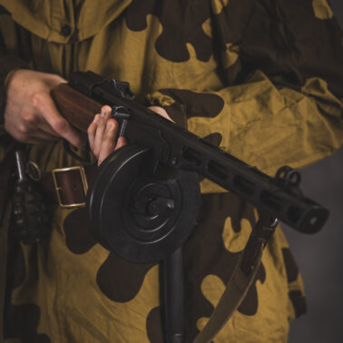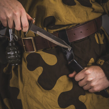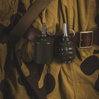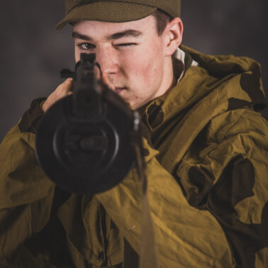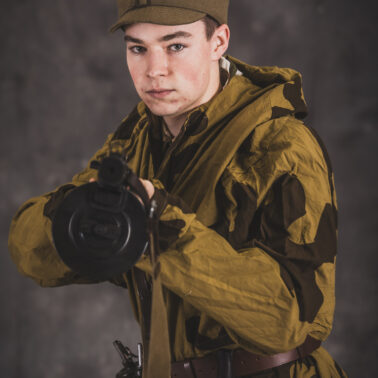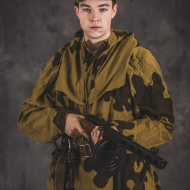 Sapogi kirzowe, Bryczesy obr 35, Kurtka mundurowa wz 43, Rogatywka wz 43 z Kuricą Moskiewską, Kombinezon maskujący typu Ameba, Pas główny Garison Belt z Lend Lease, Manierka aluminiowa obr 32, pokrowiec na manierkę obr 41, Nóż szturmowy Zik 40, Pistolet maszynowy Ppsz 41 grant f1 oraz rg42.
