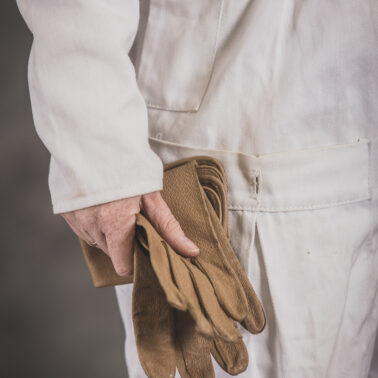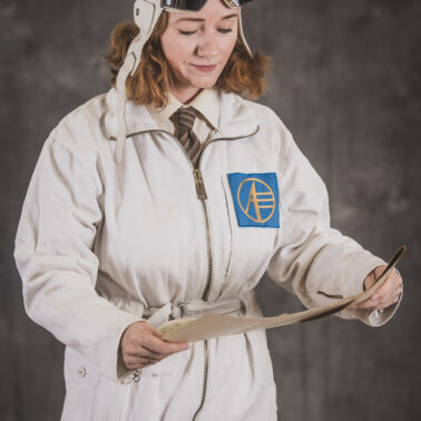 replika kombinezonu lotniczego bawełnianego z naszywką Aeroklubu, oryginalna pilotka biała skórzana oraz gogle lotnicze, buty i rękawice skórzane.