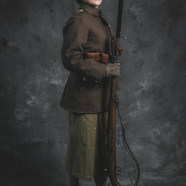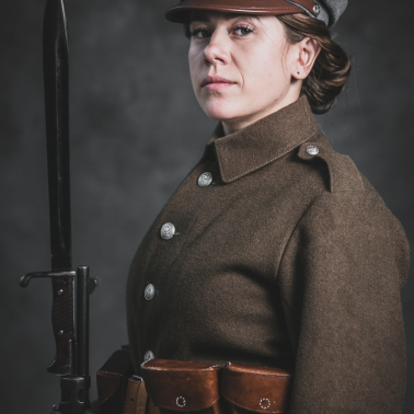 Czapka Maciejówka z orzełkiem wz. 1919, kurtka mundurowa wz. 1919, wełniana spódnica z kontrafałdami, pas skórzany jednobolcowy, ładownice podwójne Mannlicher M95, bagnet niemiecki wz. S 84/88 typu liść, rękawiczki, trzewiki sznurowane, karabin wz. 1989 Mauser kal 7,92 mm. Zrekonstruowane na podstawie dokumentacji i zachowanych artefaktów z epoki oraz kwerendy fotograficznej.
