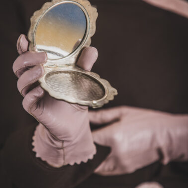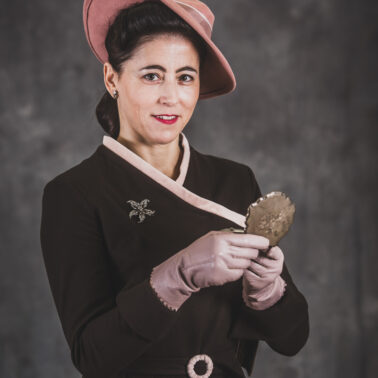 Sukienka uszyta wg oryginalnego wykroju z pisma modowego z lat 30. (amerykański miesięcznik „McCall’s Magazine”). Wykonana jest z cieniutkiej wełny w kolorze ciepłego, czekoladowego brązu, wykończona aksamitną wstawką w okolicach dekoltu. Zapinana z przodu na metalowe zatrzaski, dodatkowo posiada materiałowy pasek podkreślający talię. Stylizację uzupełniają dodatki utrzymane w kolorystyce pudrowego różu: cienkie skórzane rękawiczki, skórzane buciki, na niewysokim obcasie oraz kapelusz wykonany współcześnie na podstawie historycznych zdjęć, ozdobiony szeroką aksamitną taśmą w nieco ciemniejszym odcieniu. Prezentowana torebka jest elementem oryginalnym – skórzana kopertówka została wykonana ręcznie. Biżuteria: klipsy oraz brosza zdobiąca sukienkę, również pochodzą z lat 30. ubiegłego wieku. Efektownym dodatkiem jest przedwojenna srebrna puderniczka – rodzinna pamiątka po Babci. Wieczko puderniczki zdobione jest grawerem z motywem kwiatowym. Różowe buciki wykonane ze skóry – pantofle, na masywnym ale modelowanym obcasie, wiązane z przodu. Czubek buta ma formę zaokrągloną, kształtem przypomina nieco migdał. Na nogach widać także pończochy w cielistym odcieniu z charakterystycznym czarnym szwem z tyłu i wzmocnionym wykończeniem pięt oraz stóp. Było to typowe dla jedwabnych pończoch produkowanych na ówczesnych maszynach dziewiarskich. Wzmocnienie pięty w wyprodukowanych współcześnie pończochach ma kształt trójkątny – wskazuje to na inspirację tzw. wykończeniem w stylu Point Heel wywodzącym się z Europy.