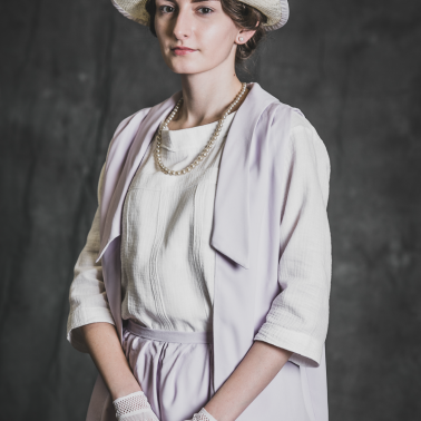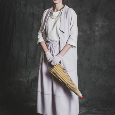 Kremowe pantofle, białe pończochy, biała bluzka, różowy kostium, koronkowe rękawiczki, kapelusz z kokardą, naszyjnik i kolczyki z pereł oraz parasolka na podstawie rycin modowych i wykrojów z epoki.