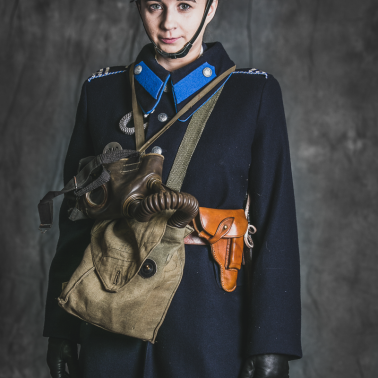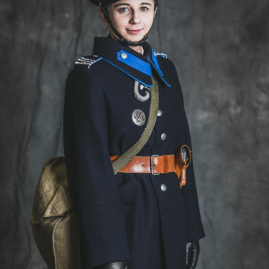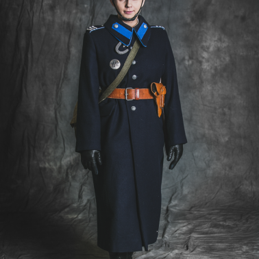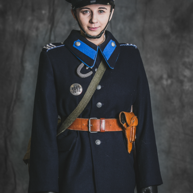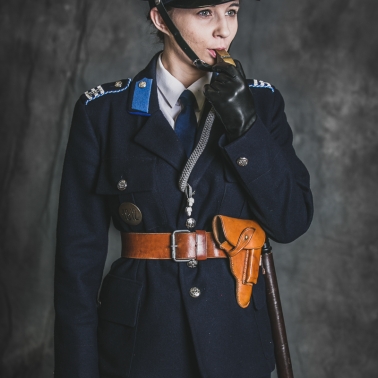 Funkcjonariuszka ma na sobie mundur wz.36 na Glowie czapka z założoną podpinką na brodę. W dłoni znajduje się gwizdek policyjny nowego wzoru. Kurtka french z wyłożonymi klapami odróżniała funkcjonariuszki od swoich kolegów których kurtki miały wysoki kołnierz. Na pasie znajduje się pałka policyjna oraz kabura z pistoletem FN 1910 browning. Kabura również w odróżnieniu od swoich kolegów znajduje się po lewej stronie. Spódnica oraz buty na obcasie były kolejnymi wyróżnikami policji kobiecej. Na naramiennikach 3 belki z oznaczeniem stopnia oraz bialo chabrowa taśma która oznaczała cenzus.