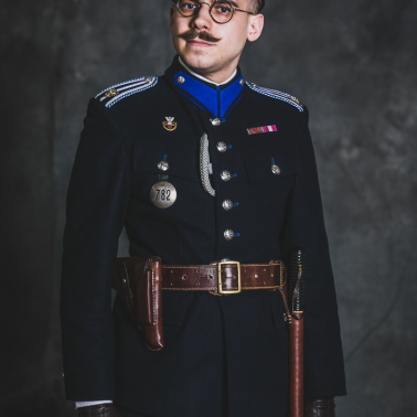 Rekonstrukcja umundurowania sukiennego wz.36. Replika czapki z oryginalnym orłem państwowym wz.27, pas oficerski wz. 36 z 1937 roku, kurtka mundurowa, oraz spodnie bryczesy, rękawiczki skórzane, buty oficerskie kroju przedwojennego. Odznaczenia: -Srebrna odznaka P.O.S, baretka brązowego krzyża zasługi RP, baretka medalu za długoletnią służbę, odznaka identyfikacyjna funkcjonariusza. Wyposażenie służbowe -pistolet Walther PPK w skórzanym futerale i pałka służbowa w długiej wersji, żabka.