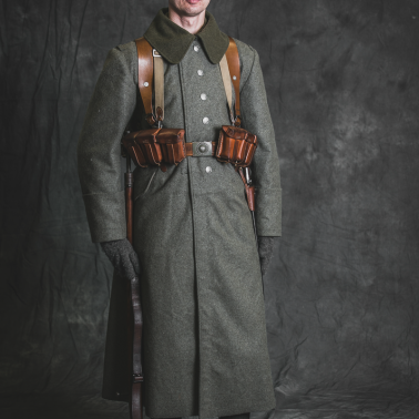 Płaszcz niemiecki M15, mundur niemiecki M15, maciejowka wz.17, ładownice m1909, bagnet m98/05, karabin mauser wz.98, chlebak m1893, tornister m15.