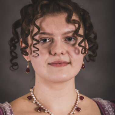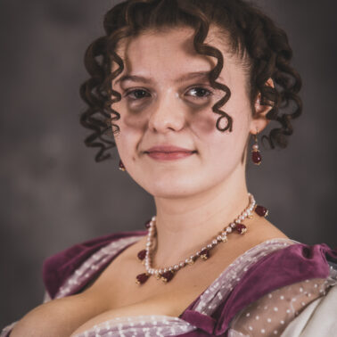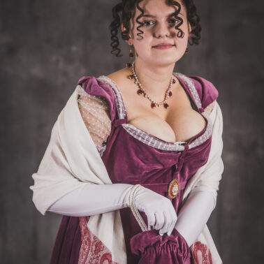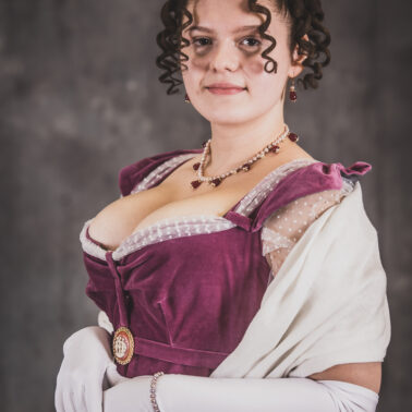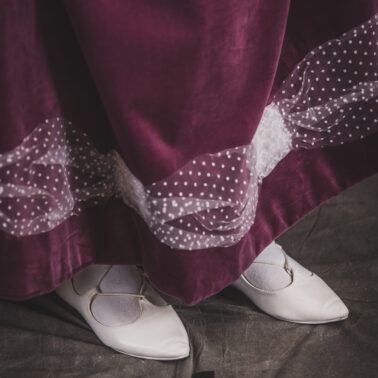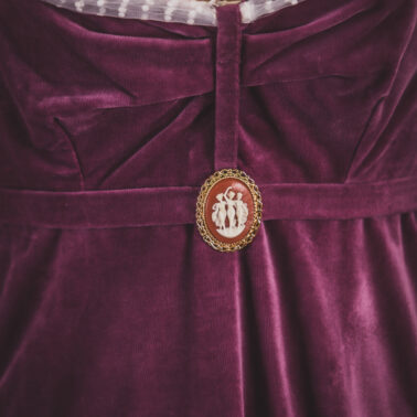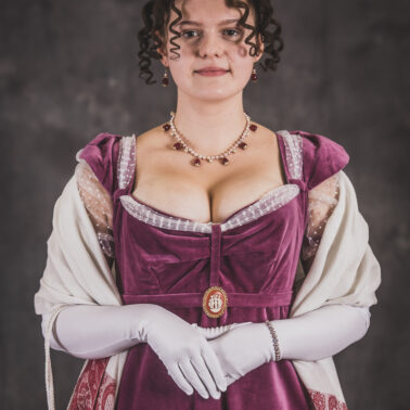 Niewidoczne elementy bieliźniane -> lniana koszula, długi satynowy gorset, bawełniana halka tzw. petticoat. Z wierzchu suknia balowa z różowego bawełnianego aksamitu z tiulowymi aplikacjami i bufiastymi rękawkami. Długie białe balowe rękawiczki. Broszka-kamea przedstawiająca trzy Gracje. Biżuteria z pereł naturalnych i czerwonych jadeitów. Sylwetkę dopełnia torebka reticule, kaszmirowy szal oraz wiązane białe baletki.