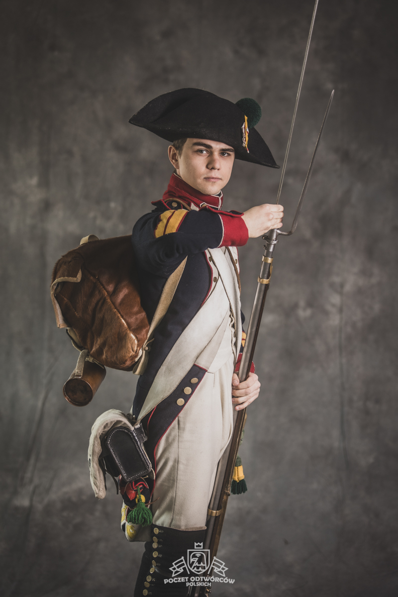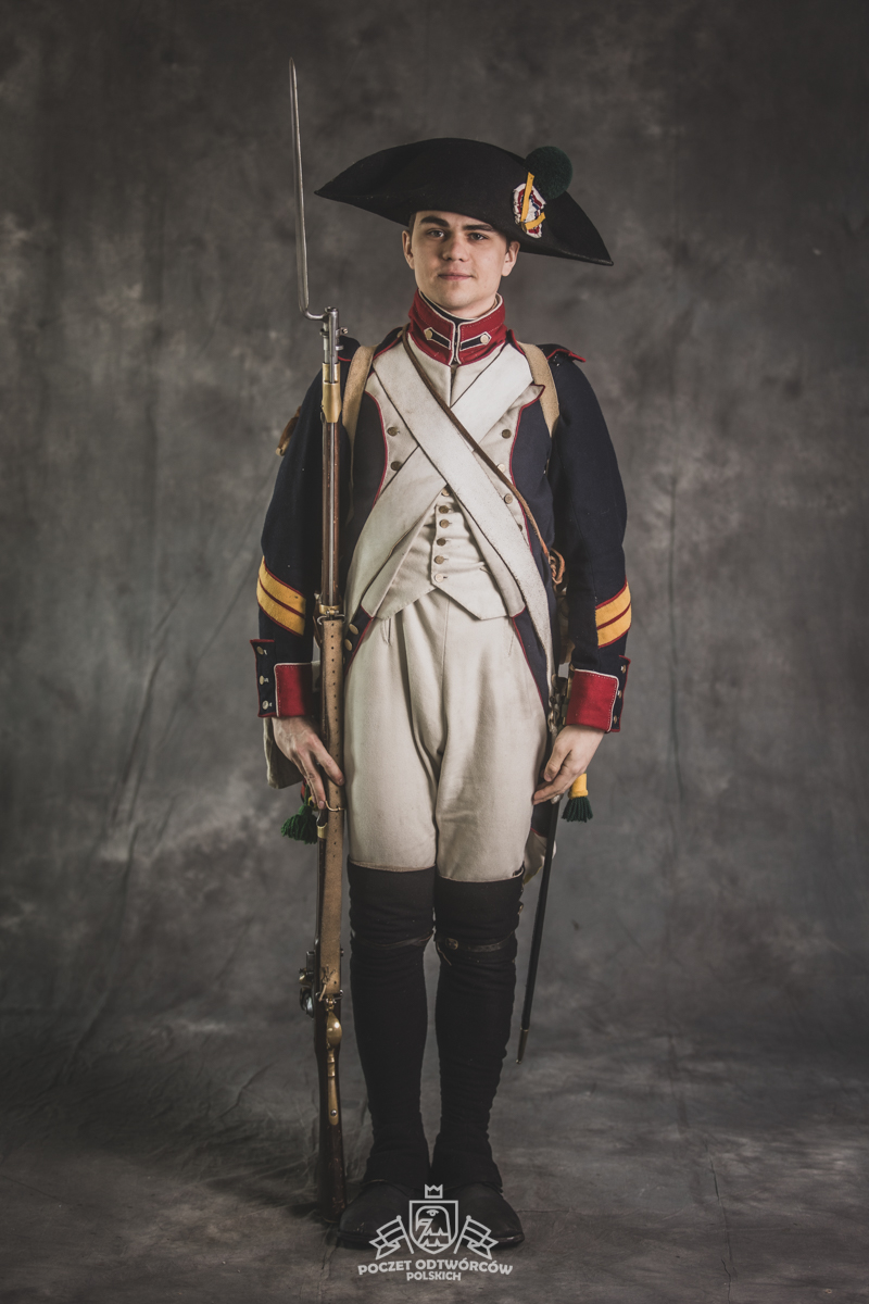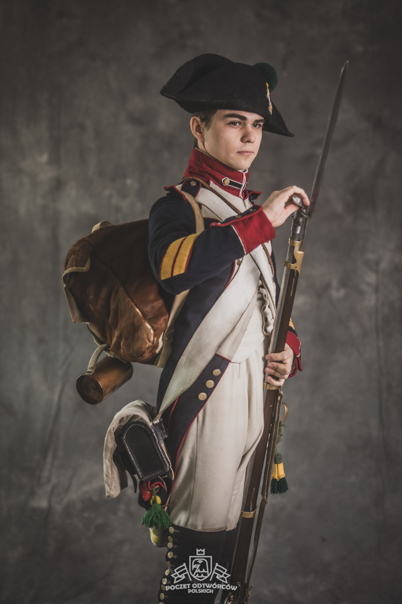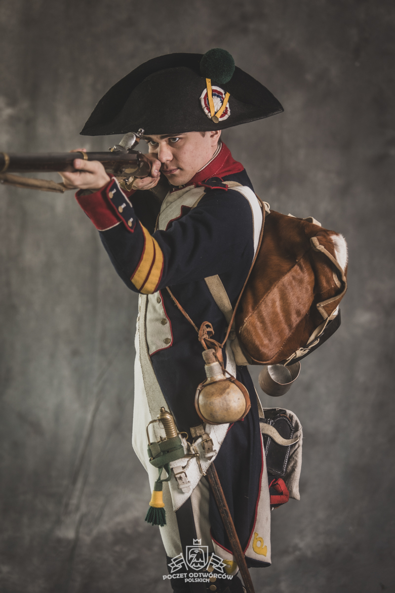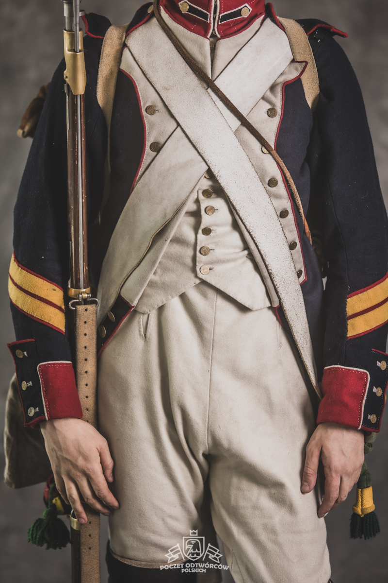 Chapeau Bicorn- dwurożny kapelusz filcowy z dużym guzikiem z numerem pułku, kokardą rewolucyjną, zielonym pomponem i żółtą taśmą w splocie cul de de. Col noir – halsztuk czarny zapinany pod szyją mosiężną klamrą. Chemise – koszula lniana. Veste- lejbik sukienny ”wczesny” fizylierski wg wzoru z 1787, zapinany na mosiężne guziki z wybitym numerem pułku. Habit – frak, z patkami fizylierskimi, z pąsowymi mankietami i jeszcze pąsowym kołnierzem. Na obu rękawach widoczne belki sugerujące stopień kaprala, wszyte w rękaw. Culottes – krótkie spodnie z białego sukna zachodzące za kolano. Guêtres noires – wysokie kamasze z czarnego sukna, z lnianą podszewką, zapinane na 24 gładkie guziki mosiężne. Chaussures – buty podkute. Baïonnette de Fusil 1777 corrigé en l’an IX : Bagnet do karabinu mle 1777, modyfikacji roku IX. (wg kalendarza rewolucyjnego) Giberne mle 1801 – ładownica z paskami do troczenia bonnet de police, czyli furażerki. Na klapę ładownicy, patelette, nałożone jest couvre de giberne, czyli lniany pokrowiec z naniesionym emblematem trąbki: Znaku rozpoznawczego kompanii woltyżerskich. Dodatkowo widoczny numer pułku. W ładownicy znajdować powinno się 35 cartouches – pocisków. W ładownicy olejarka i szmatka do czyszczenia panewki. Na klatce piersiowej widoczne skrzyżowane dwa pasy wołowe wyprawione tłuszczowo, farbowane na biało. Pierwszy z nich to tzw. baudrier, na którym zawieszony jest bagnet i półszabla piechoty (sabre briquet) z temblakiem (dragonne) w kolorach kompanii woltyżerskich. Drugi z nich to pas nośny od ładownicy (banderolle) Fusil 1777 corrigé en l’an IX – karabin gładkolufowy, wyprodukowany w manufakturze w Charleville, kaliber 17,5 mm, esowaty kurek o ruchomych szczękach, w których mieściła się skałka. Ołowiana kula do tej broni miała średnicę16,5 mm. Cartouche z kulą ważył ok. 27 gram. Havresac mle 1801– Tornister z krowiej skóry