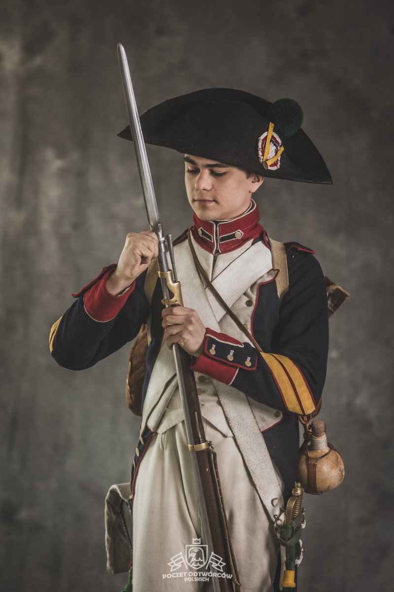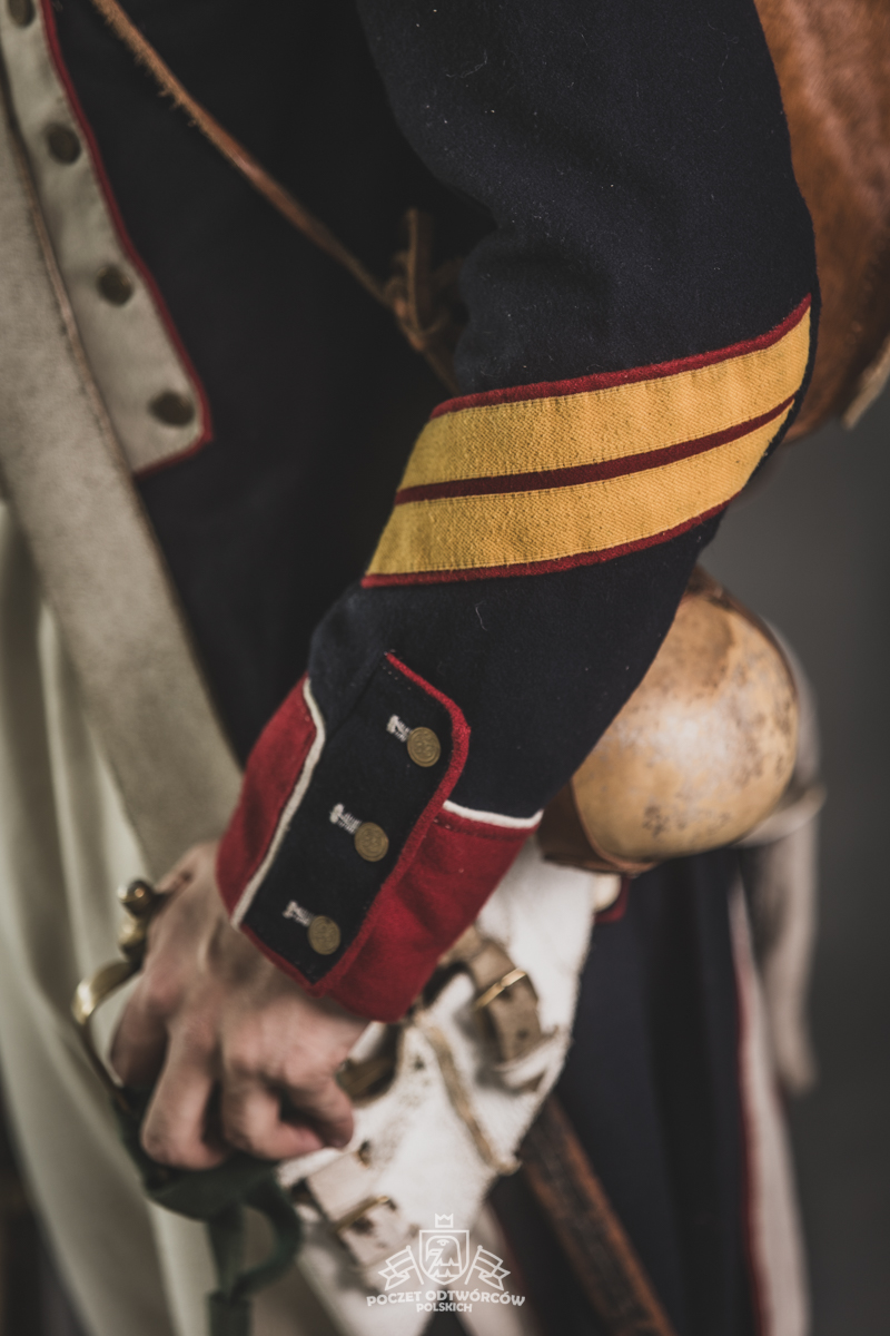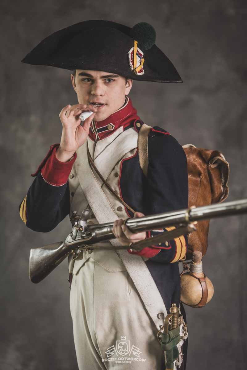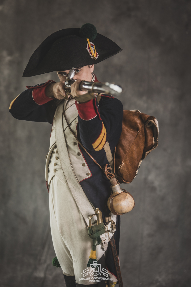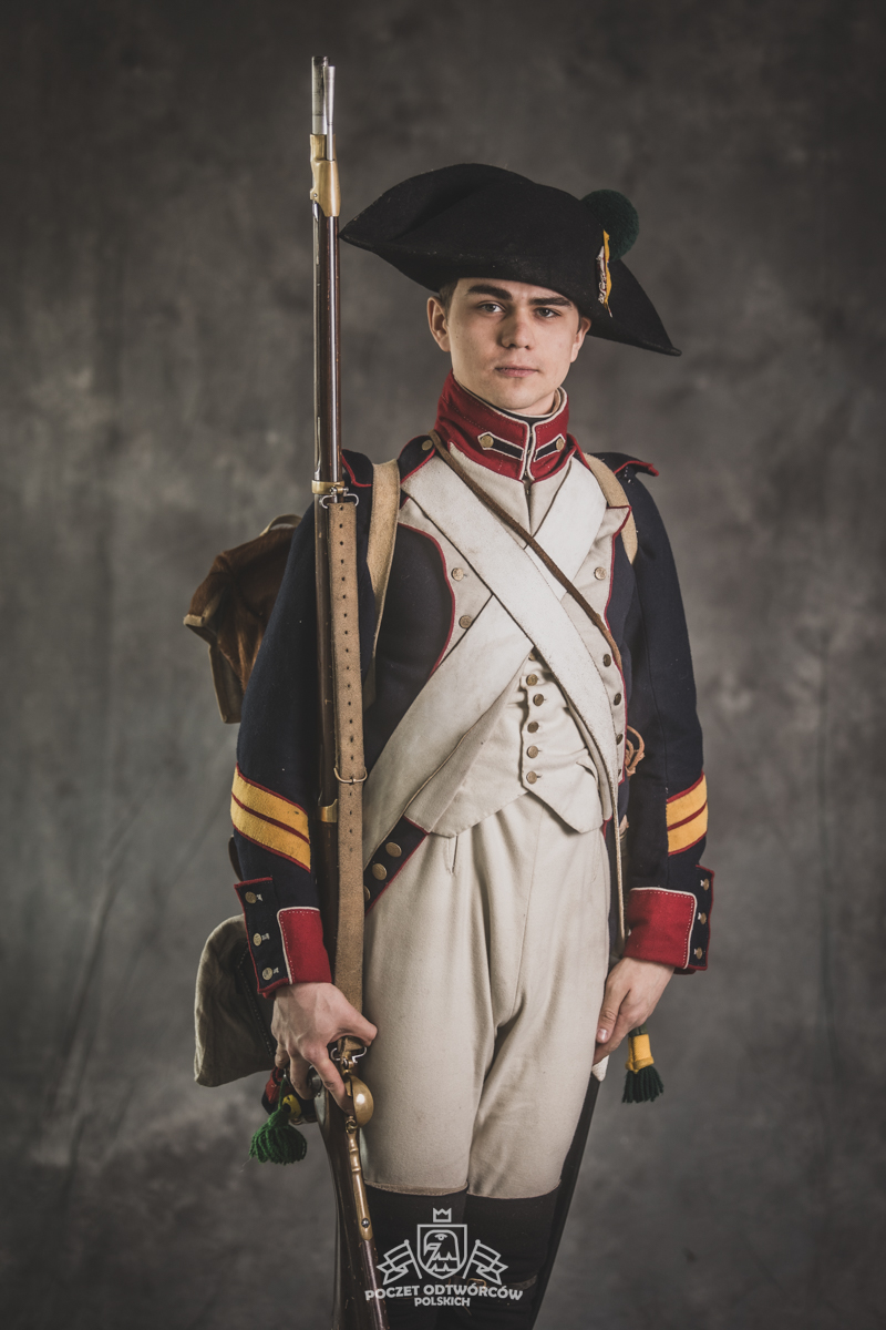 Chapeau Bicorn- dwurożny kapelusz filcowy z dużym guzikiem z numerem pułku, kokardą rewolucyjną, zielonym pomponem i żółtą taśmą w splocie cul de de. Col noir – halsztuk czarny zapinany pod szyją mosiężną klamrą. Chemise – koszula lniana. Veste- lejbik sukienny ”wczesny” fizylierski wg wzoru z 1787, zapinany na mosiężne guziki z wybitym numerem pułku. Habit – frak, z patkami fizylierskimi, z pąsowymi mankietami i jeszcze pąsowym kołnierzem. Na obu rękawach widoczne belki sugerujące stopień kaprala, wszyte w rękaw. Culottes – krótkie spodnie z białego sukna zachodzące za kolano. Guêtres noires – wysokie kamasze z czarnego sukna, z lnianą podszewką, zapinane na 24 gładkie guziki mosiężne. Chaussures – buty podkute. Baïonnette de Fusil 1777 corrigé en l’an IX : Bagnet do karabinu mle 1777, modyfikacji roku IX. (wg kalendarza rewolucyjnego) Giberne mle 1801 – ładownica z paskami do troczenia bonnet de police, czyli furażerki. Na klapę ładownicy, patelette, nałożone jest couvre de giberne, czyli lniany pokrowiec z naniesionym emblematem trąbki: Znaku rozpoznawczego kompanii woltyżerskich. Dodatkowo widoczny numer pułku. W ładownicy znajdować powinno się 35 cartouches – pocisków. W ładownicy olejarka i szmatka do czyszczenia panewki. Na klatce piersiowej widoczne skrzyżowane dwa pasy wołowe wyprawione tłuszczowo, farbowane na biało. Pierwszy z nich to tzw. baudrier, na którym zawieszony jest bagnet i półszabla piechoty (sabre briquet) z temblakiem (dragonne) w kolorach kompanii woltyżerskich. Drugi z nich to pas nośny od ładownicy (banderolle) Fusil 1777 corrigé en l’an IX – karabin gładkolufowy, wyprodukowany w manufakturze w Charleville, kaliber 17,5 mm, esowaty kurek o ruchomych szczękach, w których mieściła się skałka. Ołowiana kula do tej broni miała średnicę16,5 mm. Cartouche z kulą ważył ok. 27 gram. Havresac mle 1801– Tornister z krowiej skóry