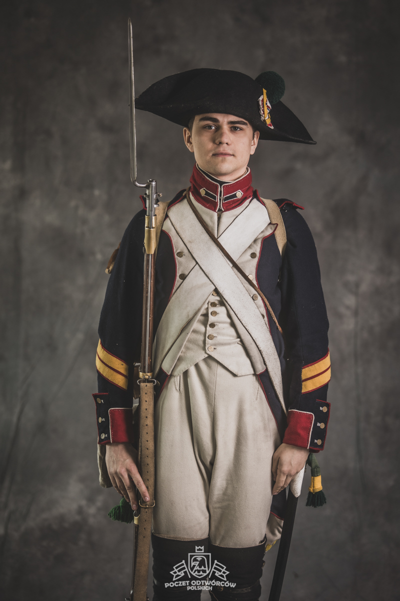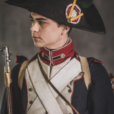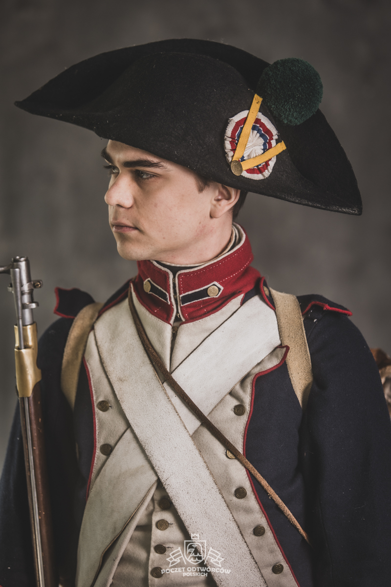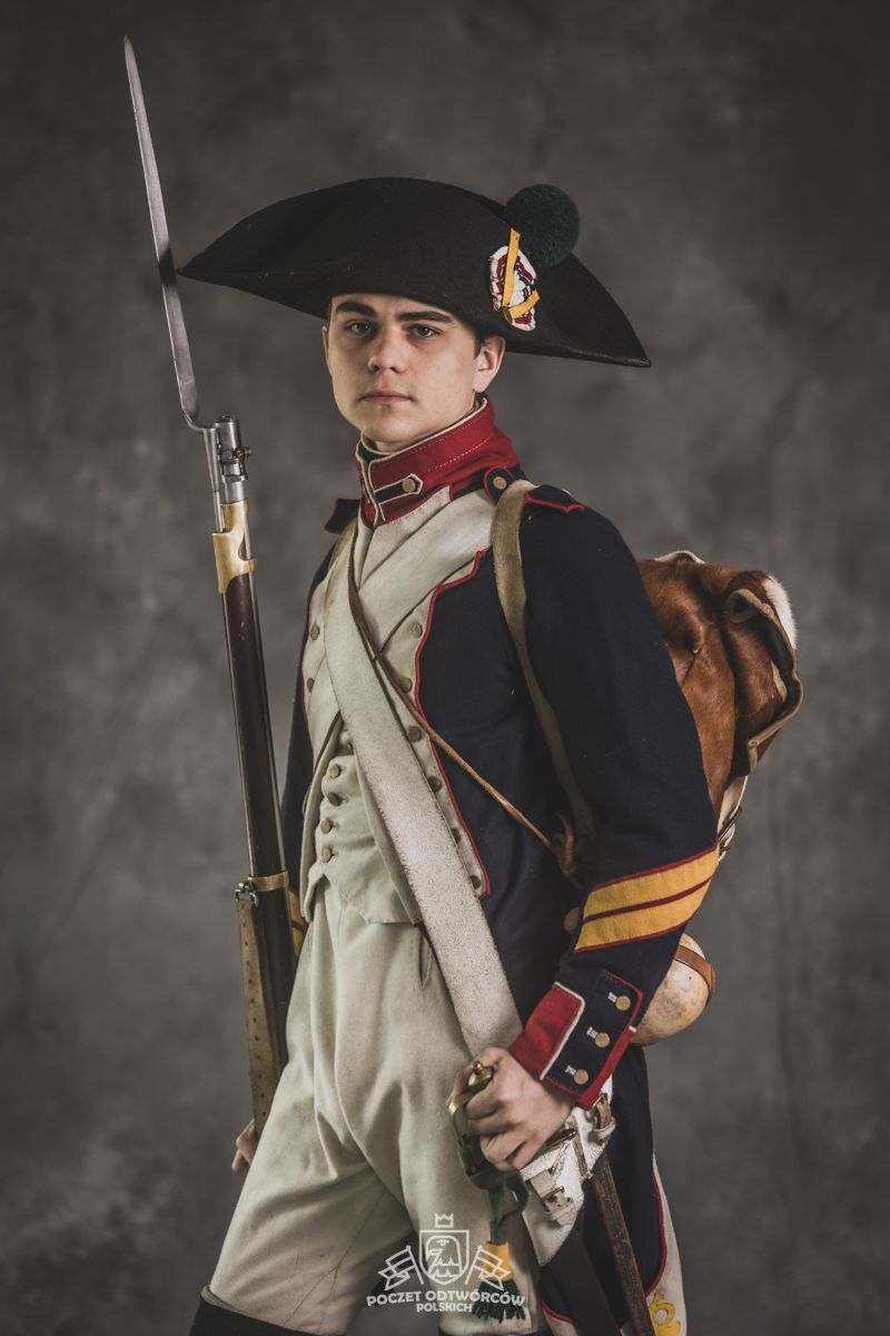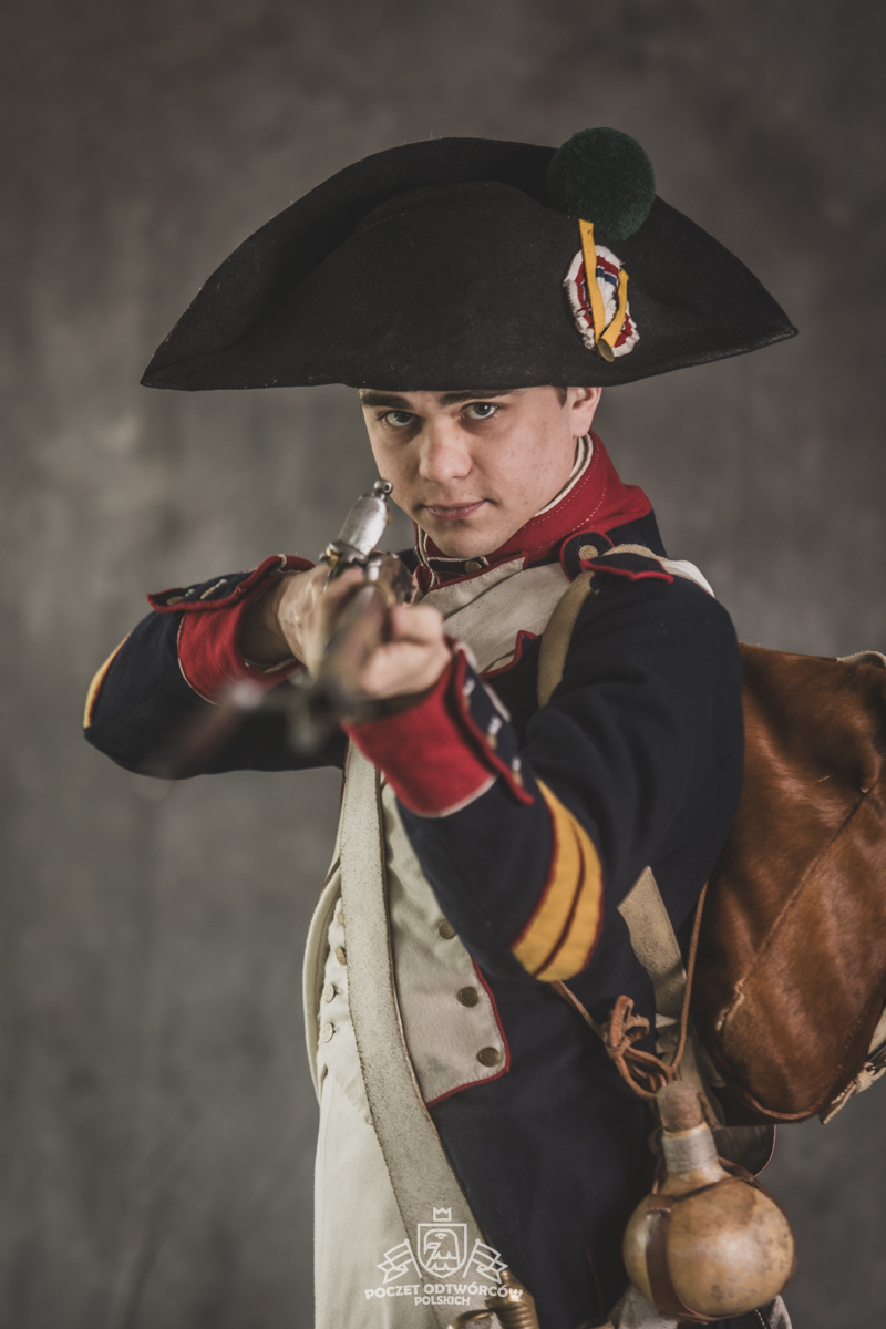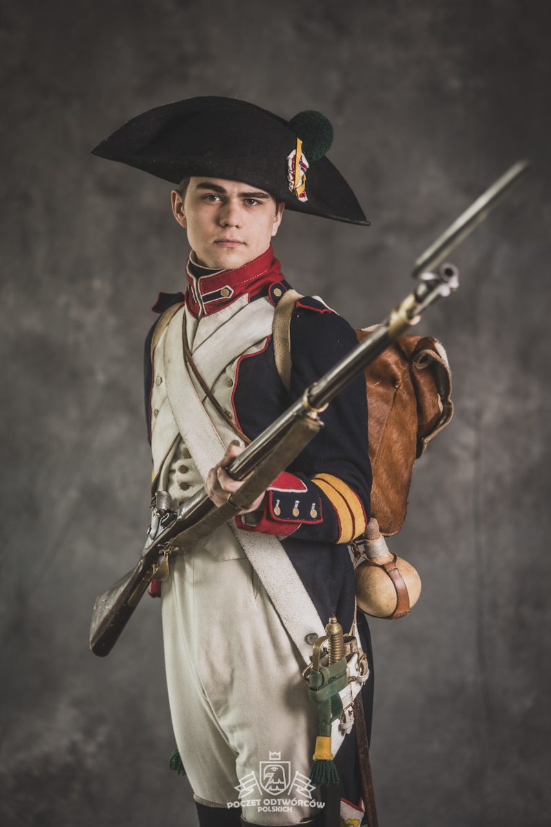 Chapeau Bicorn- dwurożny kapelusz filcowy z dużym guzikiem z numerem pułku, kokardą rewolucyjną, zielonym pomponem i żółtą taśmą w splocie cul de de. Col noir – halsztuk czarny zapinany pod szyją mosiężną klamrą. Chemise – koszula lniana. Veste- lejbik sukienny ”wczesny” fizylierski wg wzoru z 1787, zapinany na mosiężne guziki z wybitym numerem pułku. Habit – frak, z patkami fizylierskimi, z pąsowymi mankietami i jeszcze pąsowym kołnierzem. Na obu rękawach widoczne belki sugerujące stopień kaprala, wszyte w rękaw. Culottes – krótkie spodnie z białego sukna zachodzące za kolano. Guêtres noires – wysokie kamasze z czarnego sukna, z lnianą podszewką, zapinane na 24 gładkie guziki mosiężne. Chaussures – buty podkute. Baïonnette de Fusil 1777 corrigé en l’an IX : Bagnet do karabinu mle 1777, modyfikacji roku IX. (wg kalendarza rewolucyjnego) Giberne mle 1801 – ładownica z paskami do troczenia bonnet de police, czyli furażerki. Na klapę ładownicy, patelette, nałożone jest couvre de giberne, czyli lniany pokrowiec z naniesionym emblematem trąbki: Znaku rozpoznawczego kompanii woltyżerskich. Dodatkowo widoczny numer pułku. W ładownicy znajdować powinno się 35 cartouches – pocisków. W ładownicy olejarka i szmatka do czyszczenia panewki. Na klatce piersiowej widoczne skrzyżowane dwa pasy wołowe wyprawione tłuszczowo, farbowane na biało. Pierwszy z nich to tzw. baudrier, na którym zawieszony jest bagnet i półszabla piechoty (sabre briquet) z temblakiem (dragonne) w kolorach kompanii woltyżerskich. Drugi z nich to pas nośny od ładownicy (banderolle) Fusil 1777 corrigé en l’an IX – karabin gładkolufowy, wyprodukowany w manufakturze w Charleville, kaliber 17,5 mm, esowaty kurek o ruchomych szczękach, w których mieściła się skałka. Ołowiana kula do tej broni miała średnicę16,5 mm. Cartouche z kulą ważył ok. 27 gram. Havresac mle 1801– Tornister z krowiej skóry