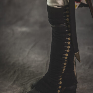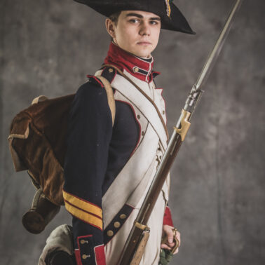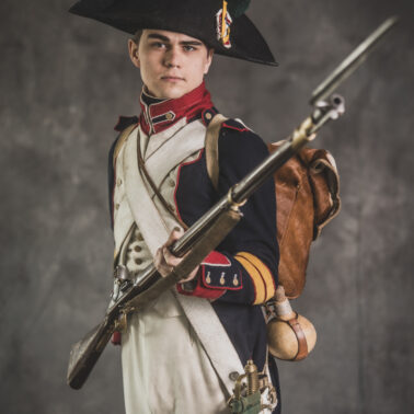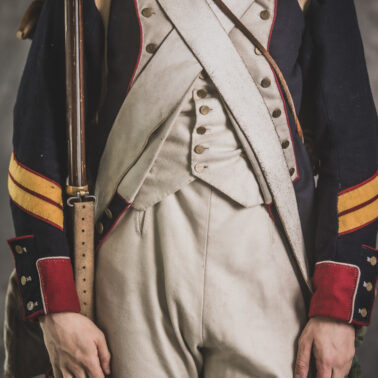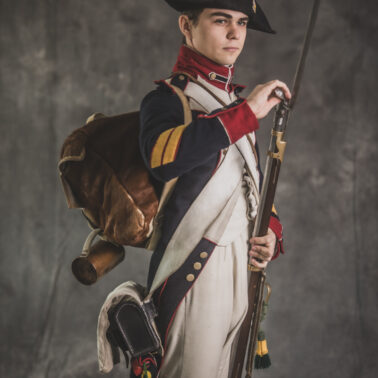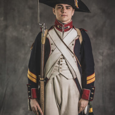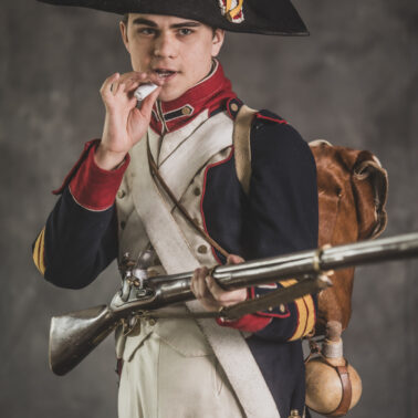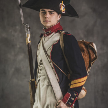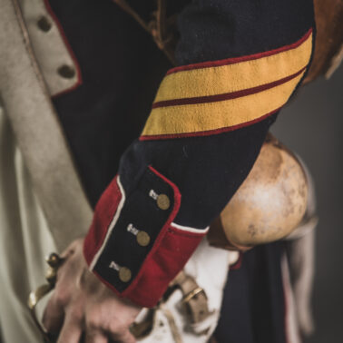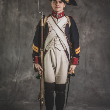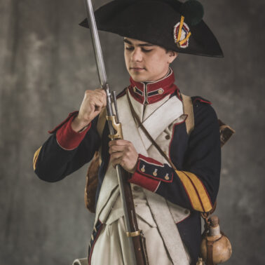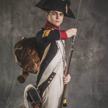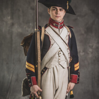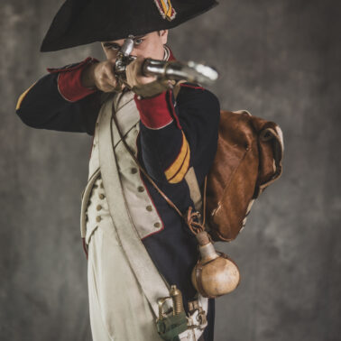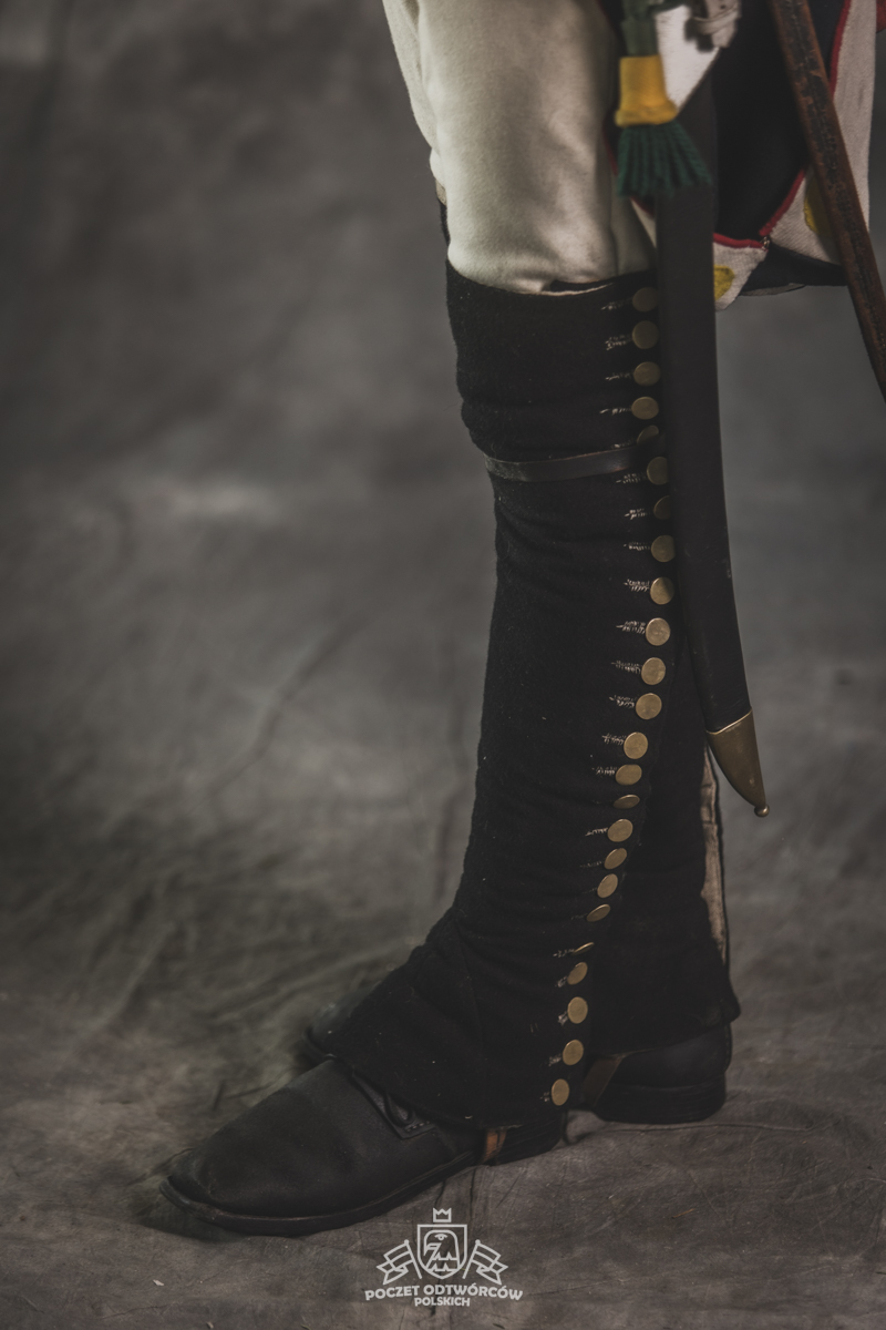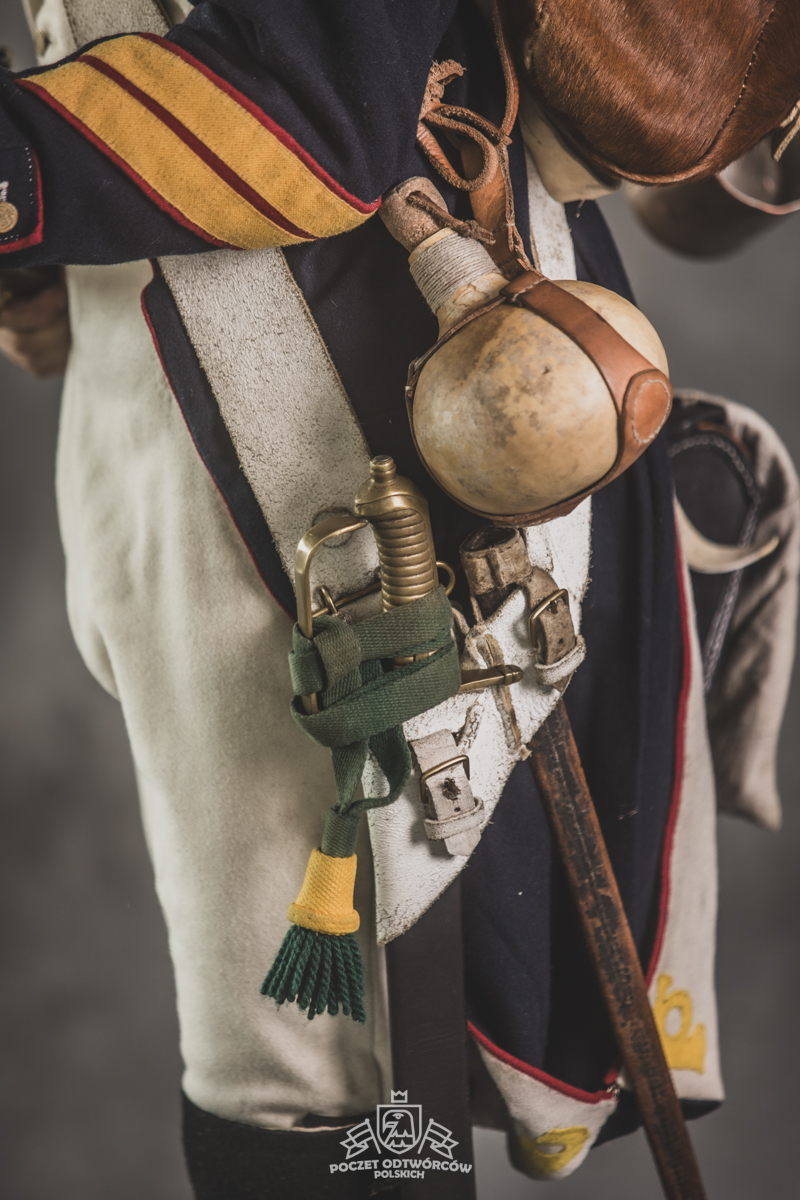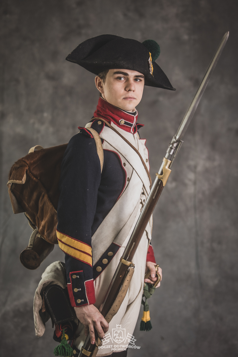 Chapeau Bicorn- dwurożny kapelusz filcowy z dużym guzikiem z numerem pułku, kokardą rewolucyjną, zielonym pomponem i żółtą taśmą w splocie cul de de. Col noir – halsztuk czarny zapinany pod szyją mosiężną klamrą. Chemise – koszula lniana. Veste- lejbik sukienny ”wczesny” fizylierski wg wzoru z 1787, zapinany na mosiężne guziki z wybitym numerem pułku. Habit – frak, z patkami fizylierskimi, z pąsowymi mankietami i jeszcze pąsowym kołnierzem. Na obu rękawach widoczne belki sugerujące stopień kaprala, wszyte w rękaw. Culottes – krótkie spodnie z białego sukna zachodzące za kolano. Guêtres noires – wysokie kamasze z czarnego sukna, z lnianą podszewką, zapinane na 24 gładkie guziki mosiężne. Chaussures – buty podkute. Baïonnette de Fusil 1777 corrigé en l’an IX : Bagnet do karabinu mle 1777, modyfikacji roku IX. (wg kalendarza rewolucyjnego) Giberne mle 1801 – ładownica z paskami do troczenia bonnet de police, czyli furażerki. Na klapę ładownicy, patelette, nałożone jest couvre de giberne, czyli lniany pokrowiec z naniesionym emblematem trąbki: Znaku rozpoznawczego kompanii woltyżerskich. Dodatkowo widoczny numer pułku. W ładownicy znajdować powinno się 35 cartouches – pocisków. W ładownicy olejarka i szmatka do czyszczenia panewki. Na klatce piersiowej widoczne skrzyżowane dwa pasy wołowe wyprawione tłuszczowo, farbowane na biało. Pierwszy z nich to tzw. baudrier, na którym zawieszony jest bagnet i półszabla piechoty (sabre briquet) z temblakiem (dragonne) w kolorach kompanii woltyżerskich. Drugi z nich to pas nośny od ładownicy (banderolle) Fusil 1777 corrigé en l’an IX – karabin gładkolufowy, wyprodukowany w manufakturze w Charleville, kaliber 17,5 mm, esowaty kurek o ruchomych szczękach, w których mieściła się skałka. Ołowiana kula do tej broni miała średnicę16,5 mm. Cartouche z kulą ważył ok. 27 gram. Havresac mle 1801– Tornister z krowiej skóry