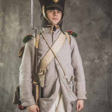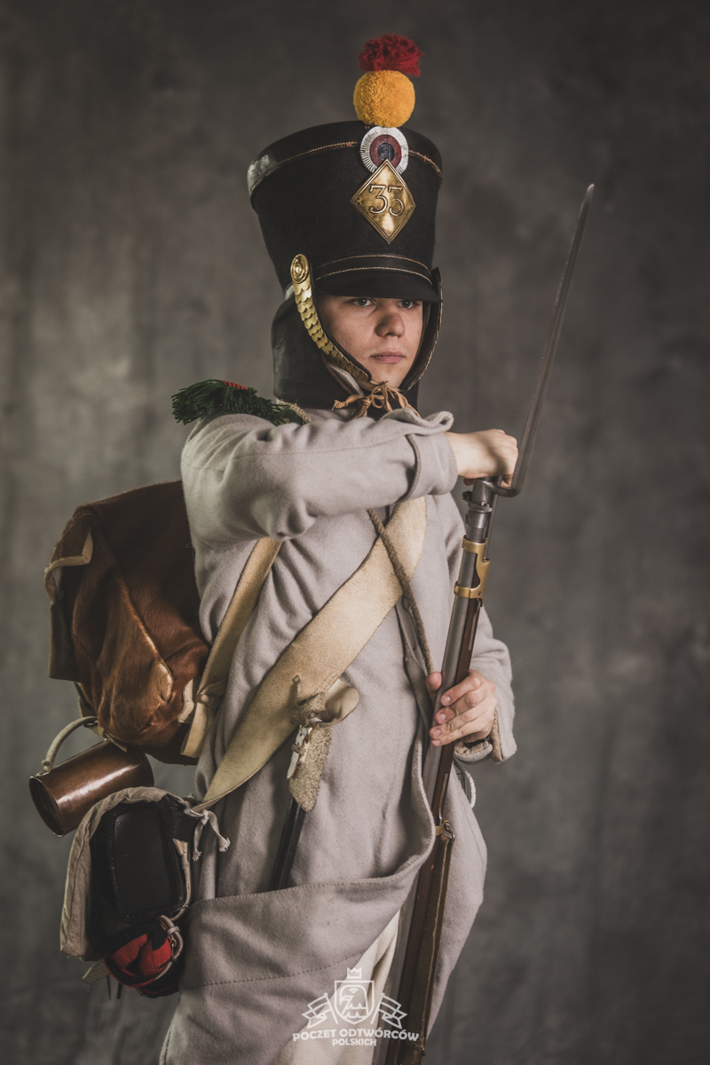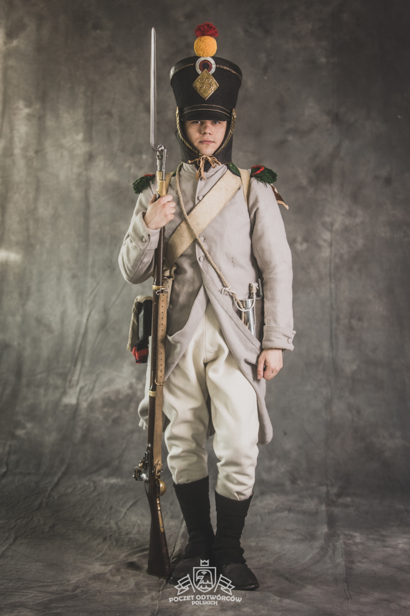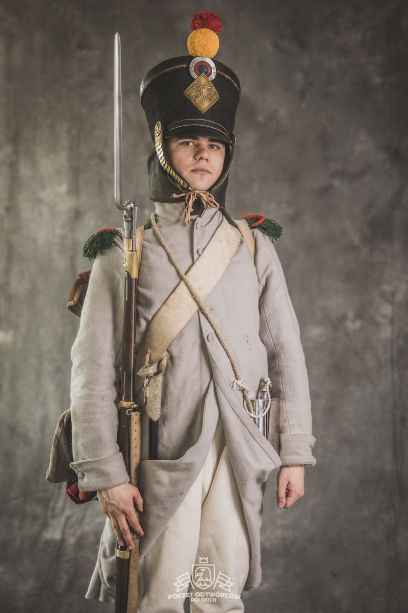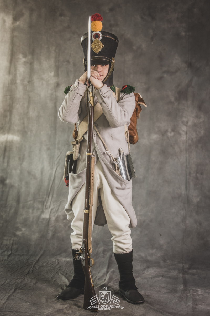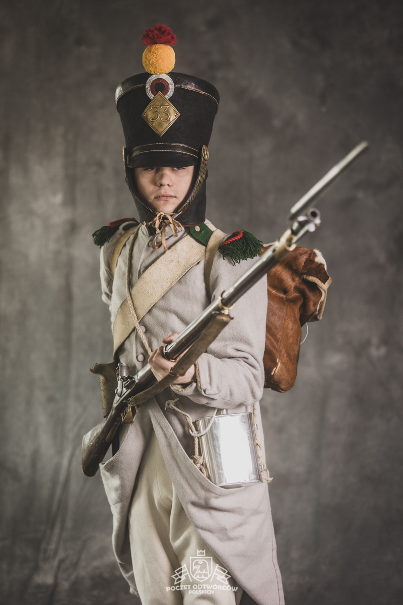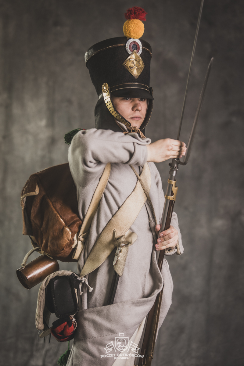 Col noir– halsztuk czarny zapinany pod szyją mosiężną klamrą.Chemise- koszula lniana. Veste- lejbik sukienny ”wczesny” fizylierski wg wzoru z 1787, zapinany na mosiężne guziki z wybitym numerem pułku. Capote- szary płaszcz jednorzędowy, zapinany na sukienne guziki. Epaulettes- zielono-czerwone, ręcznie tkane epolety z frędzlą. Pantalons de tricotdługie spodnie sukienne wg Reglement d’habillement Bardina z 1812. Guêtres noireskrótkie kamasze wg Reglement d’habillement Bardina z 1812 i na podstawie zachowanego oryginału, z czarnego sukna zapinane na mosiężne guziki (Ciekawostka:guziki nie są przyszyte każdy z osobna a przebite przez materiał i przeplecione od wewnątrz rzemieniem). Chaussures- buty podkute bez podziału na prawy i lewy. Na głowie żołnierza widoczne shako mle 1810 z couvre nuque (skórzana płachta w słoneczne dni chowana do wewnątrz). Na shako widoczna blacha z numerem pułku, będąca rekonstrukcją oryginalnej blachy 33.regimentu znalezionej na polu bitwy pod Krasnym. Shako zwieńczone jest żółtym pomponem woltyżerskim z czerwonym chwostem tzw. flame. Przez ramię przewieszona manierka, od wewnąrz impregnowana woskiem. Baïonnette de Fusil 1777 corrigé en l’an IX- Bagnet do karabinu mle 1777, modyfikacji roku IX. (wg kalendarza rewolucyjnego). Giberne mle 1801– ładownica z paskami do troczenia bonnet de police, czyli furażerki. Na klapę ładownicy, patelette, nałożone jest couvre de giberne, czyli lniany pokrowiec z naniesionym emblematem trąbki: Znaku rozpoznawczego kompanii woltyżerskich. Dodatkowo widoczny numer pułku. W ładownicy znajdować powinno się 35 cartouches – pocisków. W ładownicy olejarka i szmatka do czyszczenia panewki. Na pasie od ładownicy (banderolle) widoczne skórzane mocowanie na pochwę bagnetu. Kiedy w 1807 zapadła decyzja o odebraniu woltyżerom sabre briquettasaków wraz z pasem mocującym jednocześnie tasak i bagnet, wyposażeni zostali oni w identyczne pasy do ładownic jak kompanie fizylierskie, z mocowaniem bagnetu bezpośrednio przy ładownicy. Fusil 1777 corrigé en l’an IX – karabin gładkolufowy, wyprodukowany w manufakturze w Charleville, kaliber 17,5 mm, esowaty kurek o ruchomych szczękach, w których mieściła się skałka. Ołowiana kula do tej broni miała średnicę16,5 mm. Cartouche z kulą ważył ok. 27 gram. Havresac mle 1801– Tornister z krowiej skóry.