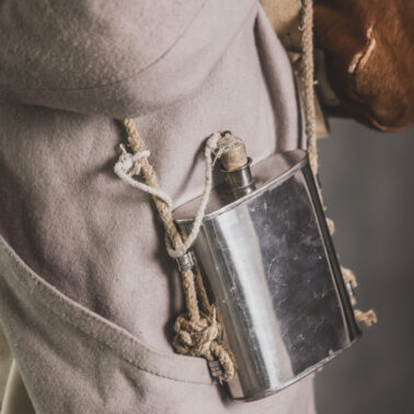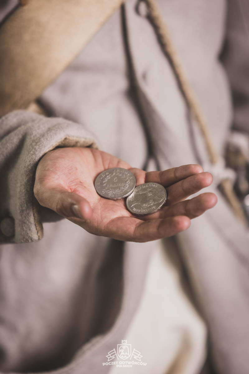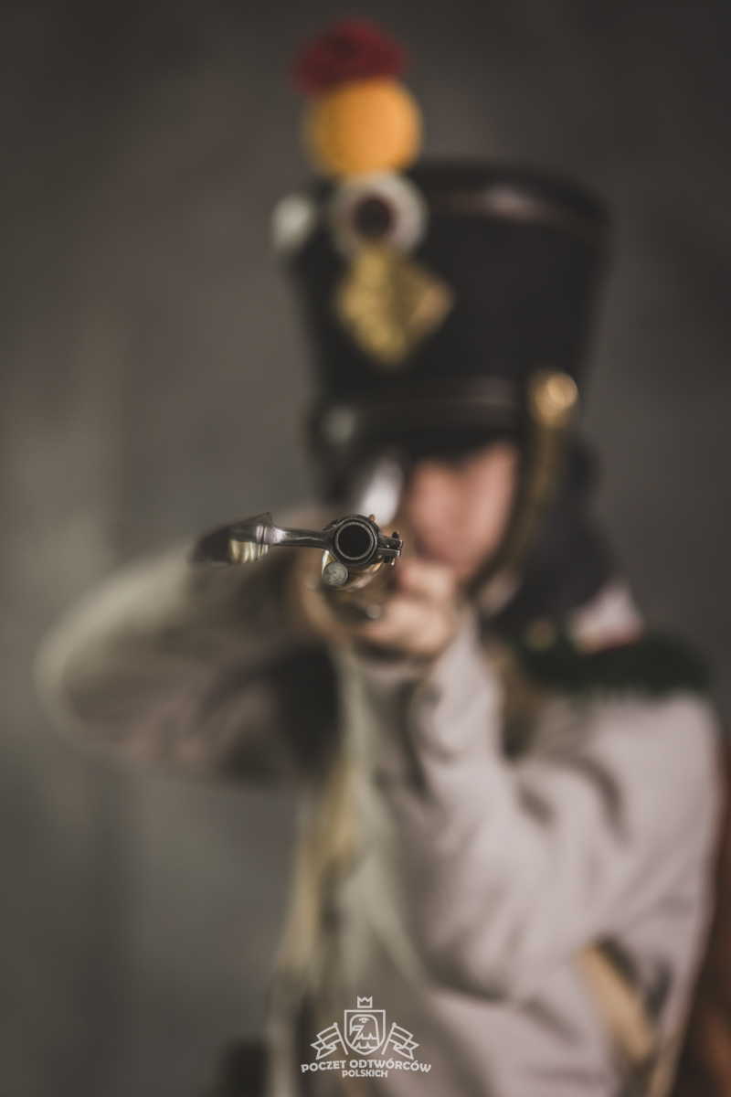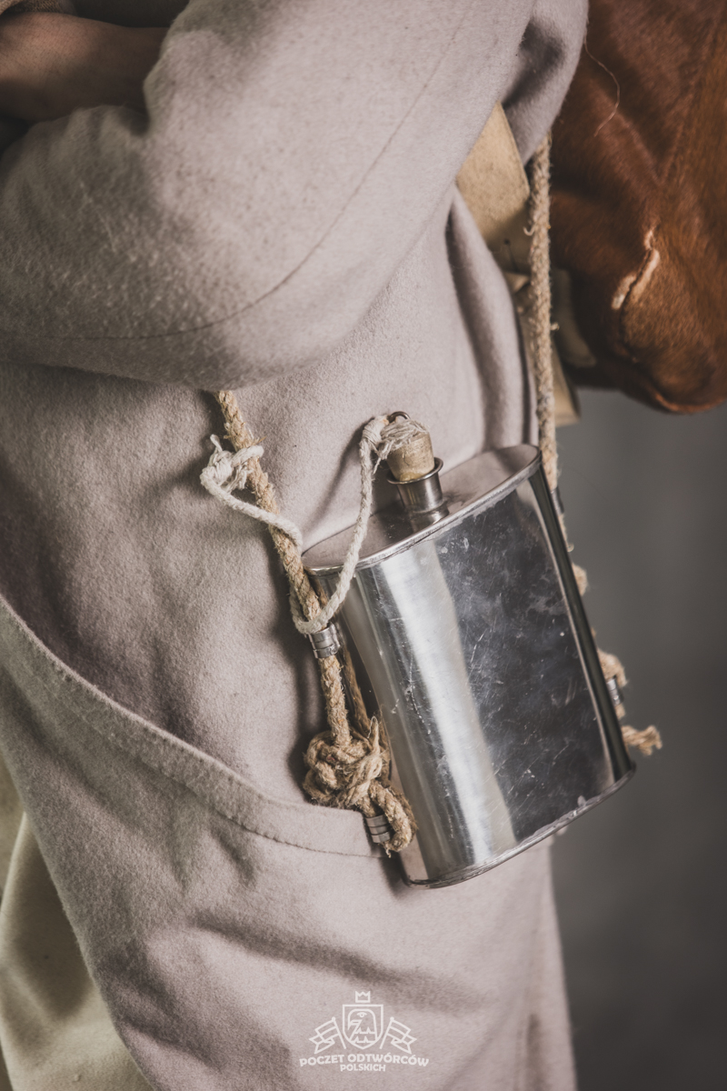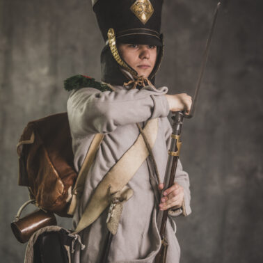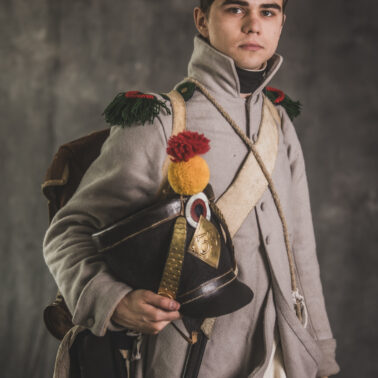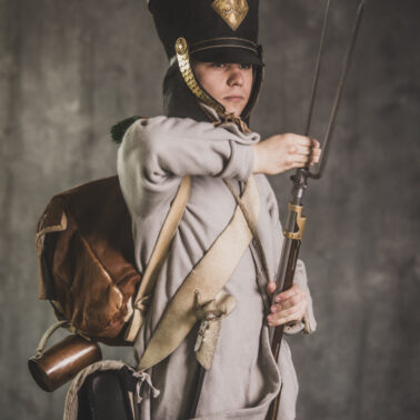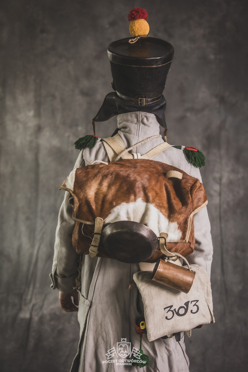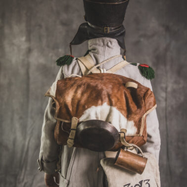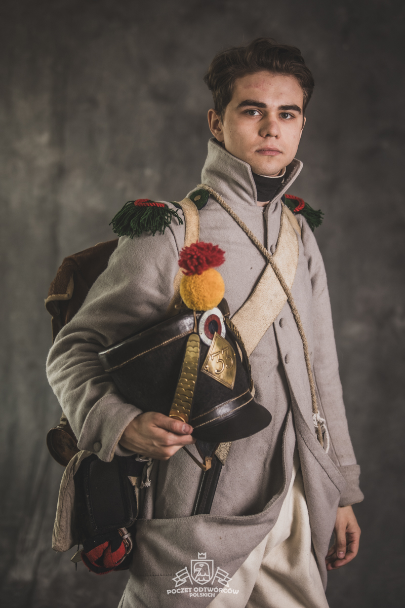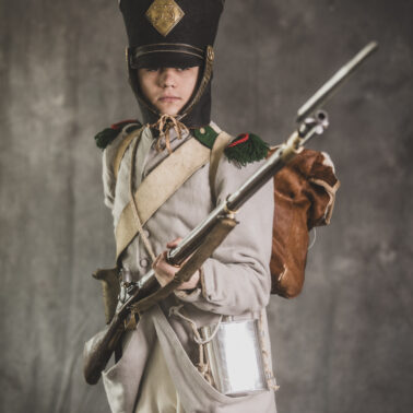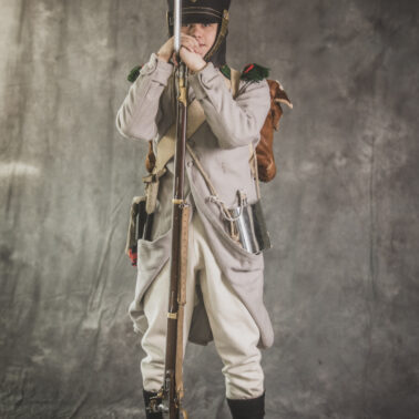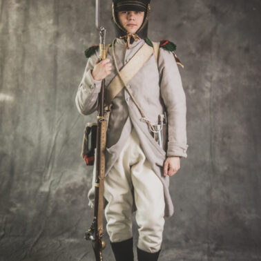 Col noir– halsztuk czarny zapinany pod szyją mosiężną klamrą.Chemise- koszula lniana. Veste- lejbik sukienny ”wczesny” fizylierski wg wzoru z 1787, zapinany na mosiężne guziki z wybitym numerem pułku. Capote- szary płaszcz jednorzędowy, zapinany na sukienne guziki. Epaulettes- zielono-czerwone, ręcznie tkane epolety z frędzlą. Pantalons de tricotdługie spodnie sukienne wg Reglement d’habillement Bardina z 1812. Guêtres noireskrótkie kamasze wg Reglement d’habillement Bardina z 1812 i na podstawie zachowanego oryginału, z czarnego sukna zapinane na mosiężne guziki (Ciekawostka:guziki nie są przyszyte każdy z osobna a przebite przez materiał i przeplecione od wewnątrz rzemieniem). Chaussures- buty podkute bez podziału na prawy i lewy. Na głowie żołnierza widoczne shako mle 1810 z couvre nuque (skórzana płachta w słoneczne dni chowana do wewnątrz). Na shako widoczna blacha z numerem pułku, będąca rekonstrukcją oryginalnej blachy 33.regimentu znalezionej na polu bitwy pod Krasnym. Shako zwieńczone jest żółtym pomponem woltyżerskim z czerwonym chwostem tzw. flame. Przez ramię przewieszona manierka, od wewnąrz impregnowana woskiem. Baïonnette de Fusil 1777 corrigé en l’an IX- Bagnet do karabinu mle 1777, modyfikacji roku IX. (wg kalendarza rewolucyjnego). Giberne mle 1801– ładownica z paskami do troczenia bonnet de police, czyli furażerki. Na klapę ładownicy, patelette, nałożone jest couvre de giberne, czyli lniany pokrowiec z naniesionym emblematem trąbki: Znaku rozpoznawczego kompanii woltyżerskich. Dodatkowo widoczny numer pułku. W ładownicy znajdować powinno się 35 cartouches – pocisków. W ładownicy olejarka i szmatka do czyszczenia panewki. Na pasie od ładownicy (banderolle) widoczne skórzane mocowanie na pochwę bagnetu. Kiedy w 1807 zapadła decyzja o odebraniu woltyżerom sabre briquettasaków wraz z pasem mocującym jednocześnie tasak i bagnet, wyposażeni zostali oni w identyczne pasy do ładownic jak kompanie fizylierskie, z mocowaniem bagnetu bezpośrednio przy ładownicy. Fusil 1777 corrigé en l’an IX – karabin gładkolufowy, wyprodukowany w manufakturze w Charleville, kaliber 17,5 mm, esowaty kurek o ruchomych szczękach, w których mieściła się skałka. Ołowiana kula do tej broni miała średnicę16,5 mm. Cartouche z kulą ważył ok. 27 gram. Havresac mle 1801– Tornister z krowiej skóry.