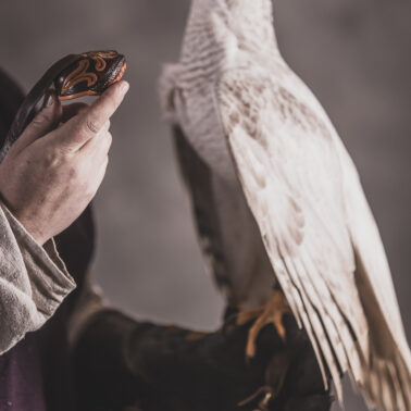 Wyposażenie przedstawionej w rekonstrukcji historycznej sylwetki, zostało odwzorowane zgodnie z przedstawieniami zawartymi w De arte venandi cum avibus. Nogawice, lniana tunika, strój zewnętrzny tzw. gardcorps, wraz z ręcznie robiona i naturalnie farbowaną charakterystyczną czapka. Buty pochodzą z uniwersalnego wzoru,gdyż ciężko było określić jednoznacznie ich krój. Rękawica sokolnicza, standardowego kroju, który pojawił się już w XIII wieku. Werblik sokolniczy, ptasie pęta (wykrojone paski skóry na nogach ptaka) oraz pętca ( pleciony sznurek mocowany do rękawicy) wykonane również zgodnie z przedstawieniami pochodzącymi z w/w dzieła. Skoll’a, czyli przedstawicielka gatunku Accipiter gentilis albidus, potocznie nazywana jastrzębiem kamczackim i jej biała szata, również odpowiada wymaganiom historycznym epoki.