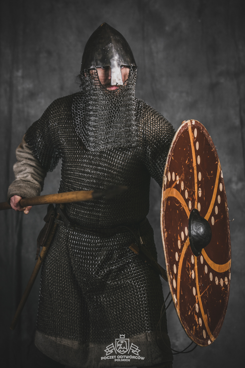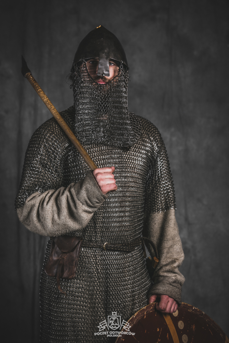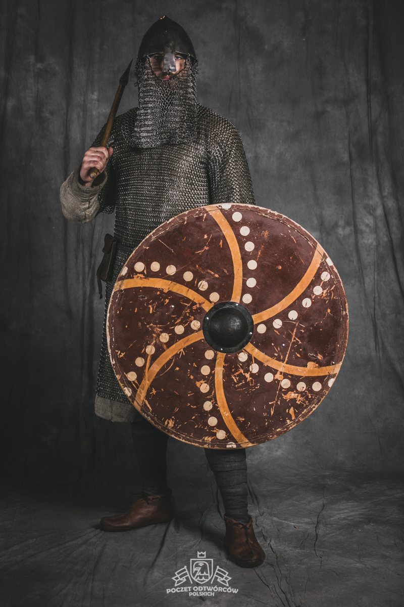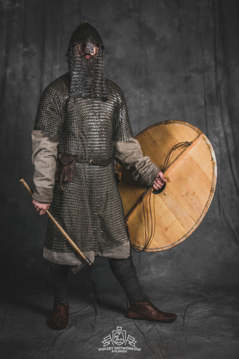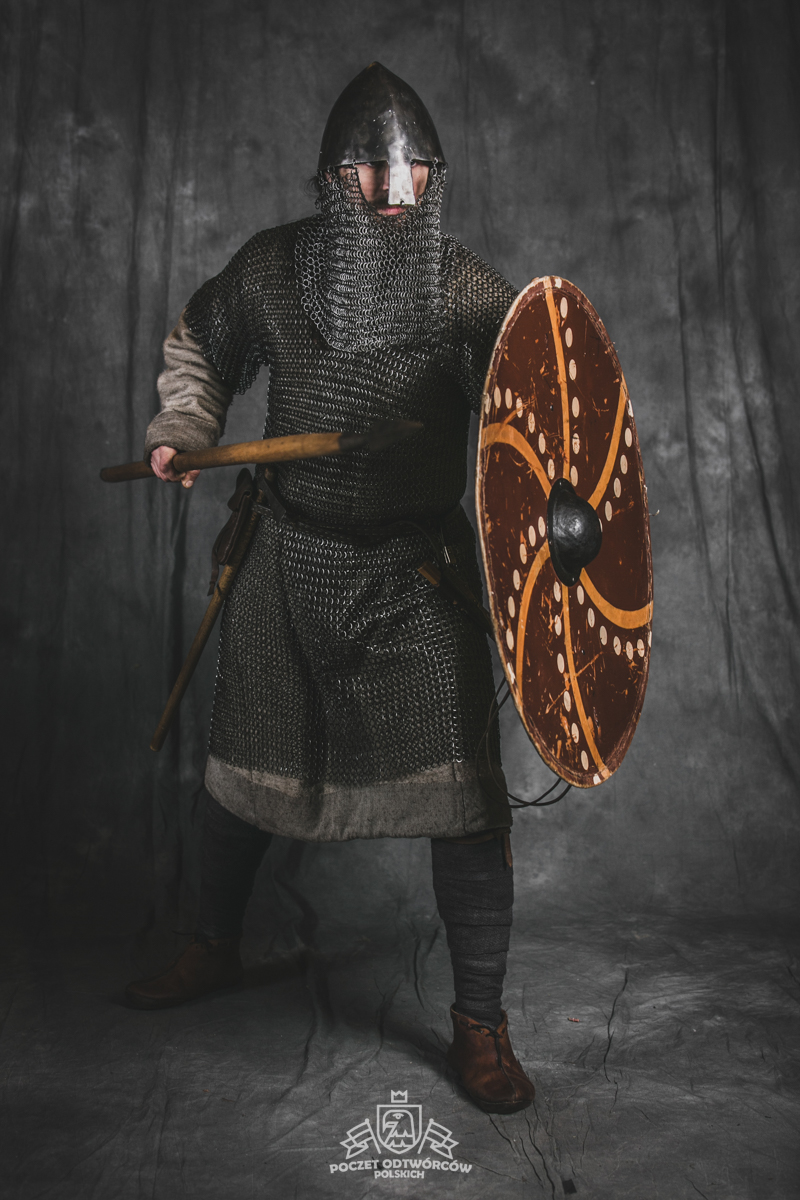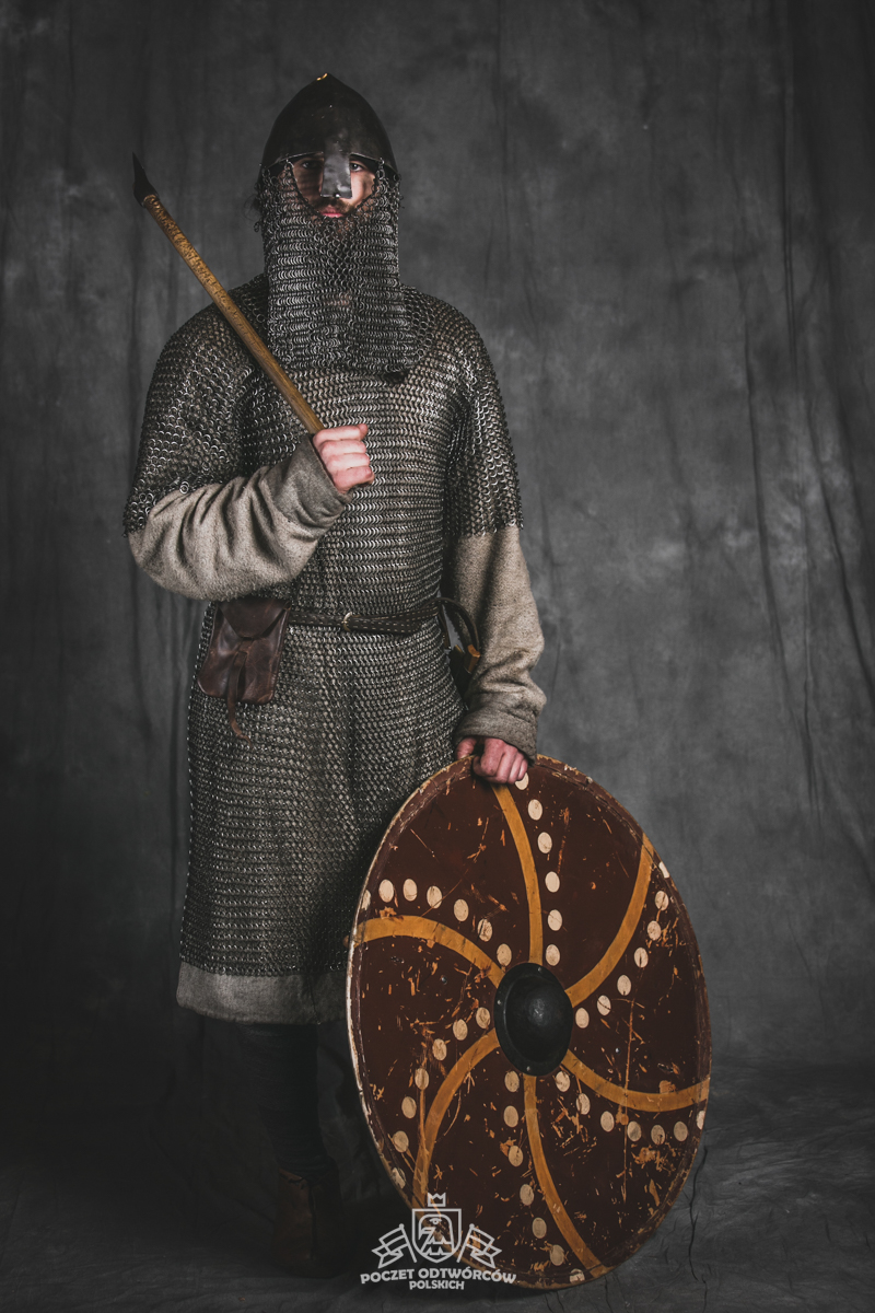 Hełm stożkowy wykonany na podstawie znaleziska hełmu wydobytego z jeziora Lednickiego. Zaopatrzony dodatkowo w oplot kolczy wykonany z rzędów kółek naprzemiennie sztancowanych i nitowanych. Pancerz kolczy, również wykonany na wzór kolczugi wydobytej z jeziora lednickiego i tak jak oplot do hełmu, pleciony z rzędów kółek naprzemiennie sztancowanych i nitowanych. Obszerna tunika pod kolczugą o kroju dwuklinowym, wykonana z grubej wełny i zaopatrzona w obszycia wykonane na wzór tunik z ikonografii wczesnochrześcijańskiej (Psałterz Stuttgardzki, Złoty Kodeks Gnieźnieński, Złoty Kodeks Pułtuski). Wąskie spodnie wełniane niewidoczne spod tuniki, owinięte są na łydkach tkanymi wełnianymi owijaczami farbowanymi na kolor niebieski przy użyciu urzetu barwierskiego. Buty uszyte z trzech kawałków skóry na podstawie znaleziska z Ostrowa Lednickiego. Pasek zszywany z dwóch warstw skóry, zaopatrzony w klamerkę tzw. lirowatą odlaną z brązu. Przy pasku znajdują się skórzany portfel uszyty na bazie znaleziska z Gniezna i prosty nóż w skórzanej pochewce. Na wyposażenie bojowe składa się włócznia o długim wąskim grocie i niewielki toporek, obydwa wykonane na podstawie znalezisk wydobytych z jeziora Lednickiego. Ostatnim elementem jest okrągła tarcza, wykonana z desek oklejonych surową kozią skórą i zaopatrzona w metalowe umbo na środku. Z powodu braku znalezisk z terenów Polski, tarcza wzorowana jest na znaleziskach tarcz skandynawskich i przedstawieniach ikonograficznych.