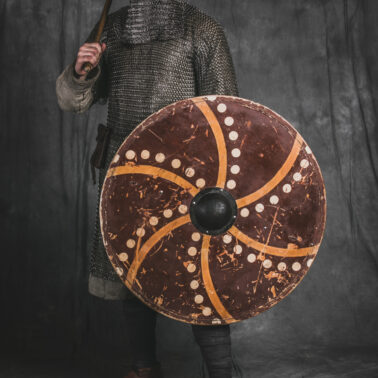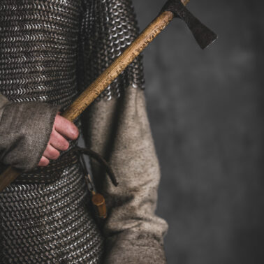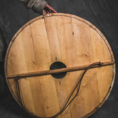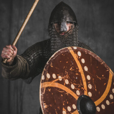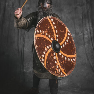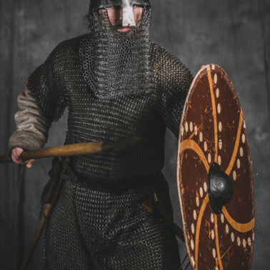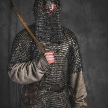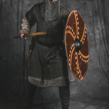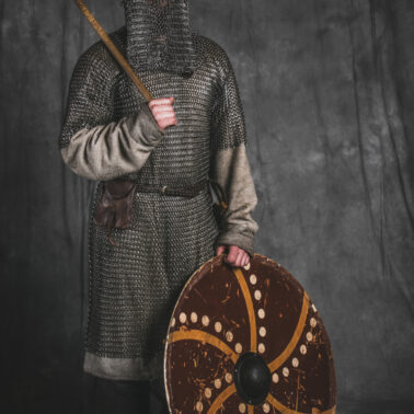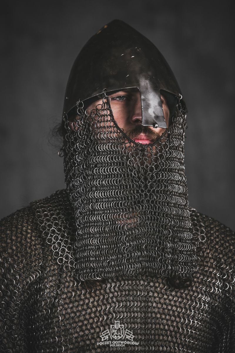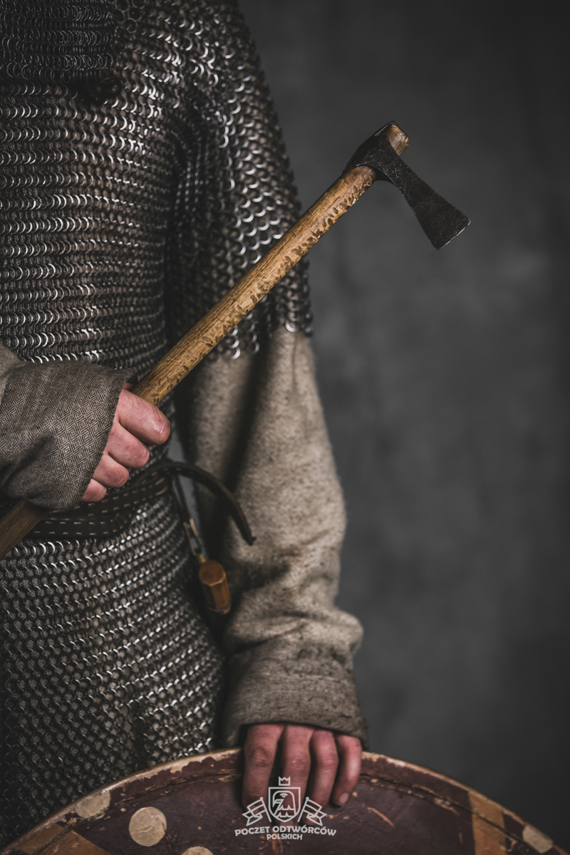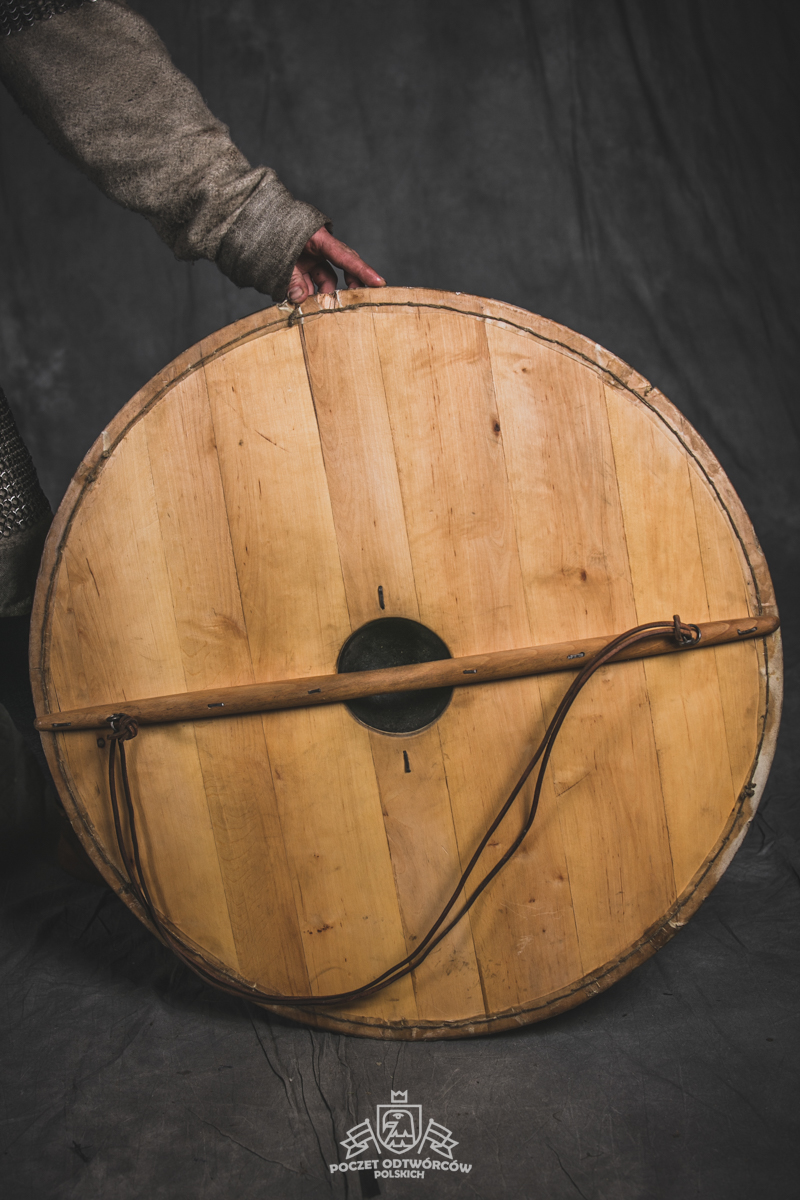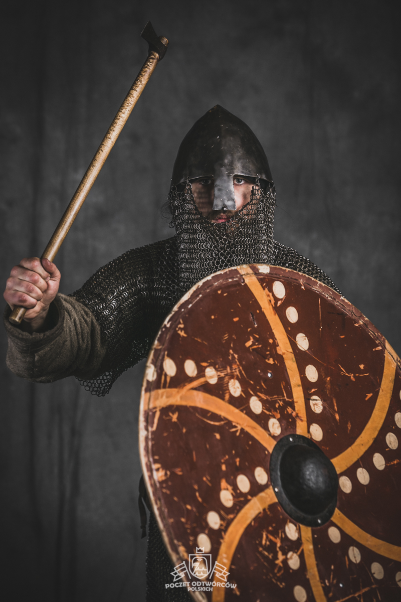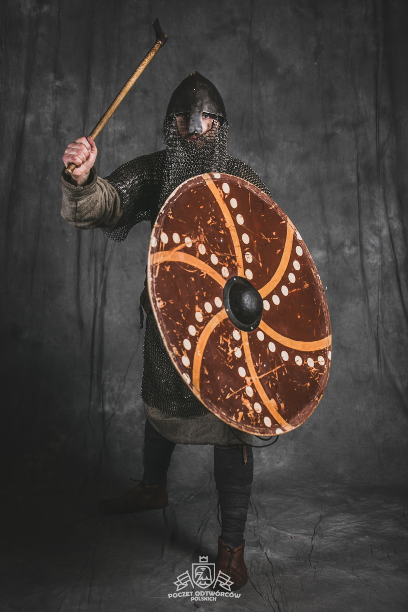 Hełm stożkowy wykonany na podstawie znaleziska hełmu wydobytego z jeziora Lednickiego. Zaopatrzony dodatkowo w oplot kolczy wykonany z rzędów kółek naprzemiennie sztancowanych i nitowanych. Pancerz kolczy, również wykonany na wzór kolczugi wydobytej z jeziora lednickiego i tak jak oplot do hełmu, pleciony z rzędów kółek naprzemiennie sztancowanych i nitowanych. Obszerna tunika pod kolczugą o kroju dwuklinowym, wykonana z grubej wełny i zaopatrzona w obszycia wykonane na wzór tunik z ikonografii wczesnochrześcijańskiej (Psałterz Stuttgardzki, Złoty Kodeks Gnieźnieński, Złoty Kodeks Pułtuski). Wąskie spodnie wełniane niewidoczne spod tuniki, owinięte są na łydkach tkanymi wełnianymi owijaczami farbowanymi na kolor niebieski przy użyciu urzetu barwierskiego. Buty uszyte z trzech kawałków skóry na podstawie znaleziska z Ostrowa Lednickiego. Pasek zszywany z dwóch warstw skóry, zaopatrzony w klamerkę tzw. lirowatą odlaną z brązu. Przy pasku znajdują się skórzany portfel uszyty na bazie znaleziska z Gniezna i prosty nóż w skórzanej pochewce. Na wyposażenie bojowe składa się włócznia o długim wąskim grocie i niewielki toporek, obydwa wykonane na podstawie znalezisk wydobytych z jeziora Lednickiego. Ostatnim elementem jest okrągła tarcza, wykonana z desek oklejonych surową kozią skórą i zaopatrzona w metalowe umbo na środku. Z powodu braku znalezisk z terenów Polski, tarcza wzorowana jest na znaleziskach tarcz skandynawskich i przedstawieniach ikonograficznych.
