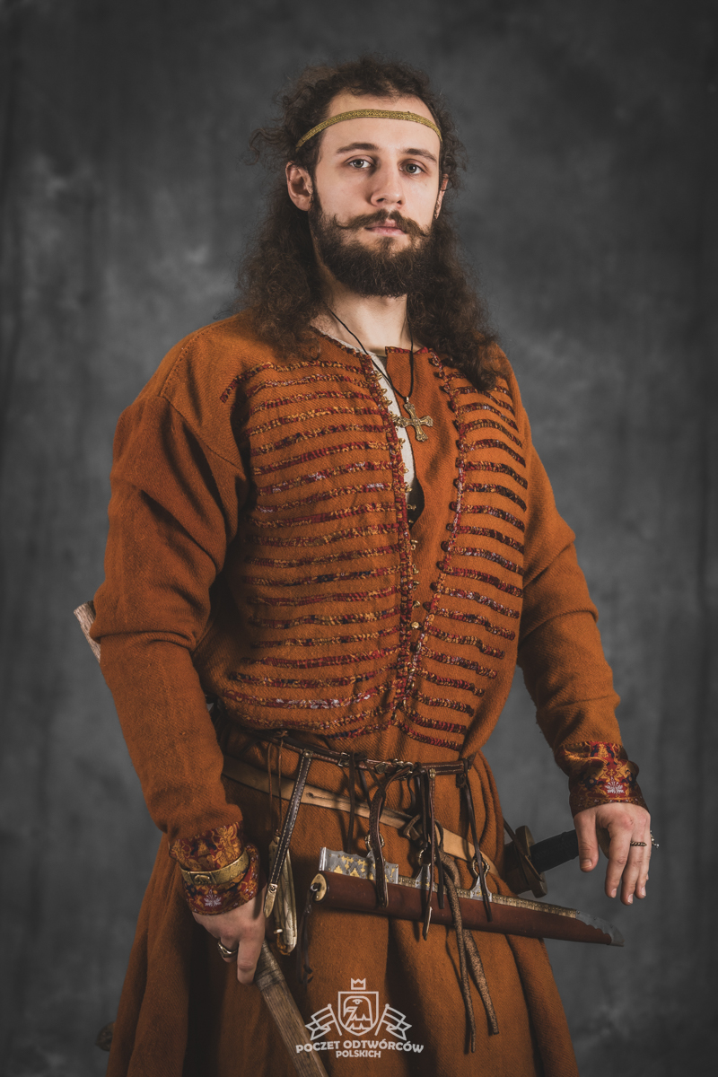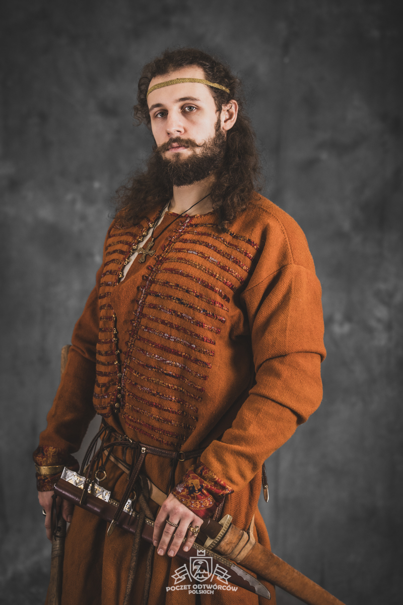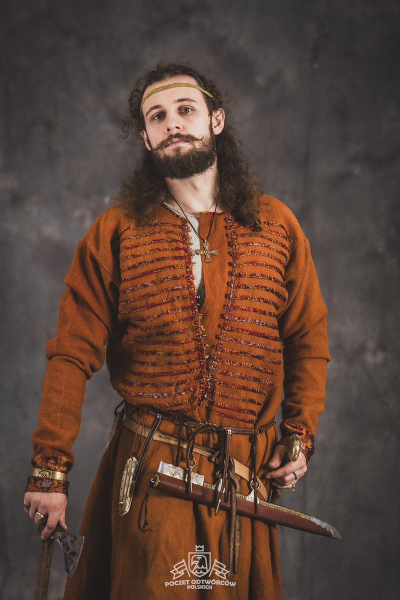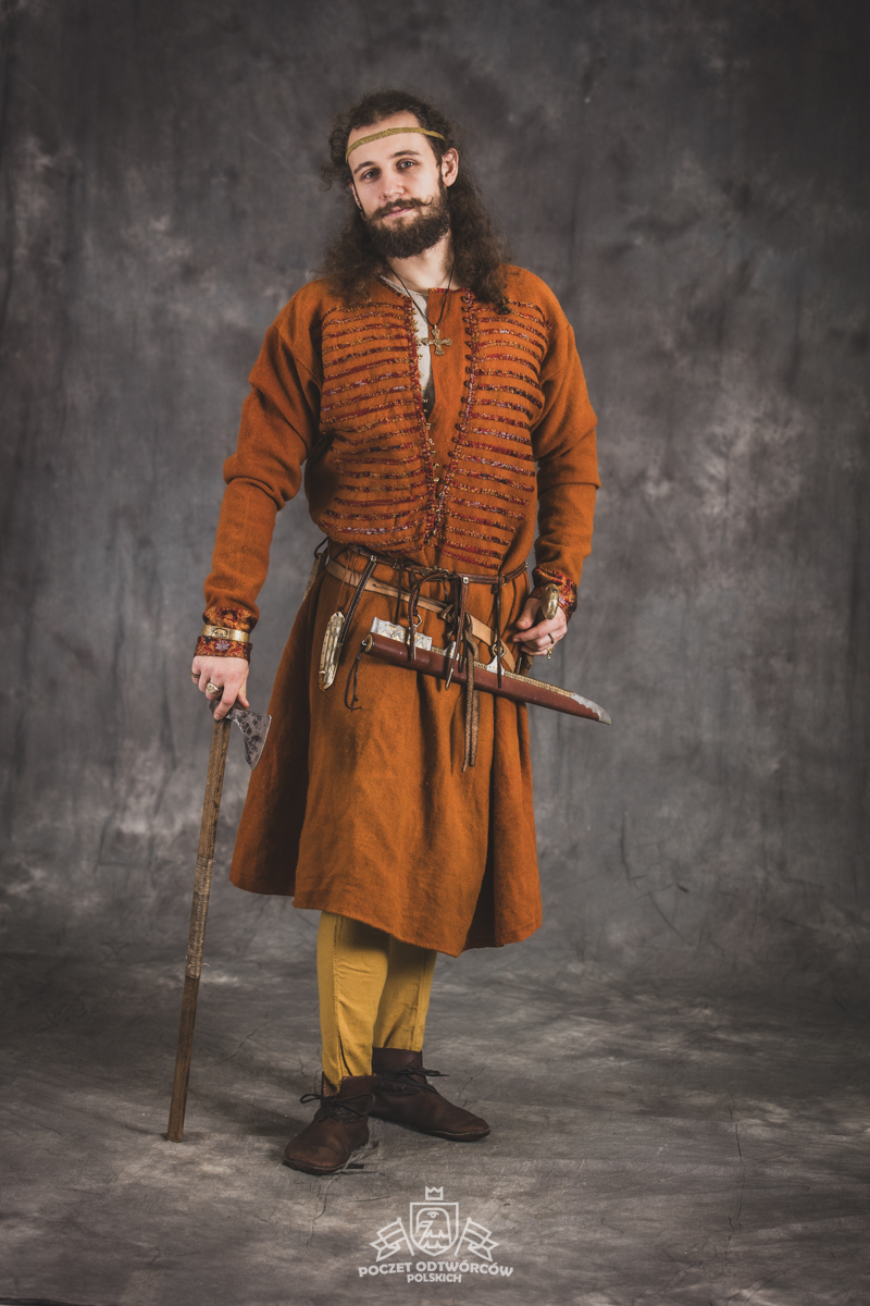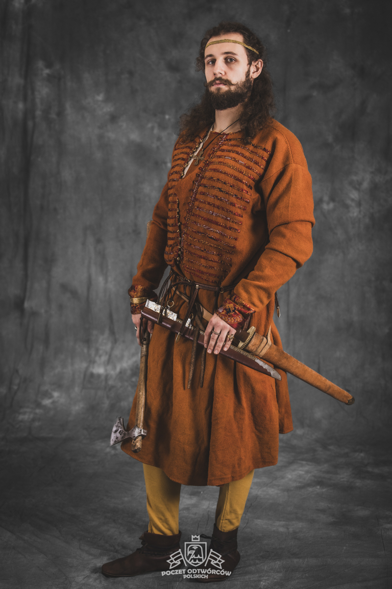 Farbowane na czarno skórzane trzewiki z podkutym obcasem, Na głowie filcowa czapka z wilczym futrem. Wełniana świta z jedwabną lamówką i razgaworami (szamerunki przy zapięciach) z jedwabiu z Bahram Guhr inspirowany znaleziskami stroju z Pskowa. Krajka z zielonego jedwabiu i złotej nici na podstawie znaleziska z pochówku nr. 5 z Szestowicy. Krzyż na szyi wzorowany na znaleziskach z Kijowa, Podhorców i Pskowa. Pas, grzebień i guzy na podstawie znalezisk z pochówka nr 42 w Szestowicy. Skramasaks, jak również pierścienie ze zwijanego brązowego drutu wykonany na podstawie znalezisk z tego samego grodu. Wełniane żółte nogawice z zielonymi sznurkami w charakterze podwiązek. Buty odwzorowują znalezisko z centrum Kijowa. W dłoni toporek w formie spotykanej na terenach całej Rusi. Miecz, również wykonany wraz z pochwą i trzewikiem na podstawie znaleziska z kurhanu nr. 42, jest typowym orężem kultury skandynawskiej z trzewikiem przedstawiającym Odyna i kruki na czubku pochwy.