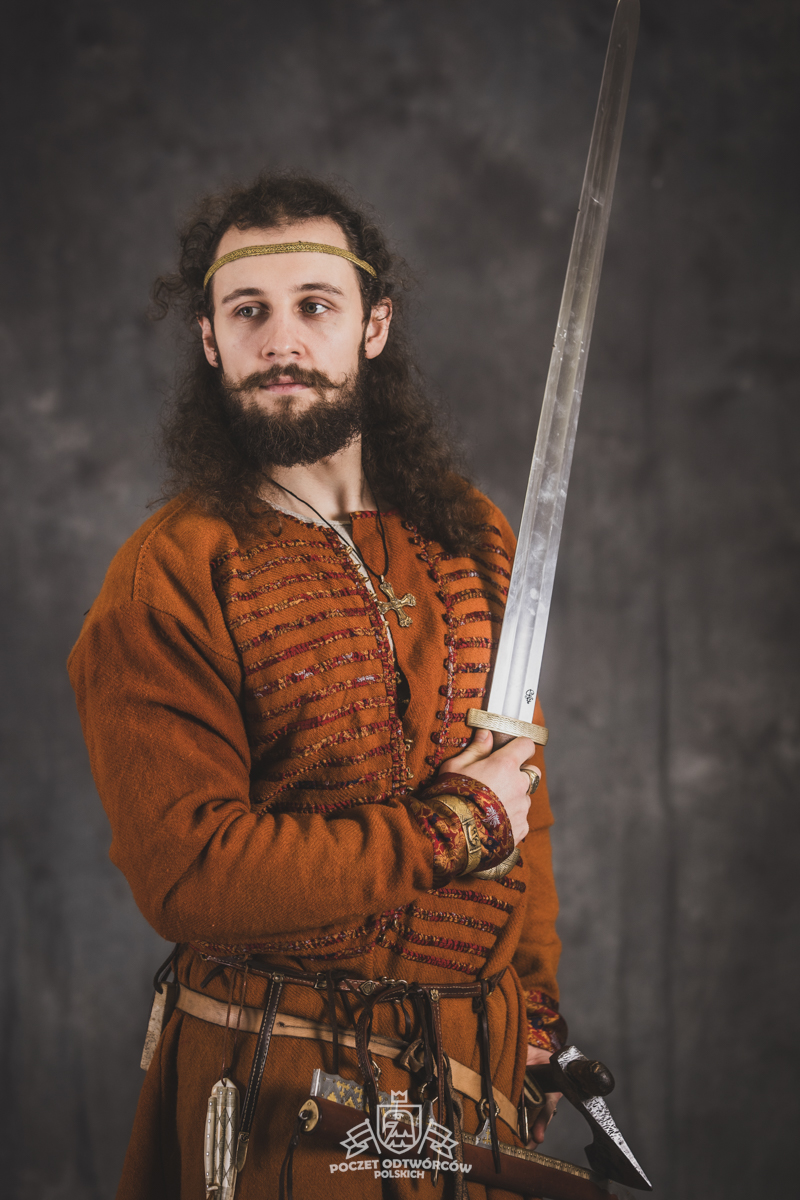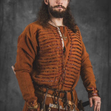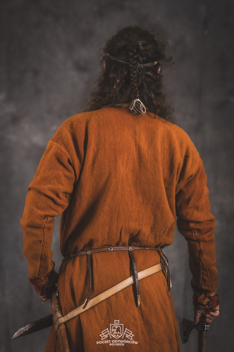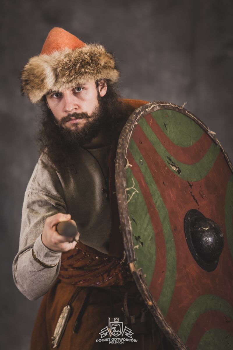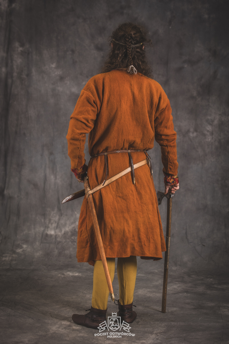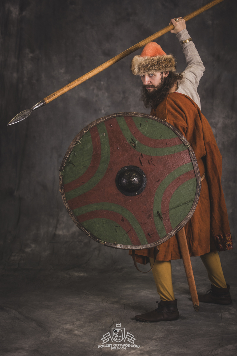 Farbowane na czarno skórzane trzewiki z podkutym obcasem, Na głowie filcowa czapka z wilczym futrem. Wełniana świta z jedwabną lamówką i razgaworami (szamerunki przy zapięciach) z jedwabiu z Bahram Guhr inspirowany znaleziskami stroju z Pskowa. Krajka z zielonego jedwabiu i złotej nici na podstawie znaleziska z pochówku nr. 5 z Szestowicy. Krzyż na szyi wzorowany na znaleziskach z Kijowa, Podhorców i Pskowa. Pas, grzebień i guzy na podstawie znalezisk z pochówka nr 42 w Szestowicy. Skramasaks, jak również pierścienie ze zwijanego brązowego drutu wykonany na podstawie znalezisk z tego samego grodu. Wełniane żółte nogawice z zielonymi sznurkami w charakterze podwiązek. Buty odwzorowują znalezisko z centrum Kijowa. W dłoni toporek w formie spotykanej na terenach całej Rusi. Miecz, również wykonany wraz z pochwą i trzewikiem na podstawie znaleziska z kurhanu nr. 42, jest typowym orężem kultury skandynawskiej z trzewikiem przedstawiającym Odyna i kruki na czubku pochwy.