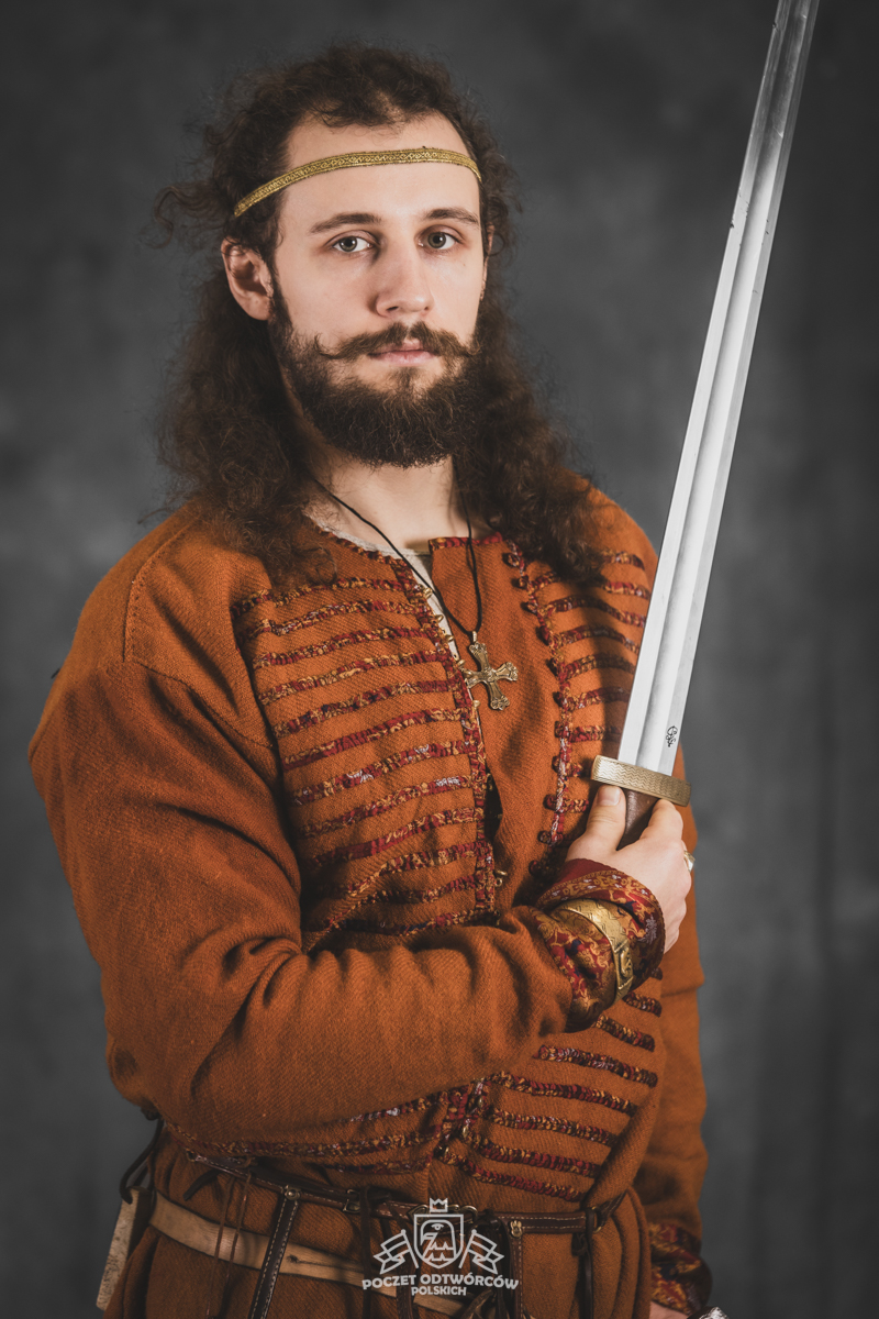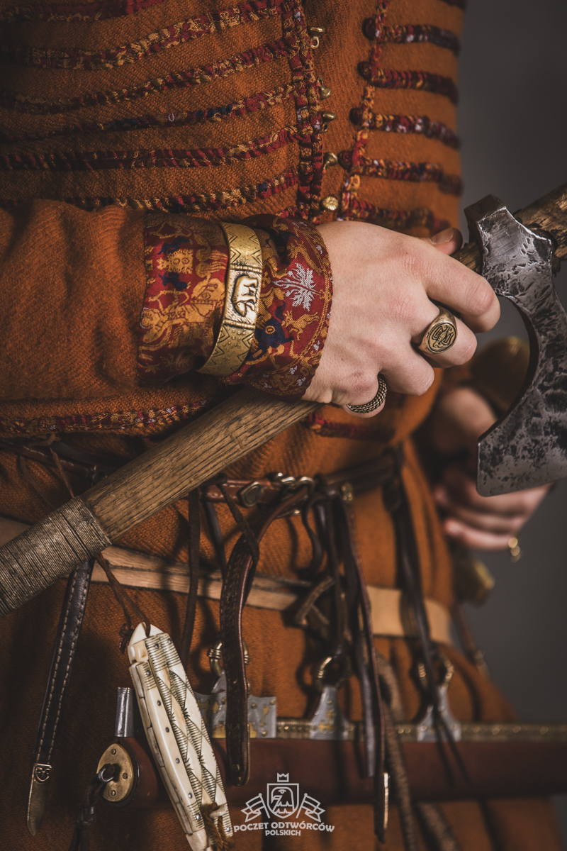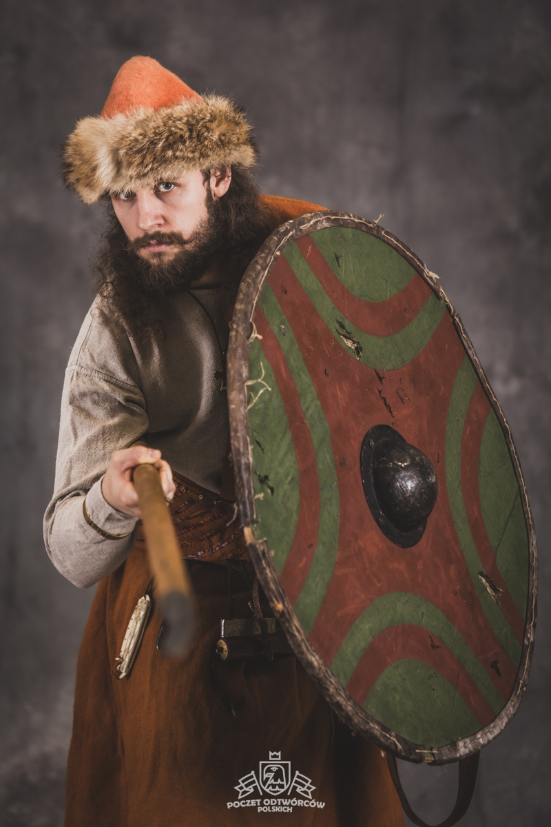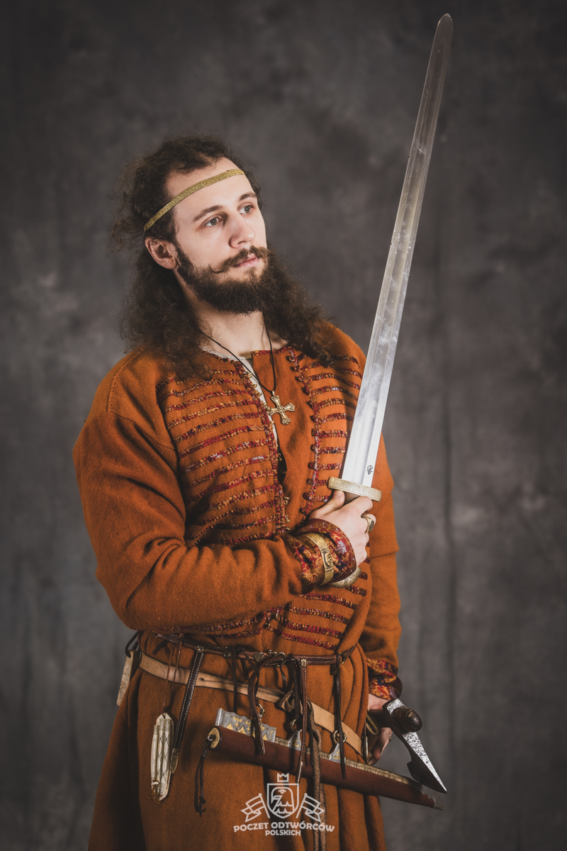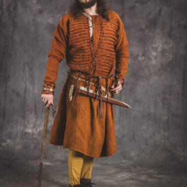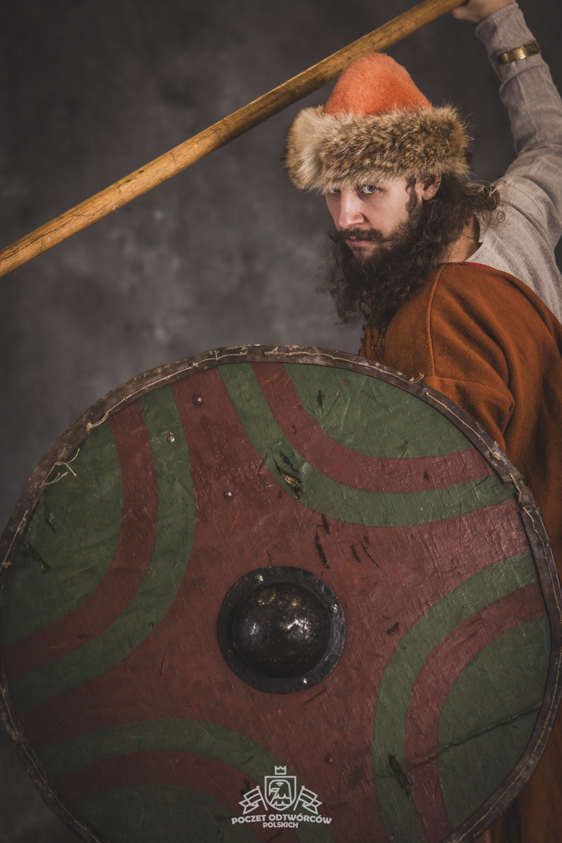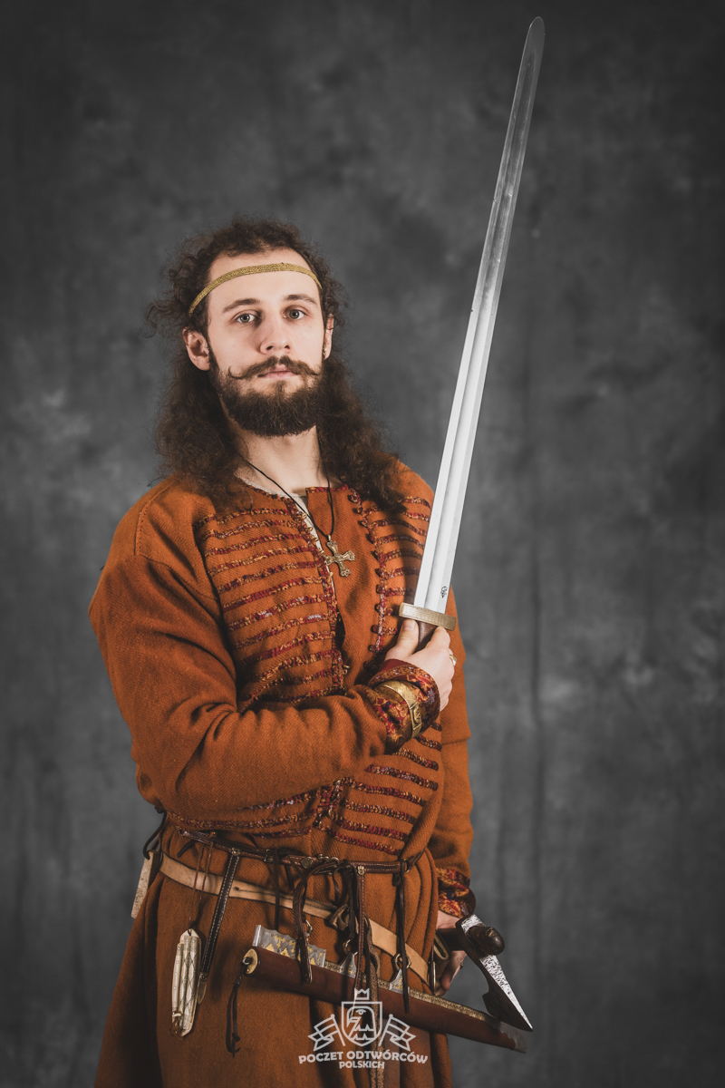 Farbowane na czarno skórzane trzewiki z podkutym obcasem, Na głowie filcowa czapka z wilczym futrem. Wełniana świta z jedwabną lamówką i razgaworami (szamerunki przy zapięciach) z jedwabiu z Bahram Guhr inspirowany znaleziskami stroju z Pskowa. Krajka z zielonego jedwabiu i złotej nici na podstawie znaleziska z pochówku nr. 5 z Szestowicy. Krzyż na szyi wzorowany na znaleziskach z Kijowa, Podhorców i Pskowa. Pas, grzebień i guzy na podstawie znalezisk z pochówka nr 42 w Szestowicy. Skramasaks, jak również pierścienie ze zwijanego brązowego drutu wykonany na podstawie znalezisk z tego samego grodu. Wełniane żółte nogawice z zielonymi sznurkami w charakterze podwiązek. Buty odwzorowują znalezisko z centrum Kijowa. W dłoni toporek w formie spotykanej na terenach całej Rusi. Miecz, również wykonany wraz z pochwą i trzewikiem na podstawie znaleziska z kurhanu nr. 42, jest typowym orężem kultury skandynawskiej z trzewikiem przedstawiającym Odyna i kruki na czubku pochwy.